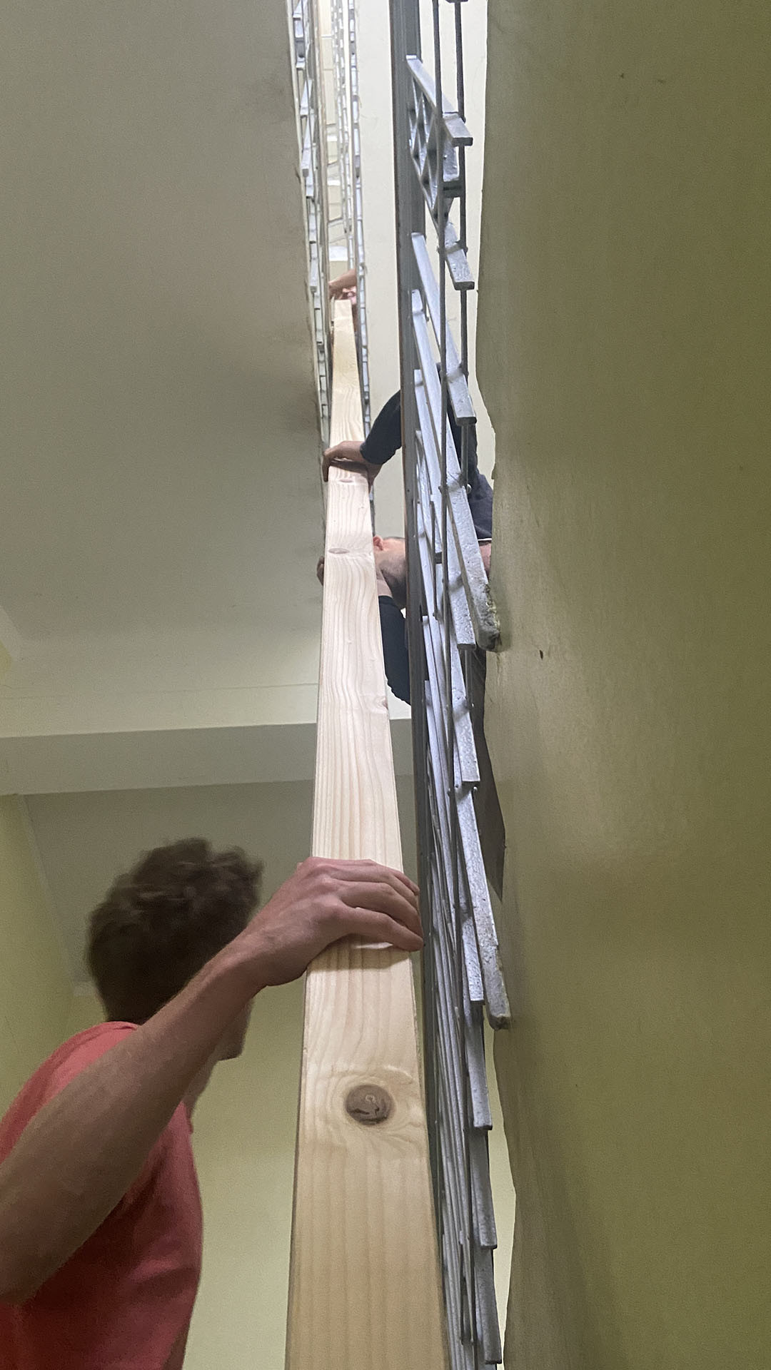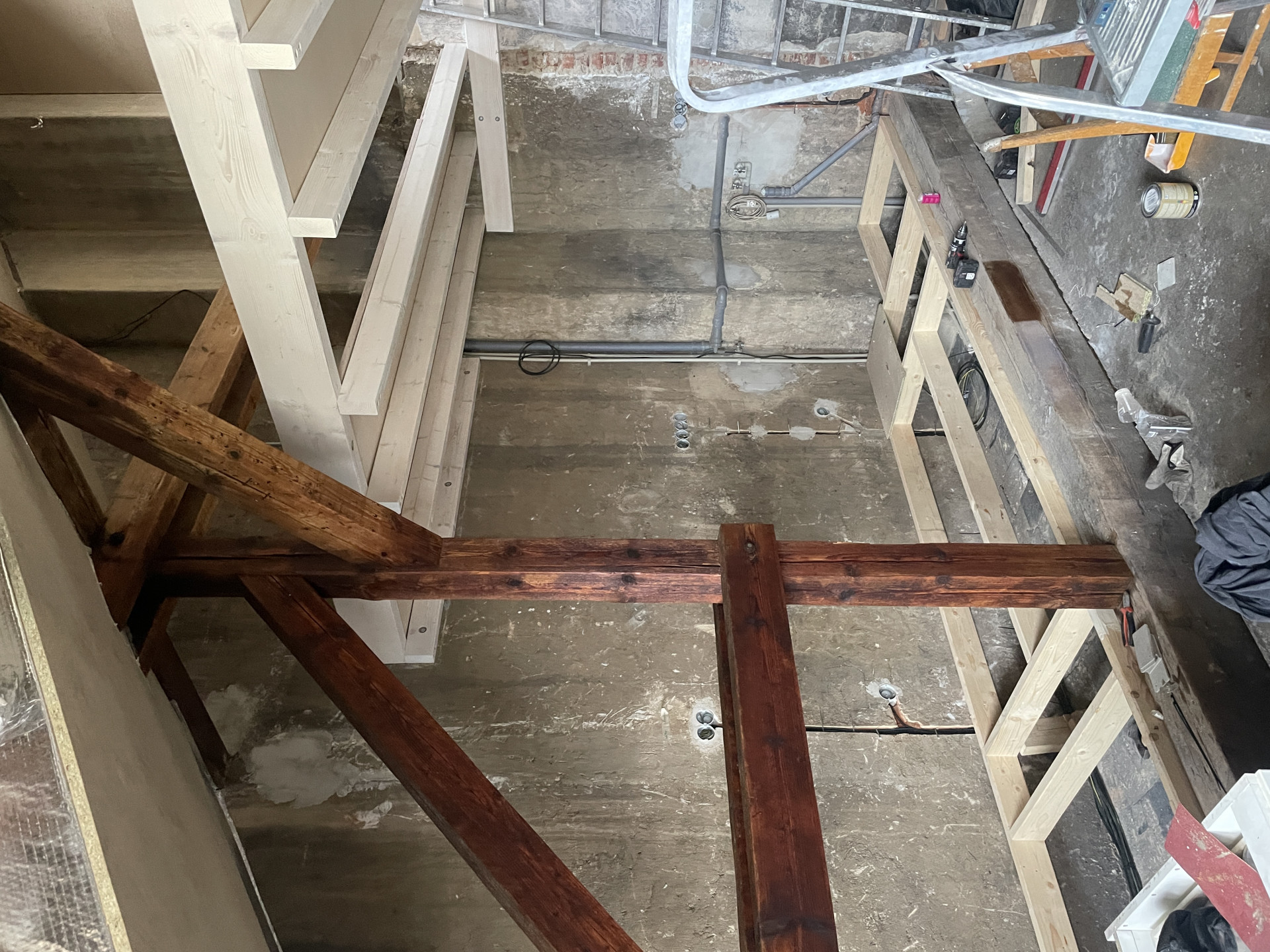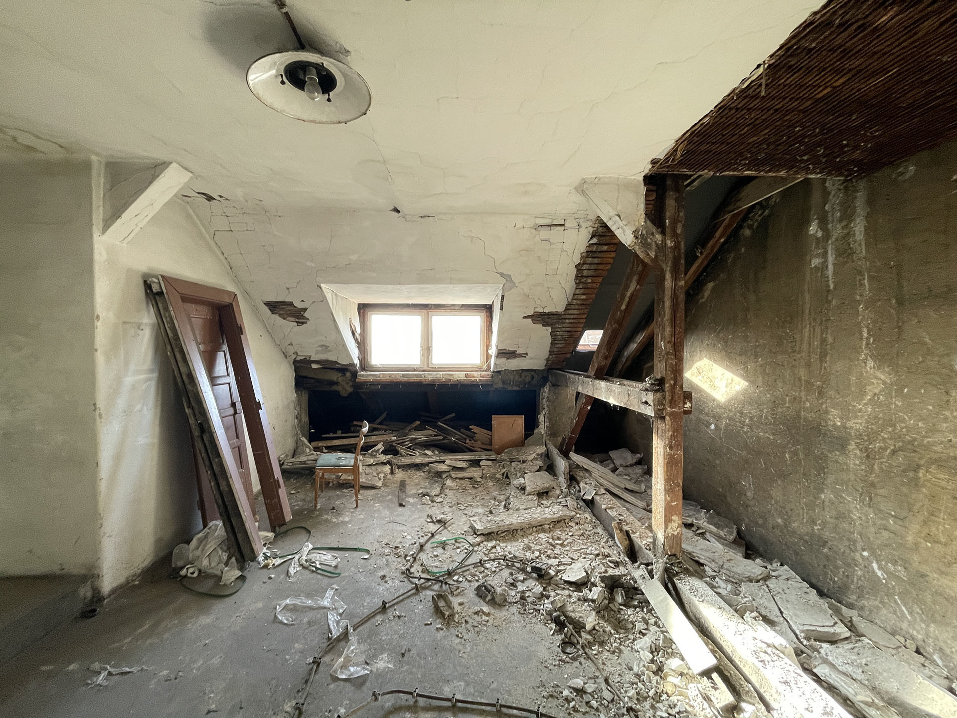 Kuchyně a světlo jsou ovšem jednotlivosti, největším zásahem se stalo vybudování mezipatra, je zavěšené do původního krovu a architekti říkají, že co možná nejcitlivěji. Jelikož je ateliér v šestém patře a nahoru nevede výtah, muselo se postavit z toho, co šlo nahoru vynést vlastníma rukama. Pro konstrukci se zvolily se dřevěné trámy, podlaha je z březové překližky. Rozdíly mezi starým krovem a novým mezipatrem finálně podtrhla povrchová úprava – nové dřevo dostalo bílou olejovou lazuru, zatímco to staré nesoucí střechu se ošetřilo lněnou fermeží.