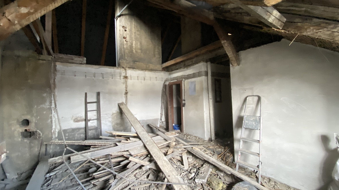 Zrekonstruovaný prostor pod střechou používá architekt vystupující pod značkou svého studia totalbrutal. Zůstala v něm původní hrubá omítka, místy stále vykukují vyzdívky z pálených cihel. Podkroví bylo po léta nevyužívané, staré společné prádelny v bytových domech už nikde moc nefungují, všichni si perou ve vlastním. „Protože bytové družstvo nedisponovalo energií a finančními prostředky potřebnými k rekonstrukci prostoru, nabídli jsme rekonstrukci na vlastní náklady a následné užívání prostoru formou obydlení,“ vysvětlují situaci autoři. Celá rekonstrukce je ve výsledku přišla na 480 tisíc, plus přibliženě 800 hodin vlastní práce.