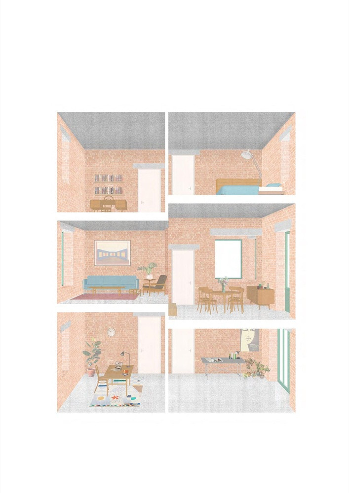 Pro konstrukci domu využili architekti červené lícové cihly většího formátu, které ponechali přiznané v exteriéru i interiéru. V interiéru tak cihly vytvářejí „puristickou“ atmosféru. Všechna tři patra pak propojuje nápadné zelené schodiště.
