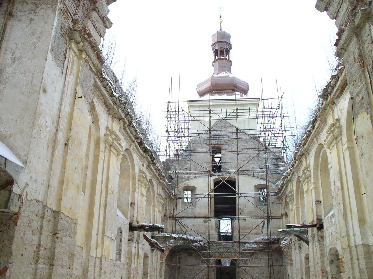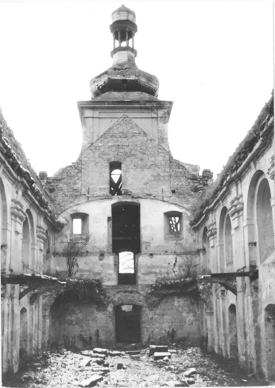 Pohled z presbytáře k hlavnímu vchodu s torzem nosné konstrukce kůru, 1989