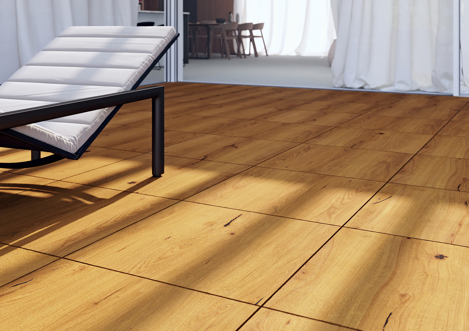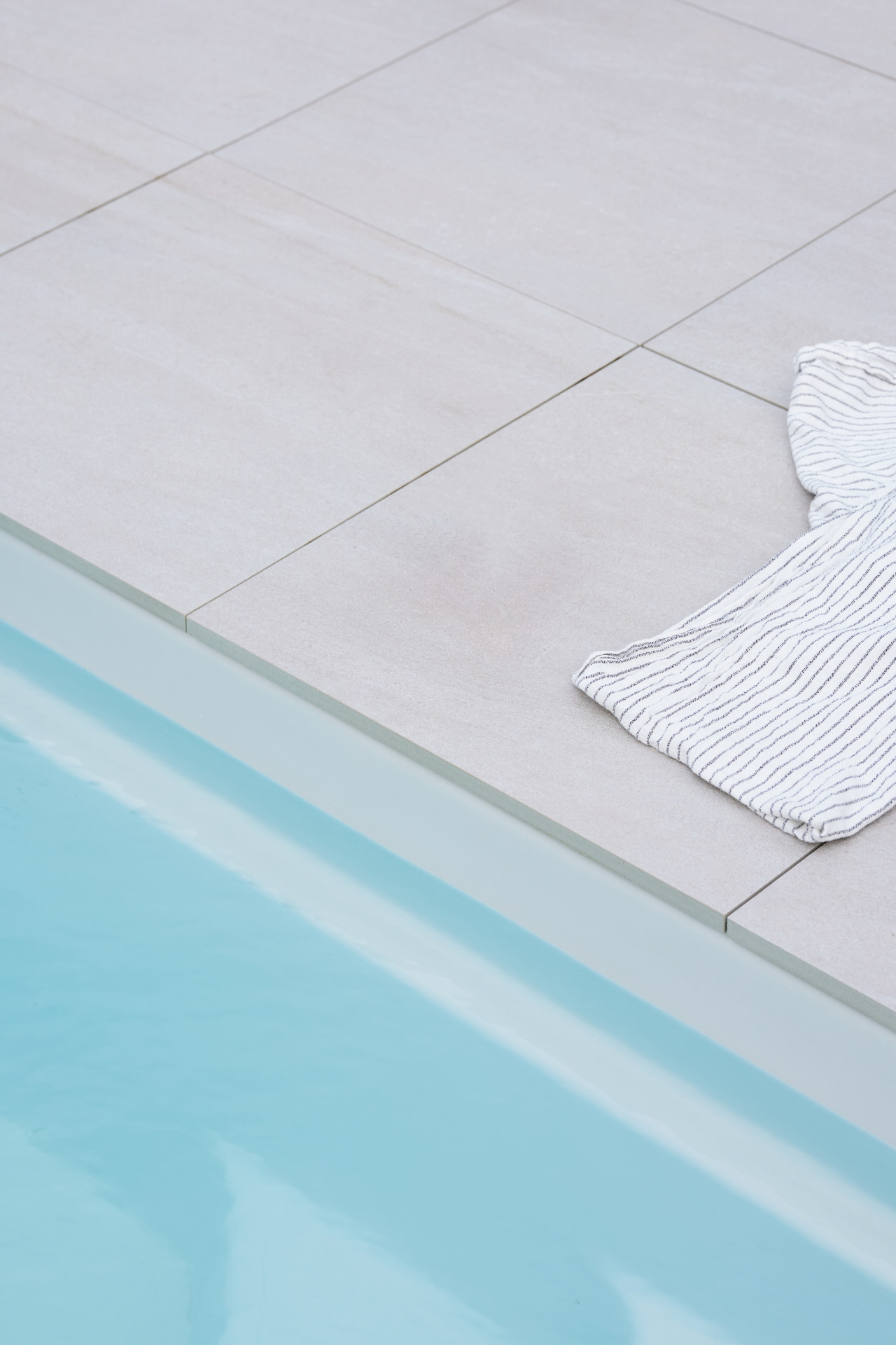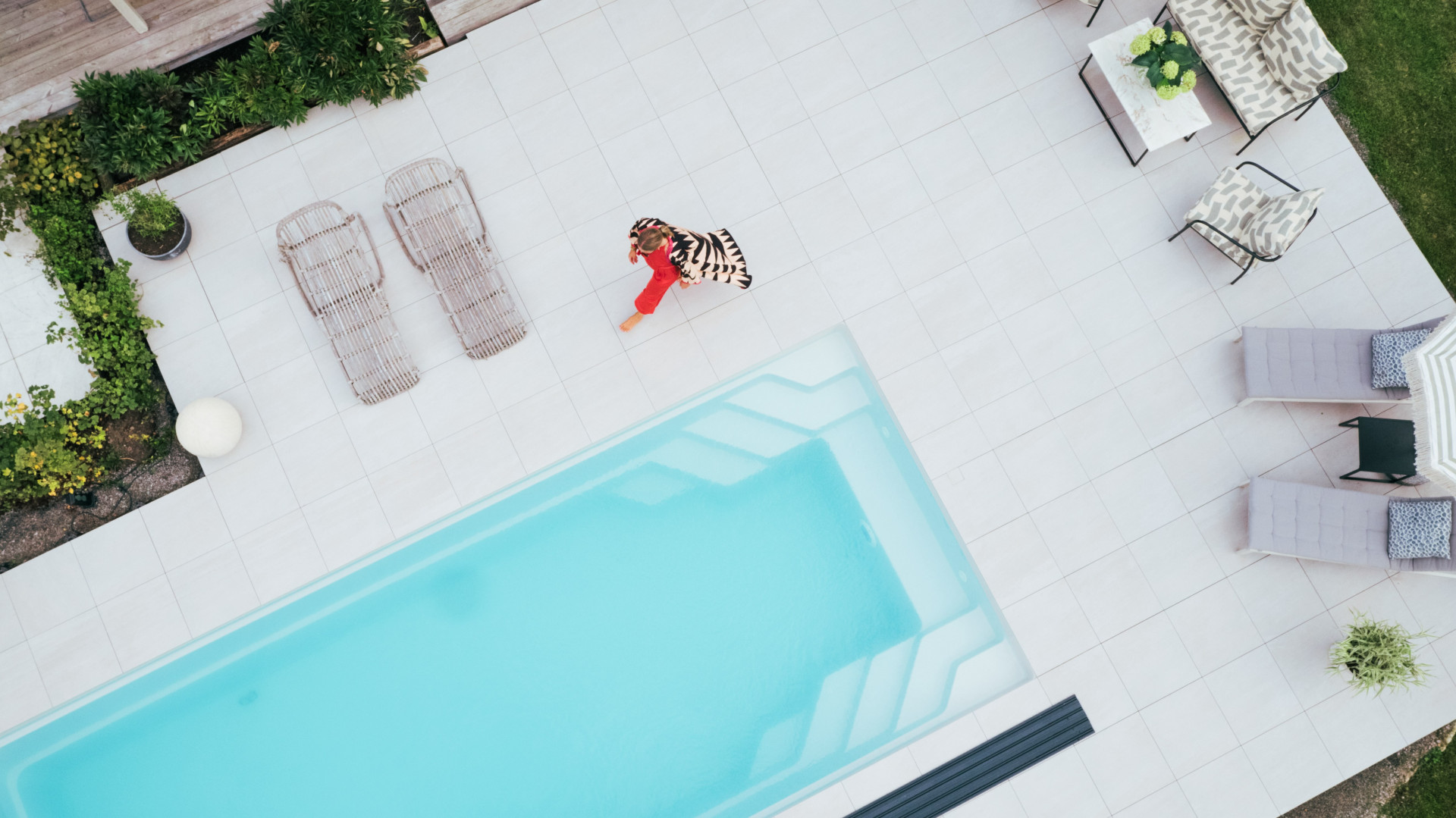 Plocha o rozloze 100 metrů čtverečních kolem nového rodinného bazénu se měla stát místem, kde lidé rádi tráví společný čas. Světle šedá bazénová nádrž byla zcela zapuštěna do země. Při výběru dlaždic bylo proto důležité, aby barevně ladily a vytvářely harmonický celkový vzhled. Keramické obklady a jejich barevné provedení měly novému obytnému prostoru dodat samostatný charakter, ale zároveň splynout se stávající strukturou terasy, verandy a zahrady.