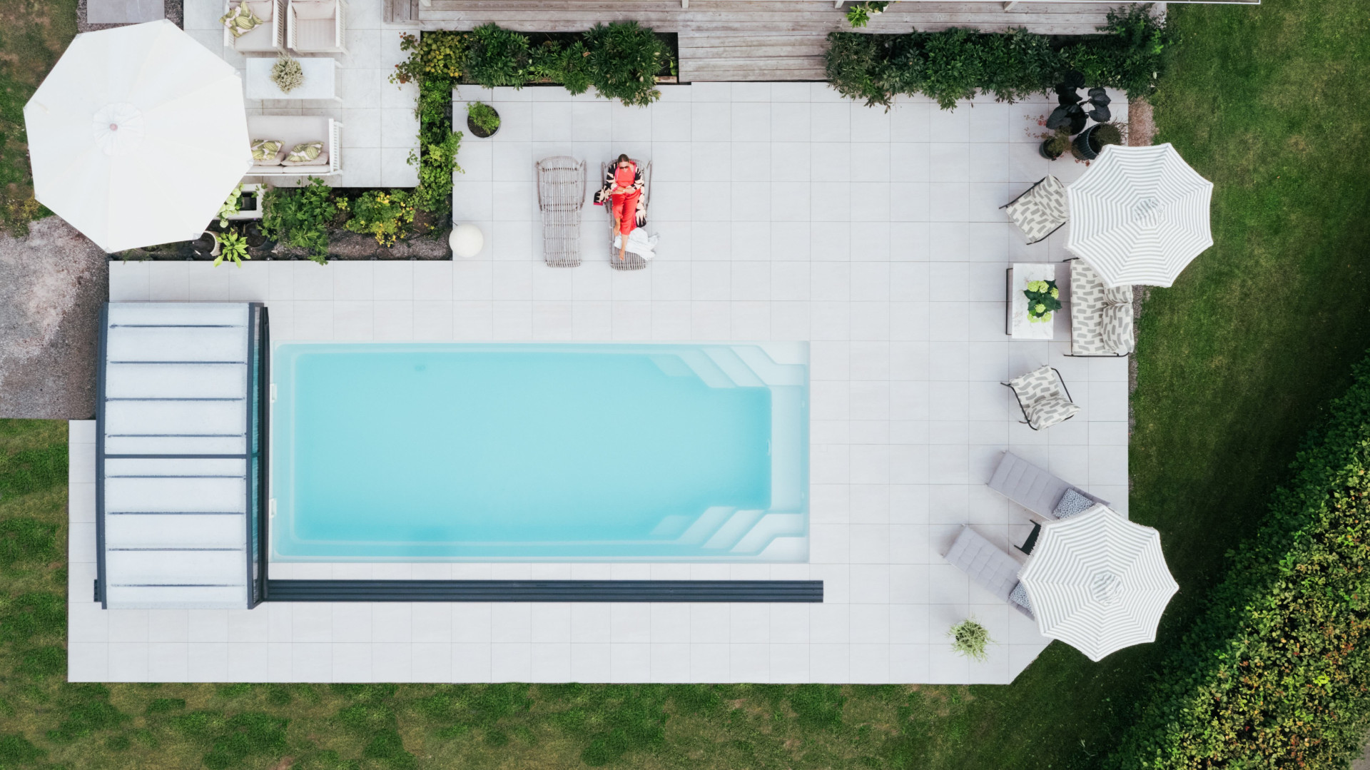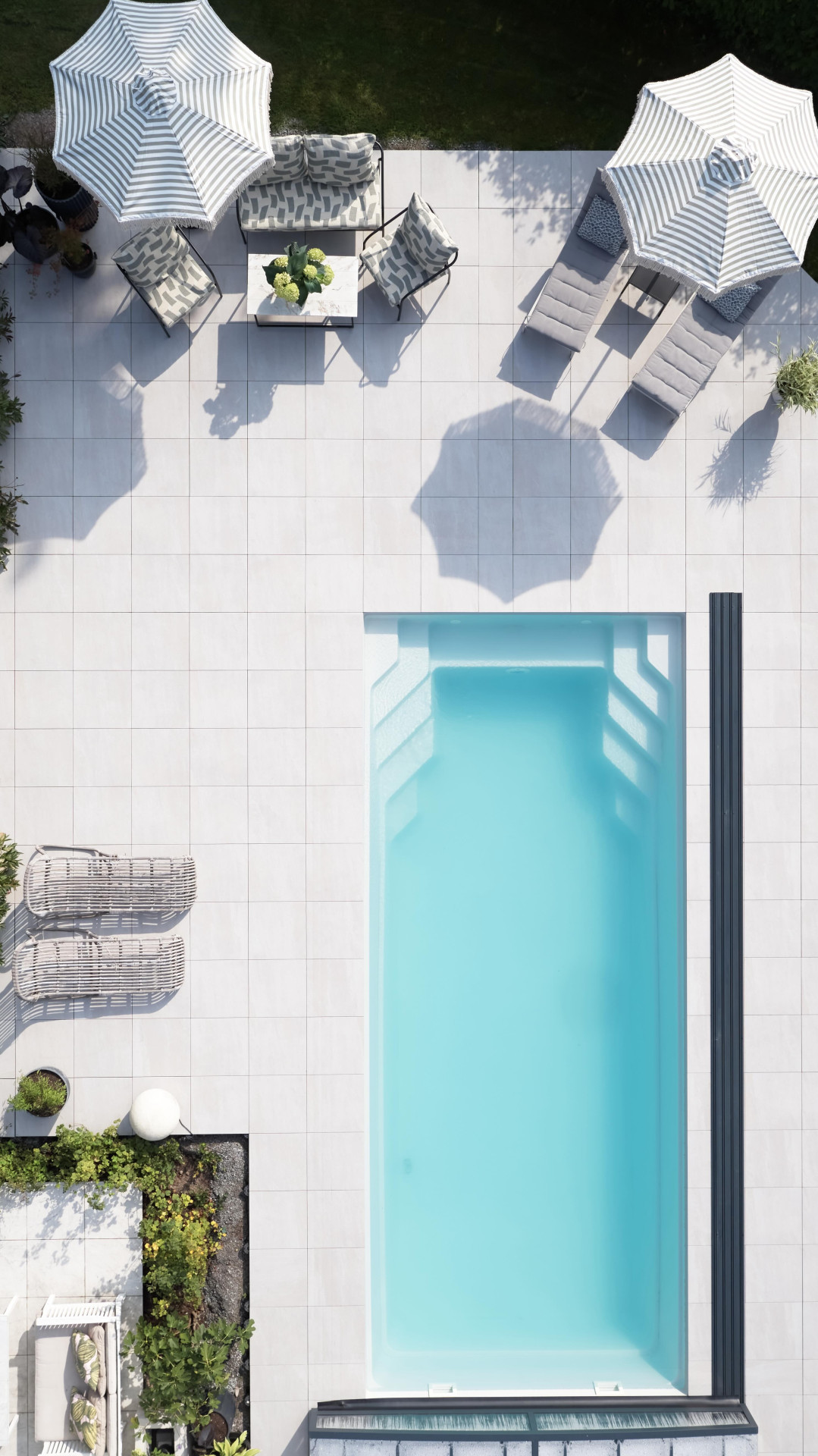 Interiérová designérka Jeanette neponechala nic náhodě a vytvořila vlastní nákresy a vizualizace, aby viděla, jak bazén doplní terasu u domu a přilehlou zahradu. Majitelka Jeanette: „Byli jsme tehdy trochu nervózní: Jak vysoký má být bazén vzhledem k okolí? A vejde se tam vůbec? Ale teď, když se ohlédneme zpět, máme z toho obzvlášť dobrý pocit, protože jsme část práce udělali sami.“