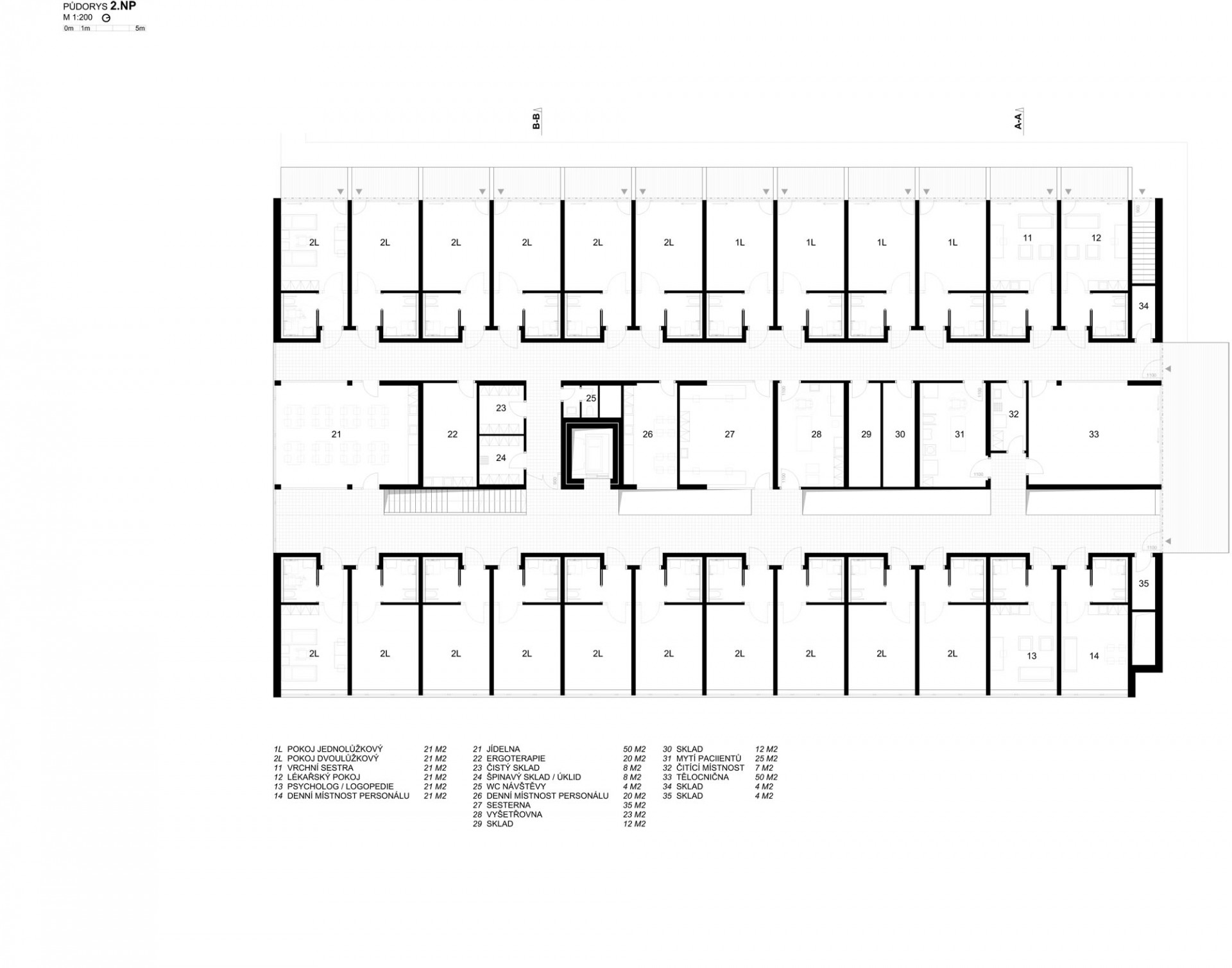 Celé 2. nadzemní podlaží zaujímá lůžková část rozdělená na dvě oddělení se společným zázemím ve středovém traktu. Třetí ustupující podlaží pak obsahuje samostatně přístupný úsek velké tělocvičny, individuální fyzioterapii a zázemí lékařů a zdravotnického personálu. Díky ustoupení a výraznému prosklení podlaží vznikly individuální terasy umožňující propojení exteriéru s interiérem.