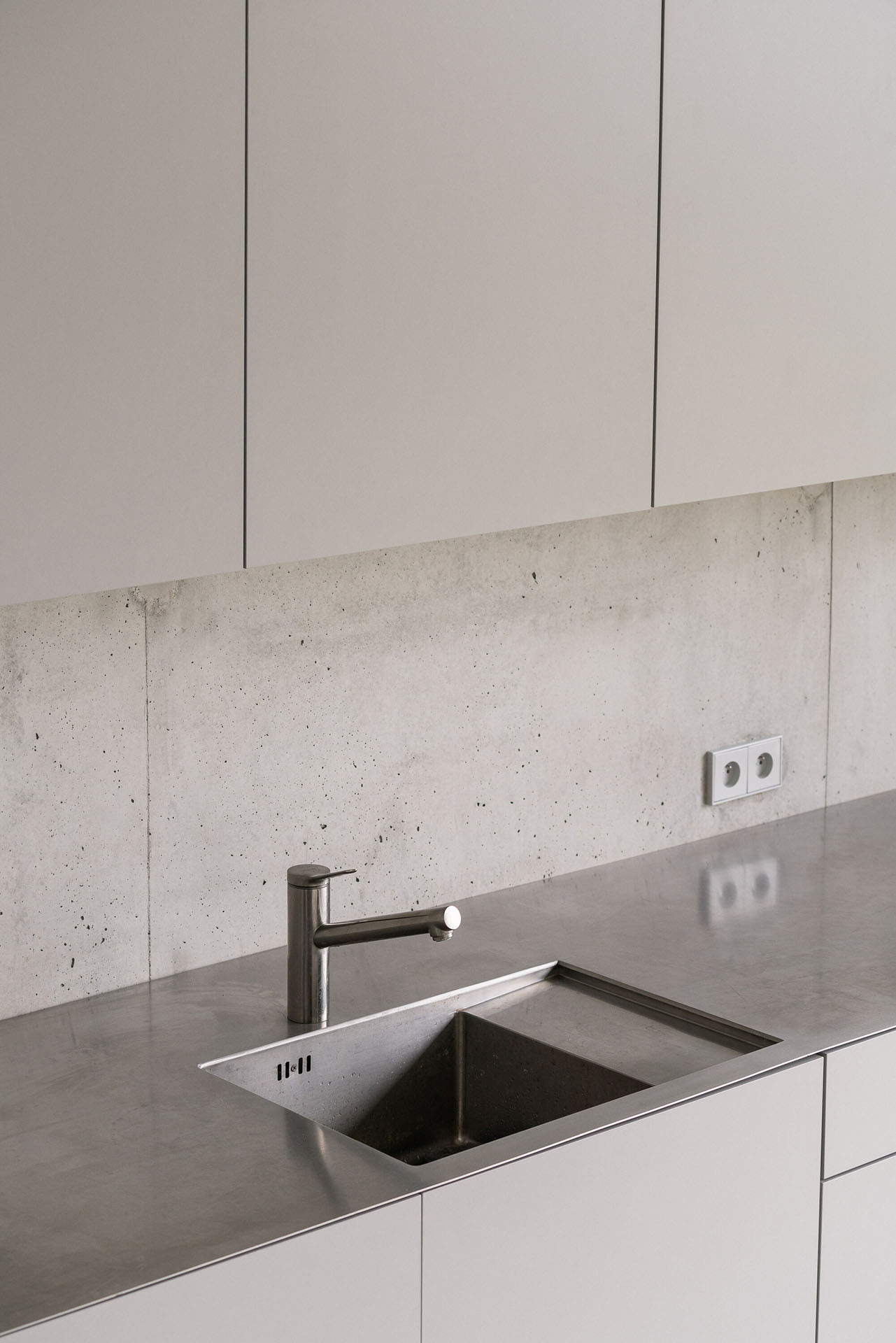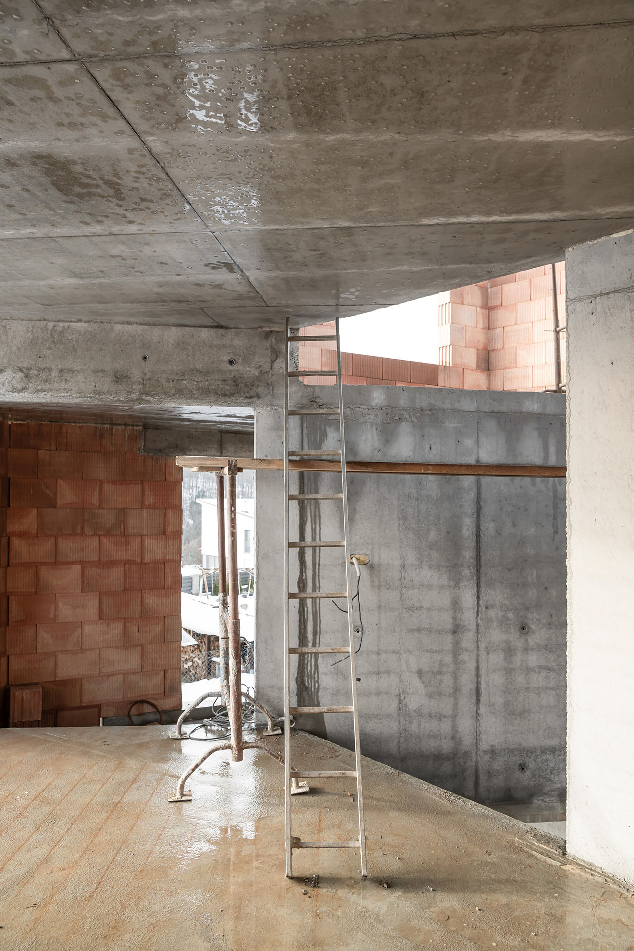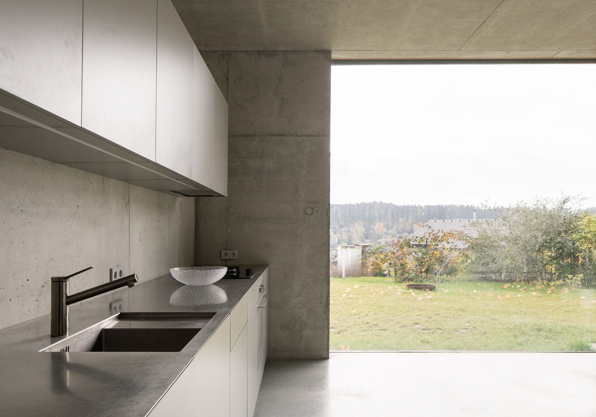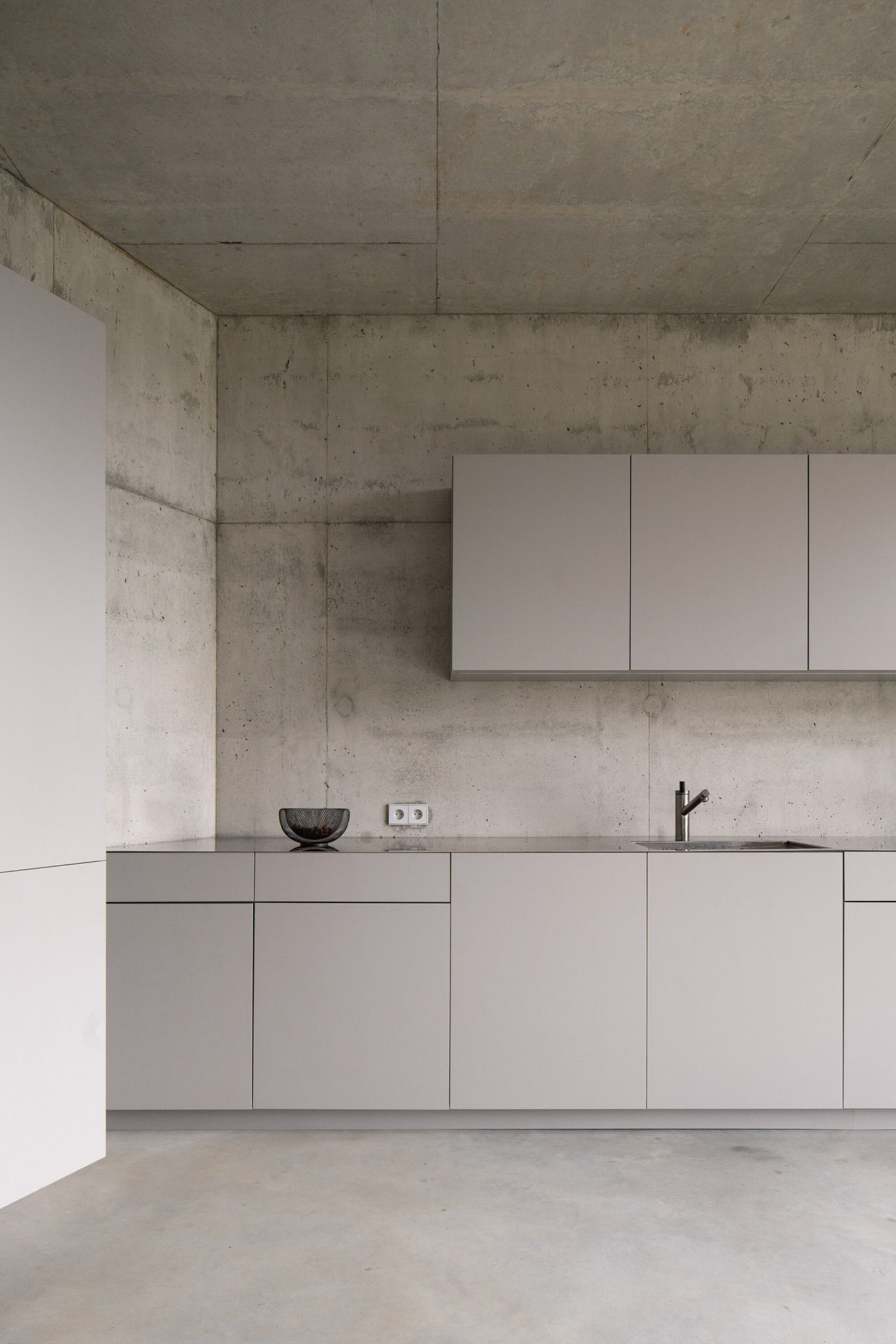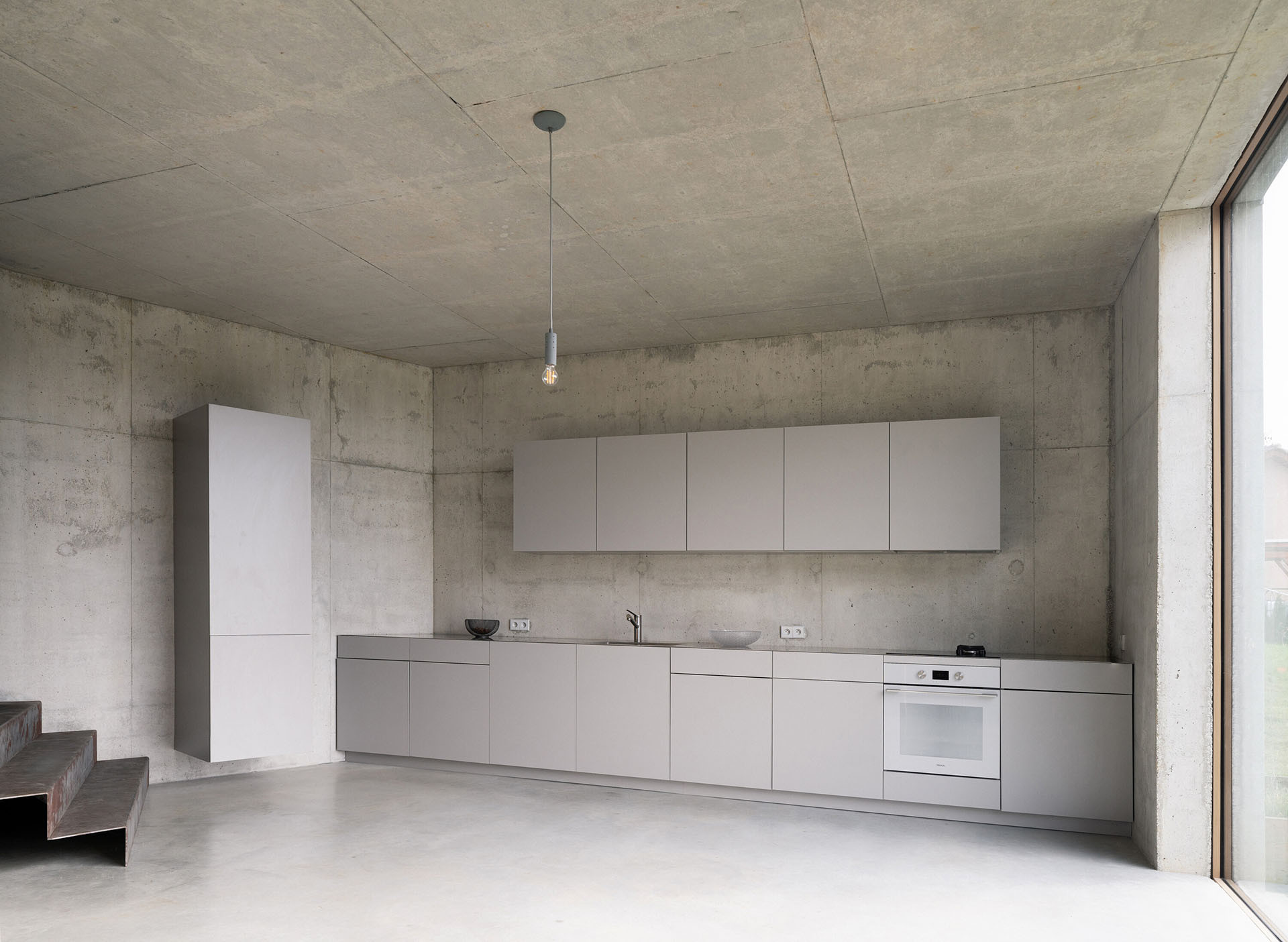 Po příchodu do interiéru rodinného domu je asi překvapivá volba materiálu a barevnosti interiéru. Celý vnitřní prostor je šedý, navržen v neutrálních barvách a velmi minimalisticky. Betonové zdi, světlá kuchyně a kovové schodiště. Útulnost sem má vnést světlo, výhledy ven a také barvitý život mladé rodiny. „Kombinace betonových povrchů s proměnlivým denním osvětlením z různých úhlů vytváří unikátní hru světla a stínu, která dodává interiéru hloubku a živost,“ dodávají architekti.