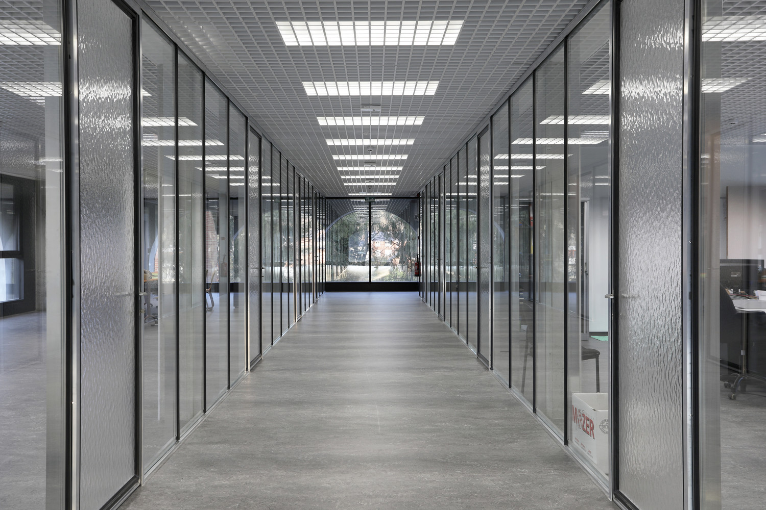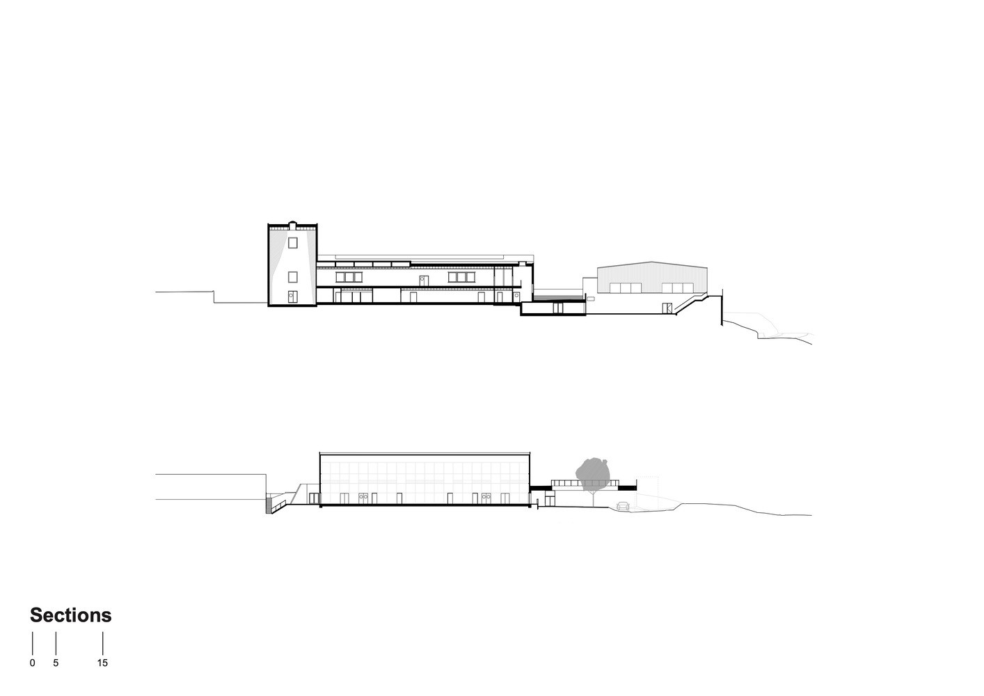 V areálu najdeme ještě jednu novou budovu. Poznáme ji podle dřevěné konstrukce, která se z interiéru propisuje až na fasádu. Dřevěné trámy a sloupy jsou zde modulově řazeny do pravidelného rastru. Budova funguje na podobných principech jako její sousedka.