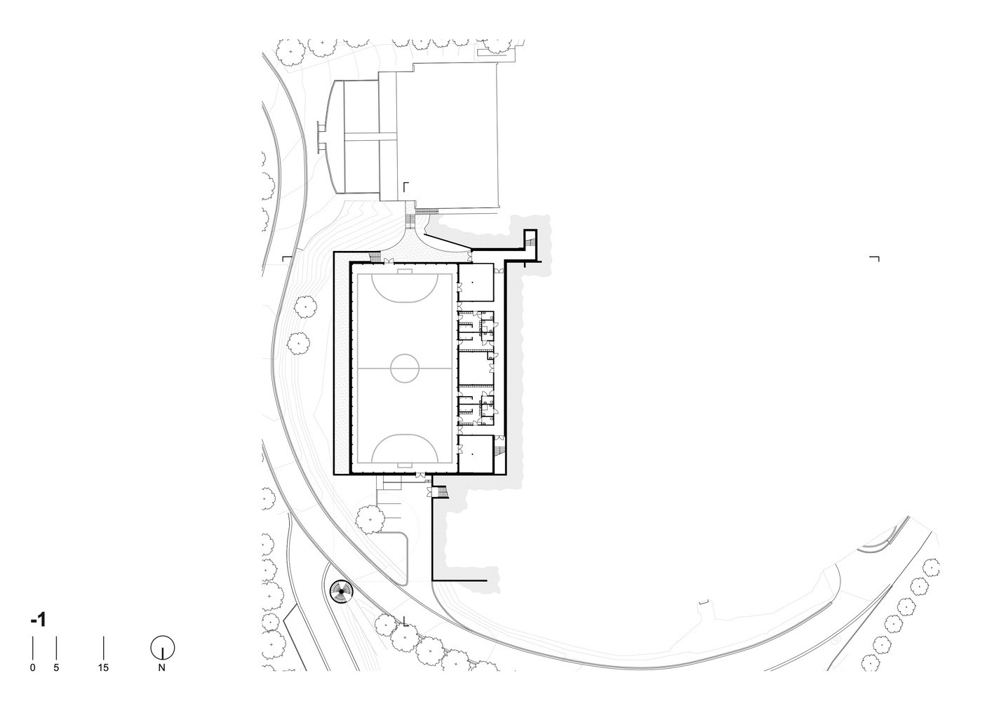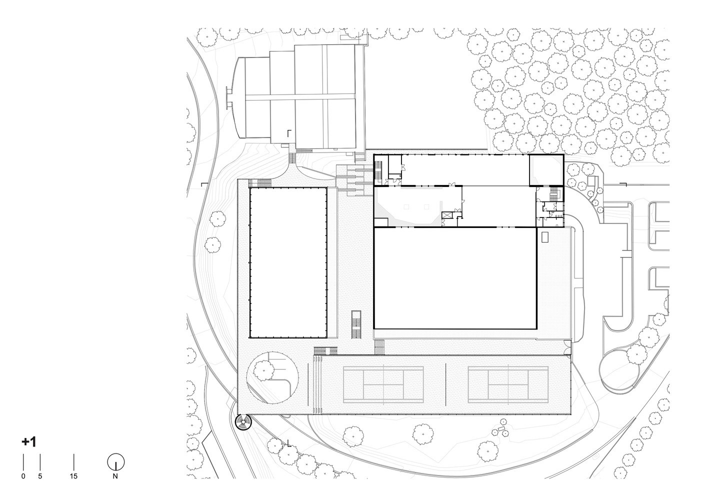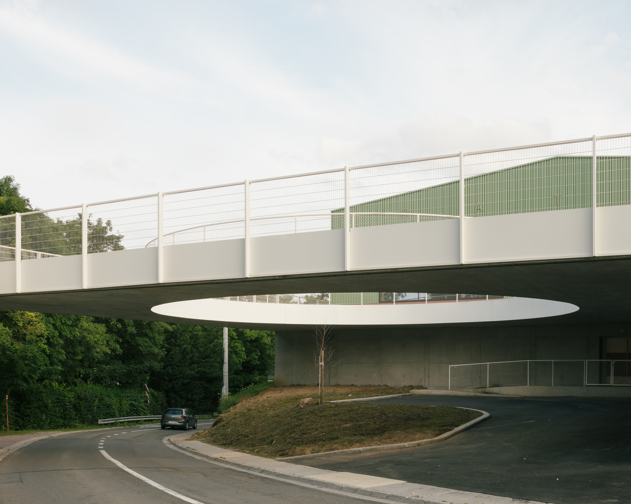 Pokud byste se chtěli podívat i do druhé části sportovního areálu, musíte překonat zmiňovanou silnici. Proto se architekti rozhodli do svého projektu zakomponovat betonovou plochu, která sportovcům umožňuje příjemný a bezpečný přechod mezi sportovišti. Betonová podesta se vznáší nad silnicí a je ozvláštněna kruhovou výsečí, skrze kterou mohou návštěvníci sledovat projíždějící vozidla. Díky svažitému terénu je plošina z jedné strany podepřena velkým betonovým válcem s vnitřním schodištěm.