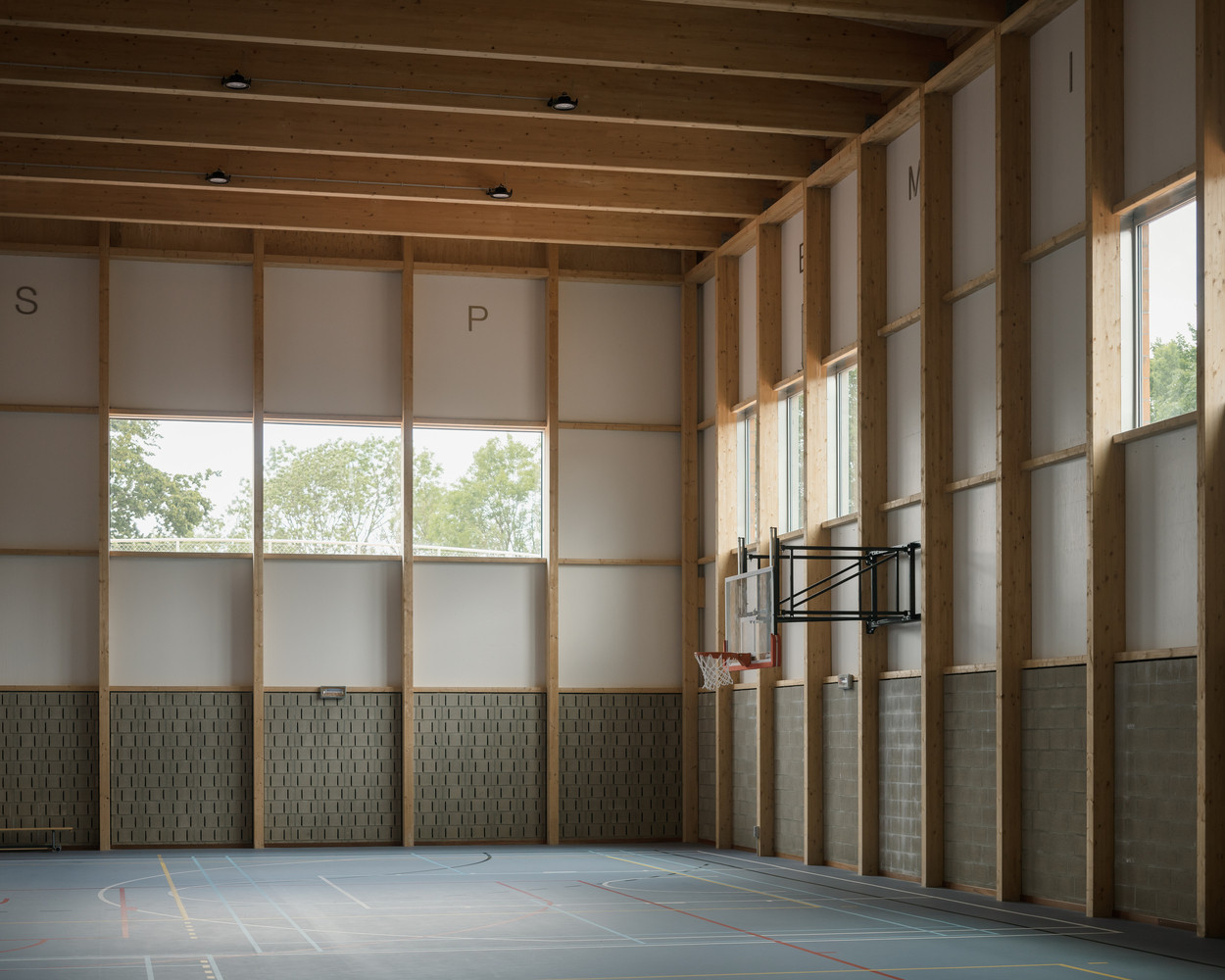 Sportovní komplex provází a scelují cihlové obklady a plochy z vlnitého světle zeleného plechu. Jednotlivé fasády budov pokračují v dialogu díky uměleckému zásahu antverpského konceptuálního umělce Adriena Tirtiauxe, který fasády doplnil různými písmeny. Stačí se párkrát otočit kolem všech budov a můžete si je spojit do několika vět či říkanek.
