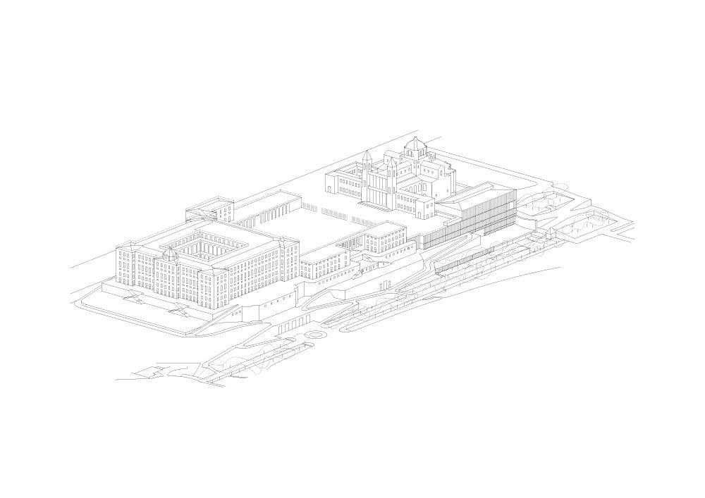 Z městského hlediska je projekt založen na dvou principech: budova kolekcí by na jednu stranu měla být součástí napůl umělé, napůl přírodní krajiny západní části Madridu, na stranu druhou bylo třeba, aby si hradní nádvoří (La Almulena) zachovalo svou otevřenou, veřejnou povahu a novostavba nestála v cestě pohledům z parků a zahrad v západní části města. Nová kolekce jakožto neobydlený prázdný prostor, vymezený svými vlastními zdmi, se coby lineární struktura pokouší minimalizovat objektivní fyzický i subjektivní dopad na své okolní životní prostředí, tj. na monumentální sokl Královského paláce.
