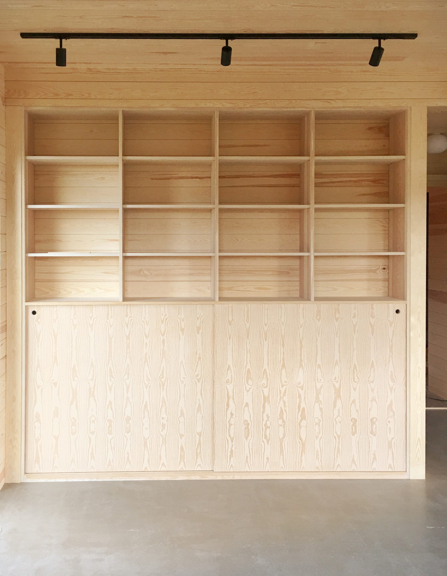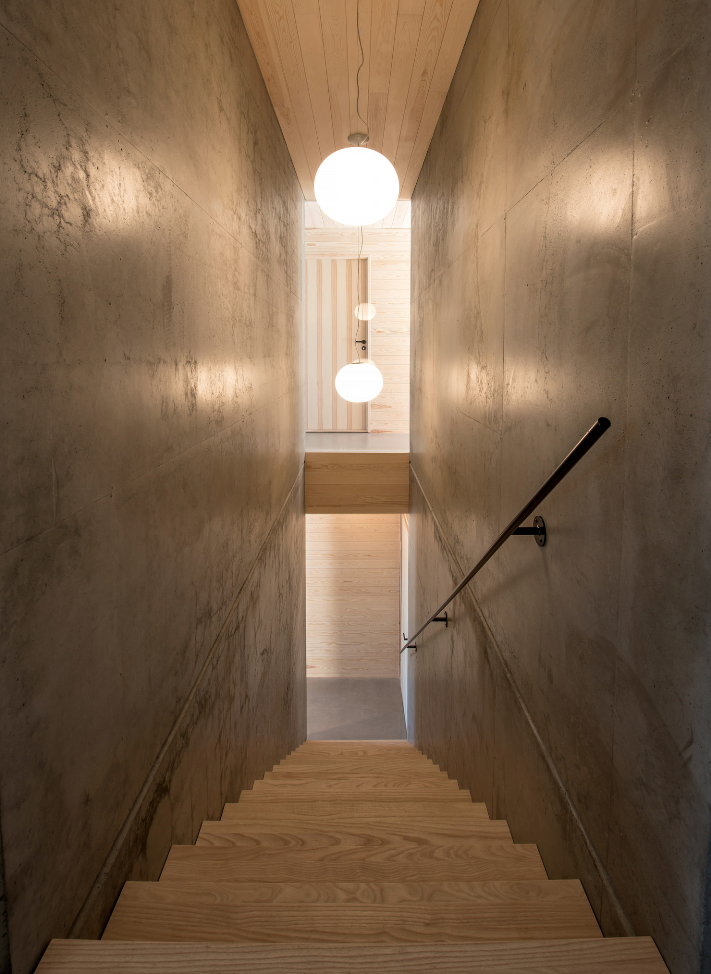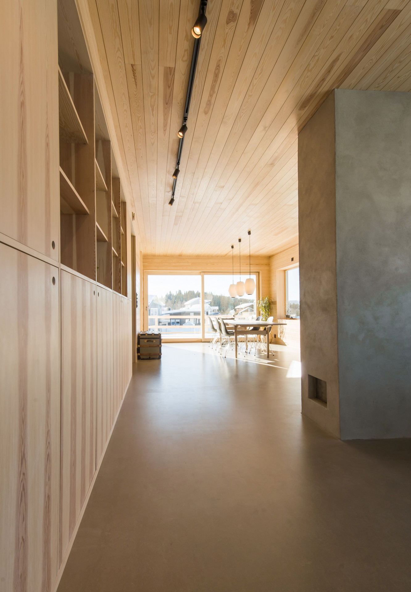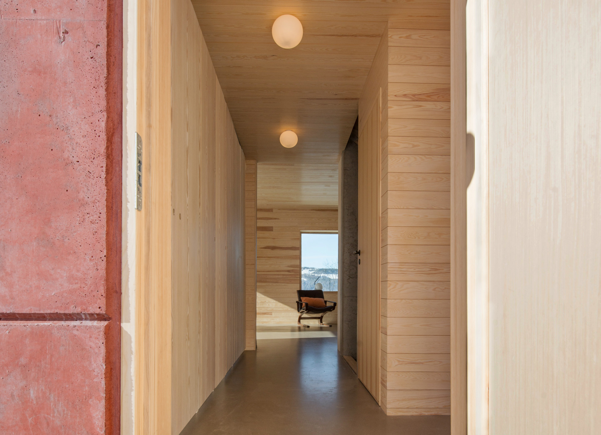 I přes to, že se na podobě interiéru výrazně podíleli sami klienti, je z jeho estetiky jasně patrný rukopis architektů. Stejně jako vnější provedení objektu, také jeho interiér působí jednotně a čistě, na čemž má zásluhu hlavně strohá paleta materiálů. Pohledový beton, který tentokrát již oproti exteriéru zůstal v šedém provedení, se zde potkává s borovým dřevem obkladu stěn a nábytku, oba vyznívají ve své přirozené podobě a vytvářejí decentní pozadí pro život v domě. A už je znovu jen na jeho uživatelích, jak si jej zabydlí a jaký život a atmosféru mu vdechnou.