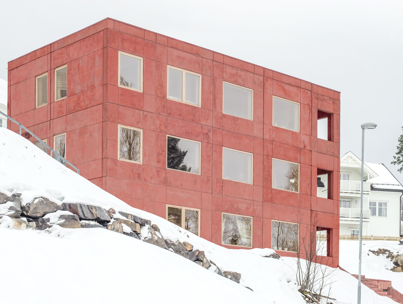 Novostavba od architektů Sanden + Hodnekvam tak na první pohled do Lillehammer vůbec nezapadá. V této dřevěné městské krajině totiž představuje tvarově strohého cizince v minimalistickém plášti s pravidelným rastrem oken a plochou střechou. Stojí na vrchu svažitého pozemku a rozhlíží se odtud do okolí. Zároveň ale také klesá společně s terénem a částečným ukrytím své hmoty pod zem reaguje na jeho převýšení. Náročné podmínky, jimž je dům pod úrovní terénu vystaven, nakonec zásadně ovlivnily i volbu konstrukčního materiálu. Třípodlažní dům tak architekti navrhli z odolného betonu.