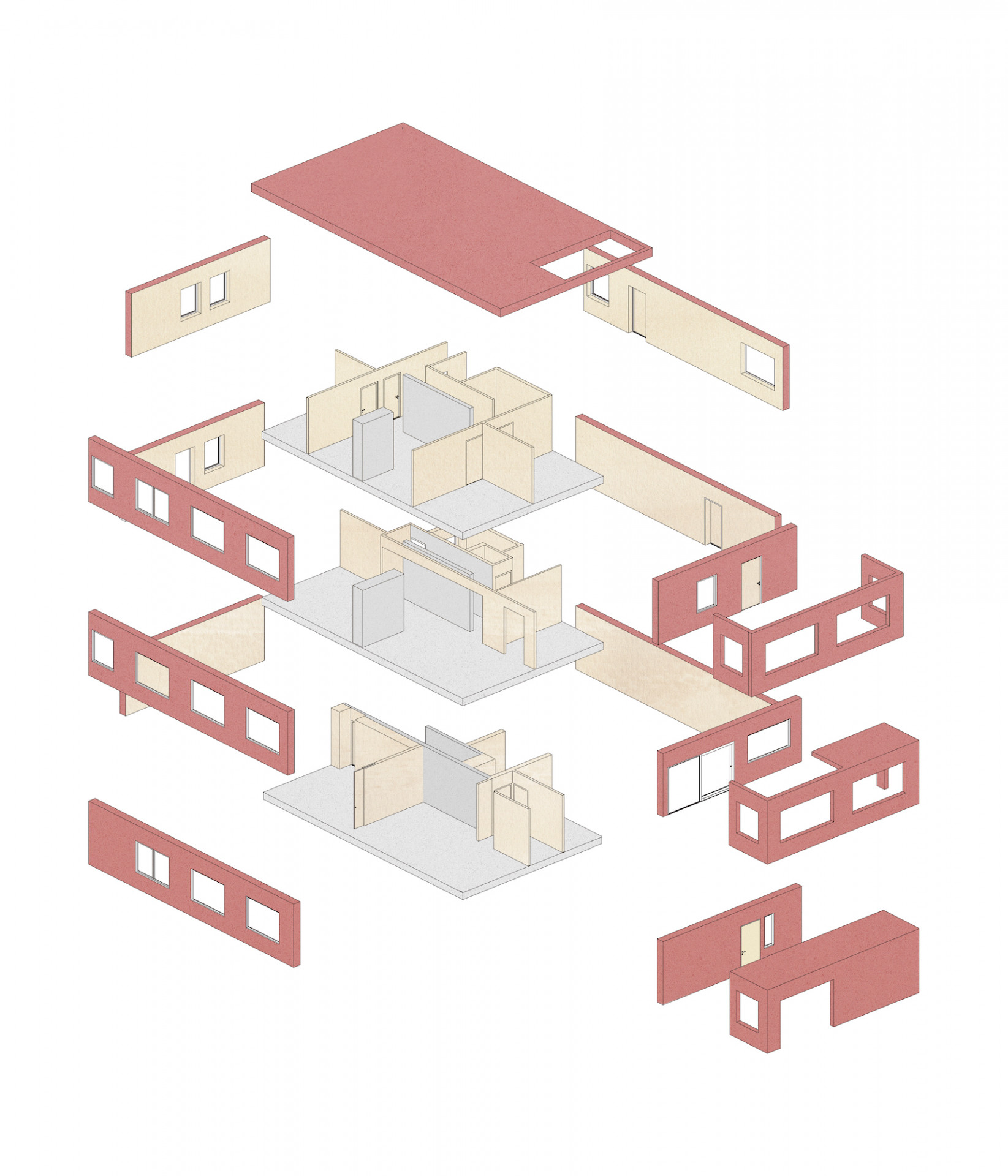 Stavebnice betonových modulů vytváří obálku pro vnitřní prostředí, jehož rozvržení nechali architekti téměř výhradně na samotných klientech. Ti si svépomocí postavili veškeré dělící konstrukce a interiér tak „ušili“ přímo na míru svým představám o životě tří generací pod jednou střechou. Díky tomu, že celou nosnou úlohu plní obvodové stěny společně se stropními deskami, může interiér fungovat variabilním způsobem a jeho dispozici si mohou uživatelé snadno flexibilně přizpůsobit dle svých aktuálních potřeb.