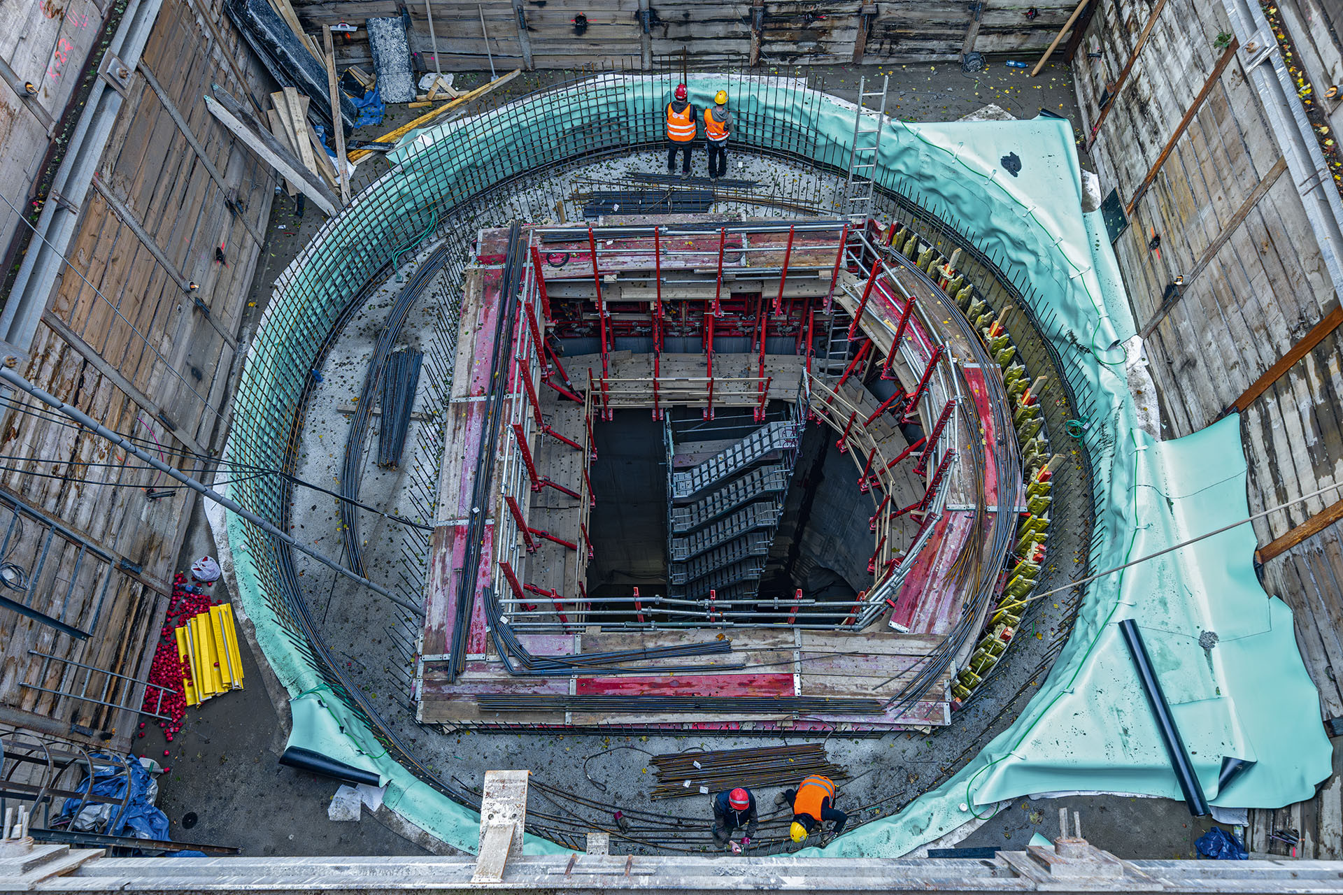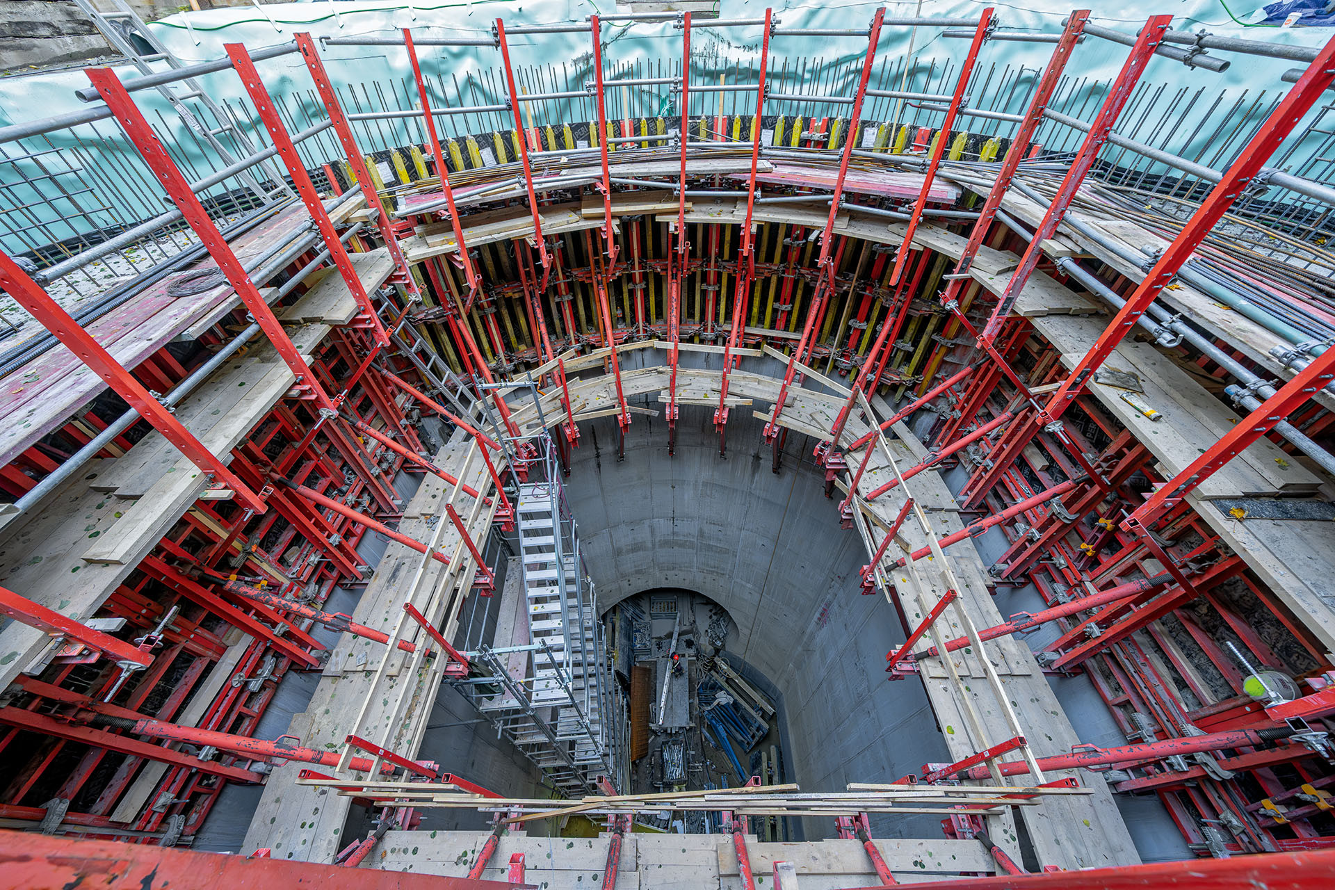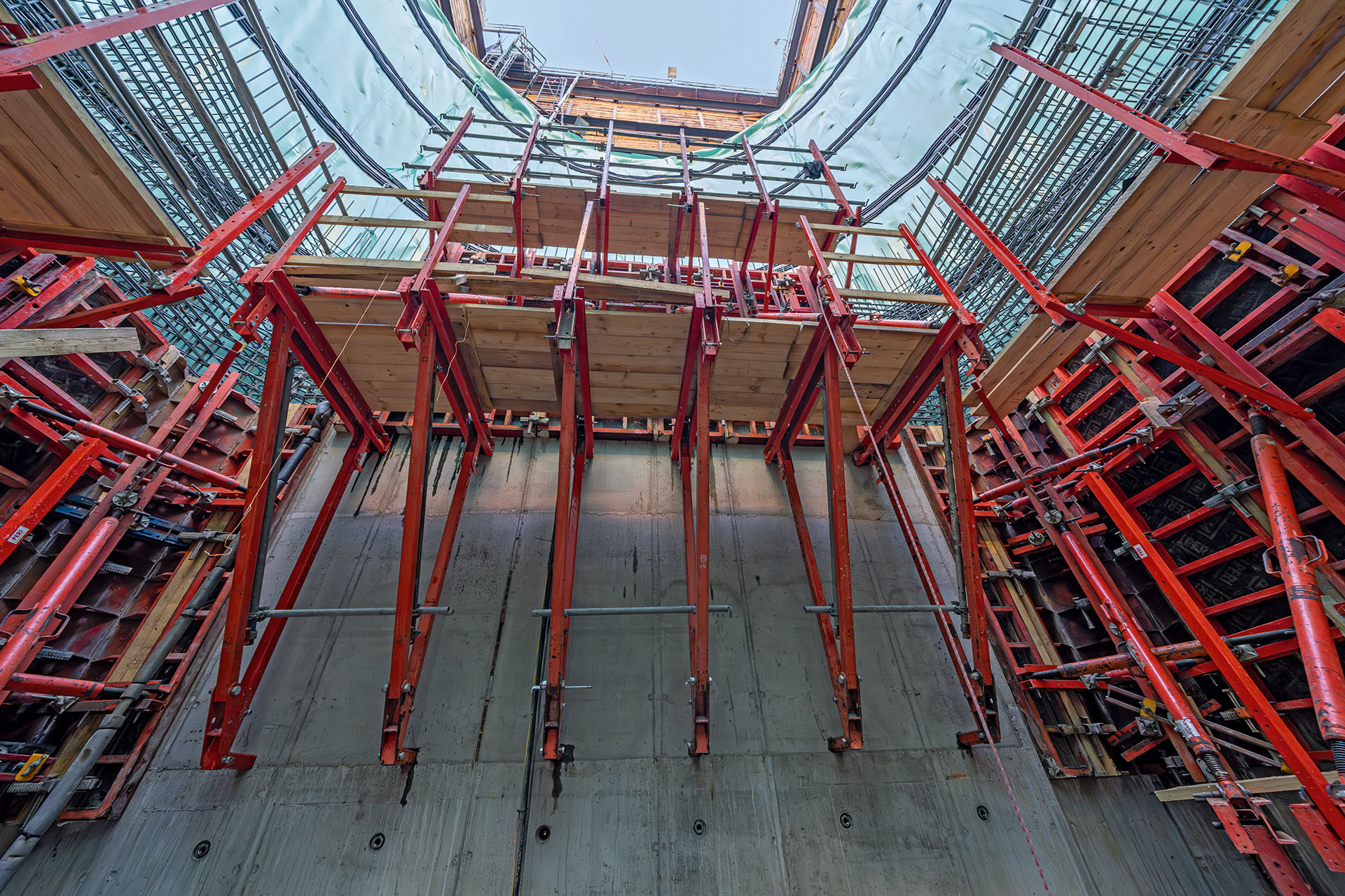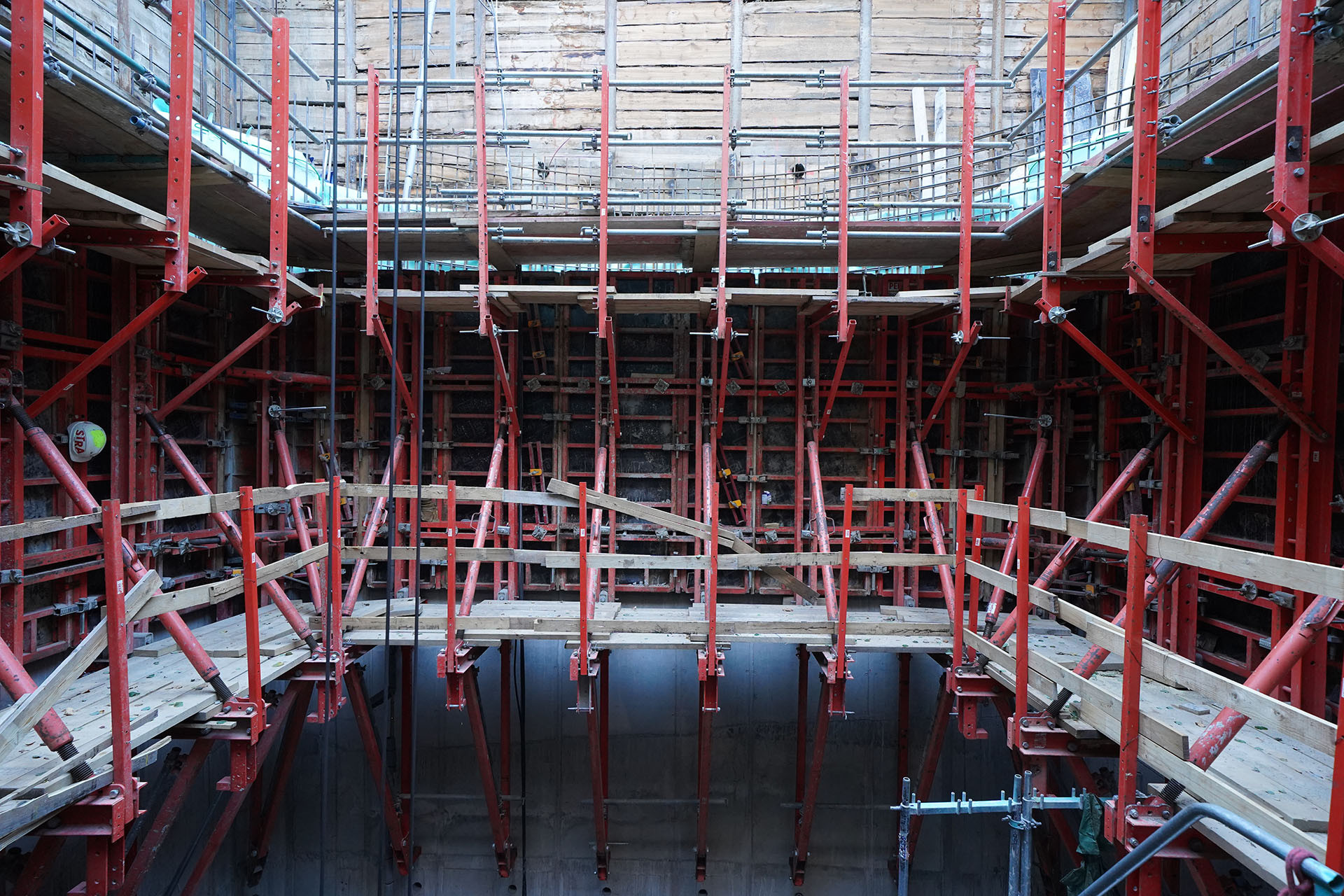 Výstavbu nové výtahové šachty realizovala stavební firma ROCK SALT, která si na technicky náročnou část betonových konstrukcí přizvala ke spolupráci společnost PERI. S ohledem na hloubku šachty, omezené prostorové podmínky a požadovanou rychlost výstavby zvolila firma PERI jednostranný překládaný systém SCS 180. Ten umožnil efektivní a bezpečné provedení stěn šachty o hloubce 26 metrů. Systém SCS, v kombinaci s rámovým bedněním TRIO, RUNDFLEX a podpěrnými rámy SB, zajistil optimální přizpůsobení konstrukci v jednotlivých částech. Pro přestupní chodbu pak byla využita podpěrná konstrukce z modulového lešení PERI UP Flex a dílů systému VARIOKIT.