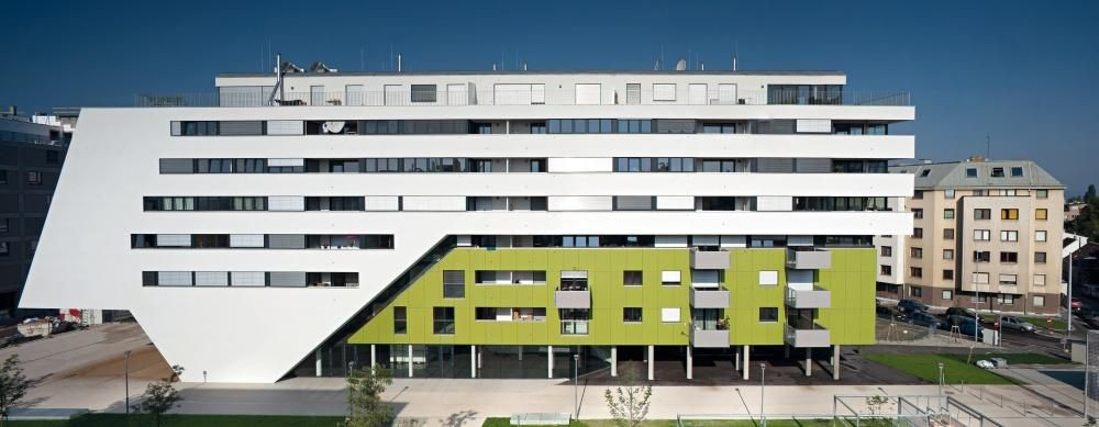 Samotný bytový dom je na prvý pohľad pomerne masívny, do tvaru rozbiehajúceho sa U formovaný dom. Vo vnútri na juh sa otvárajúcej hmoty je ukrytý veľmi príjemný zelený vútroblok. Pre osobu zvyknutú na bratislavské pomery, kde častým zištným neduhom parterov bytových domov je ich prenechanie na komerčné účely, je trochu zarážajúce, že presklené a s okolím komunikujúce steny parteru neskrývajú kaviareň, obchod či pobočku banky, ale dôsledne slúžia samotným obyvateľom domu. A tak sa hordy bicyklov a detských kočíky vyhrievajú v slnečných lúčoch, spoločná práčovňa s príjemným posedením sa stáva útočiskom noviny čítajúceho mužského pokolenia (ktoré preto – áno, dokonca s radosťou – prebralo úlohu prania), spoločenské miestnosti s kuchynkou a sedením či detský kútik plne vychutnávajú možnosť priameho kontaktu s exteriérom a dokonca aj tých pár málo exponovaných predzáhradiek všeobecnou družnosťou získava na atraktívnosti. Bytovka tak neprišla o svoje dôležité súkromné funkčné priestory, naopak, maximálne využila otázny potenciál prízemia jednoznačne pre svoj všeobecný benefit.