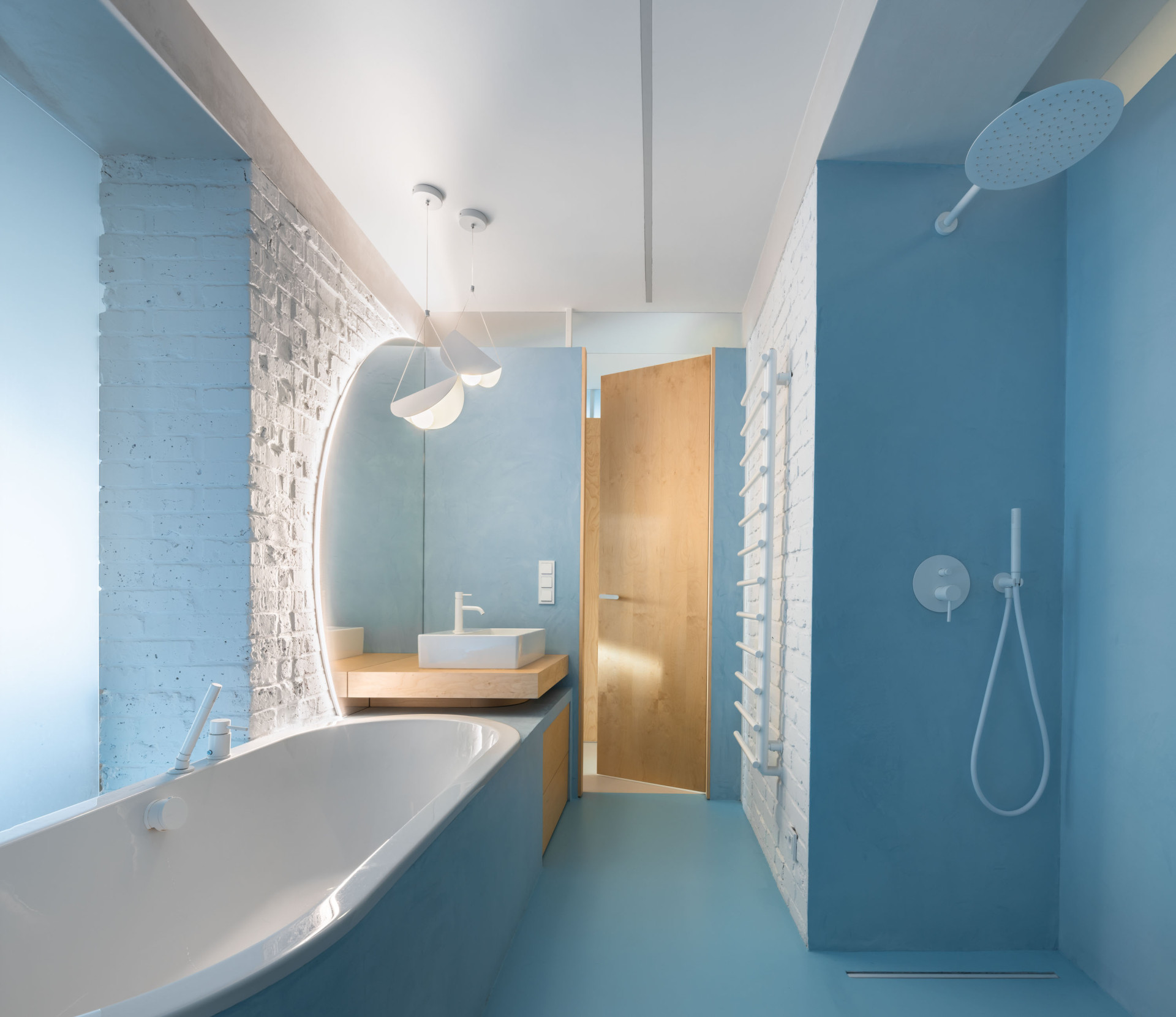 Mezi bílou, krémovou a dřevem se objevují i barevné akcenty – modrý jídelní stůl, skříň v dětském pokoji nebo modrá stěrka v koupelně, která svými vlastnostmi dokáže zastoupit dlaždice a obklady. „Modrá prostoru dodává osobitý charakter a hloubku,“ dodává Kateřina Horych.