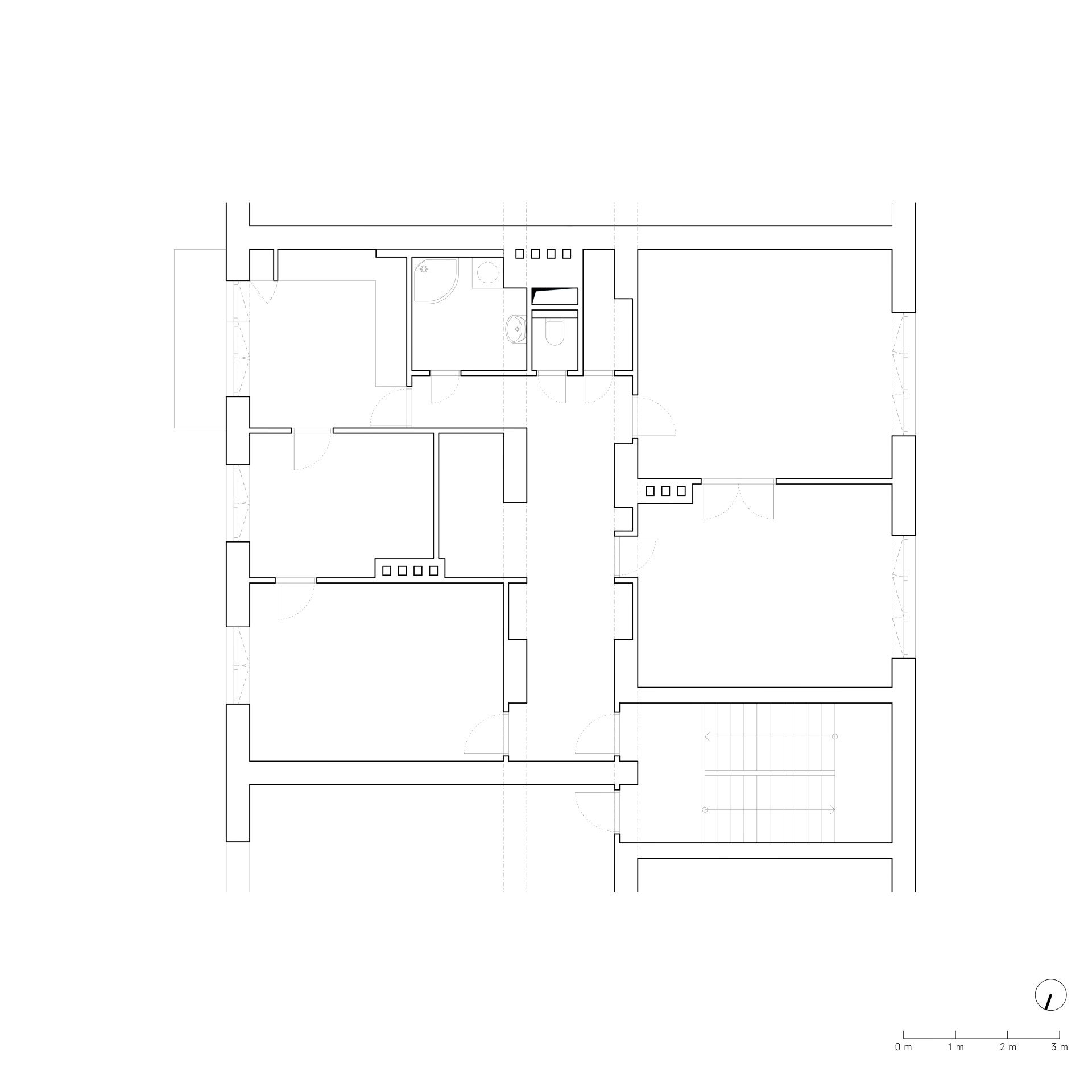 Byt v domě z 50. let měl původně centrální dispozici s širokou chodbou uprostřed. Právě tato část však nedokázala přijímat denní světlo a přeměnit ji na živý obytný prostor nebylo dost dobře možné. Architektka Kateřina Horych se proto rozhodla pro opačný přístup – temné jádro ponechala funkcím, které přirozené světlo tolik nepotřebují, a zbytek bytu přeuspořádala do otevřeného, variabilního celku.
