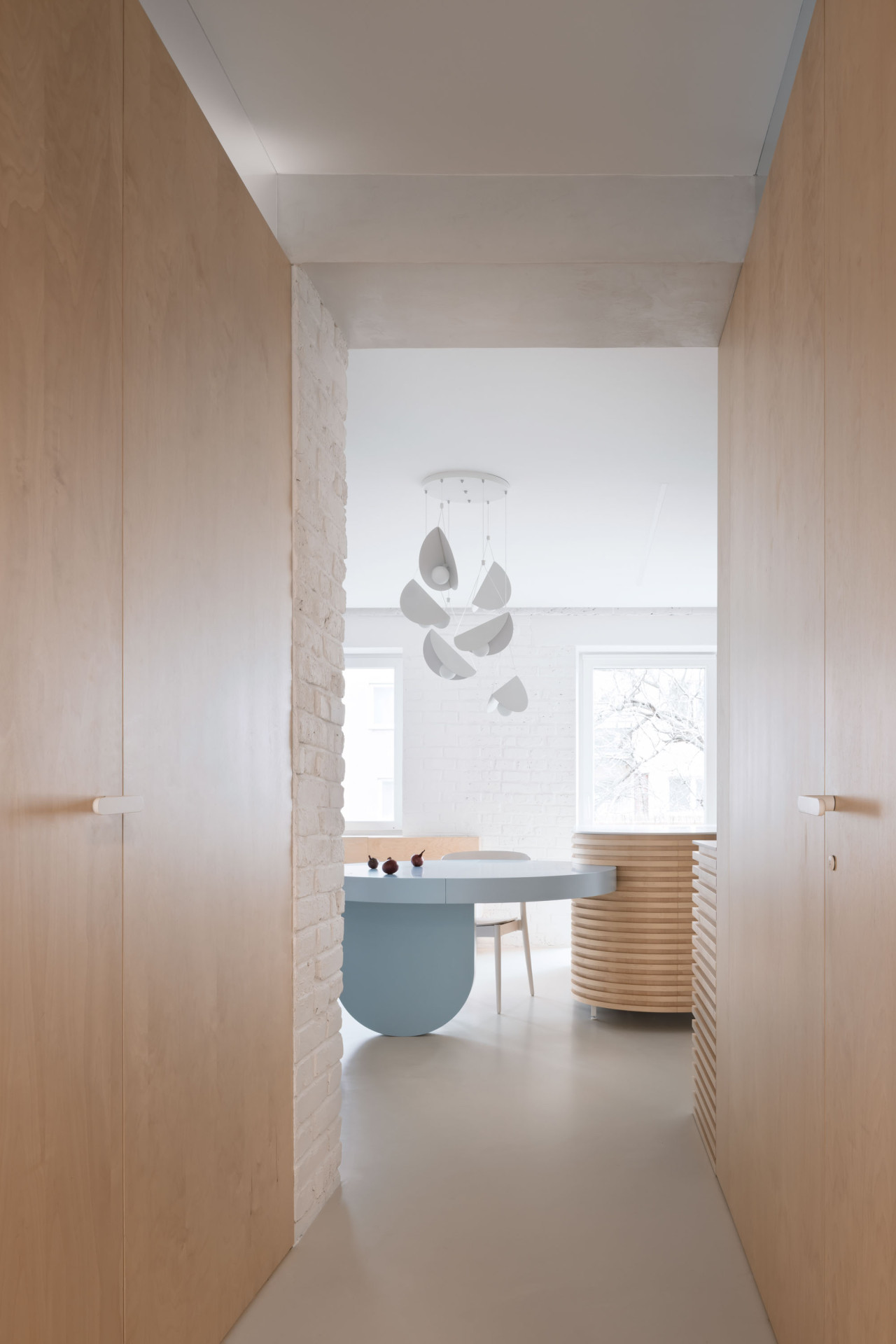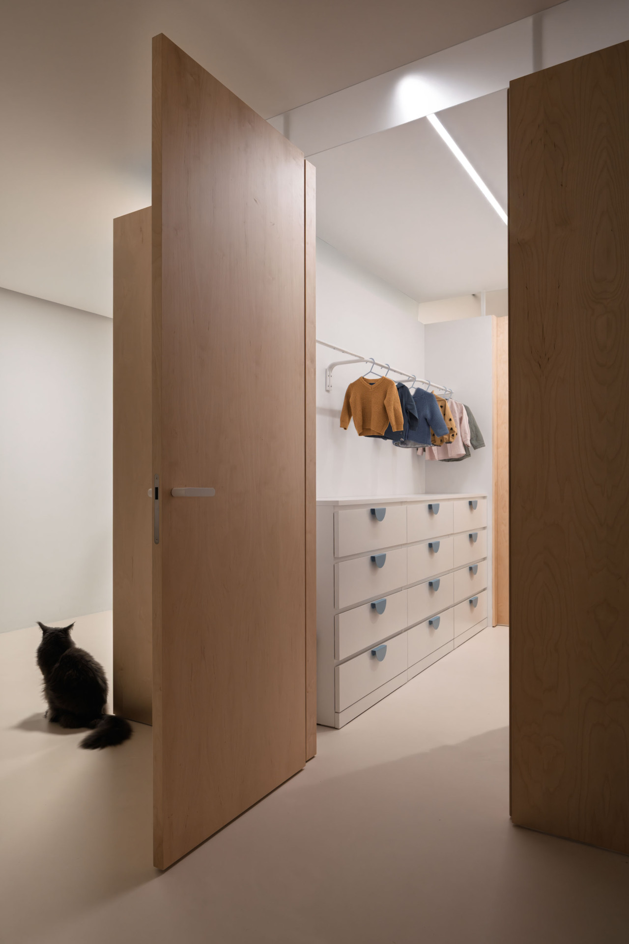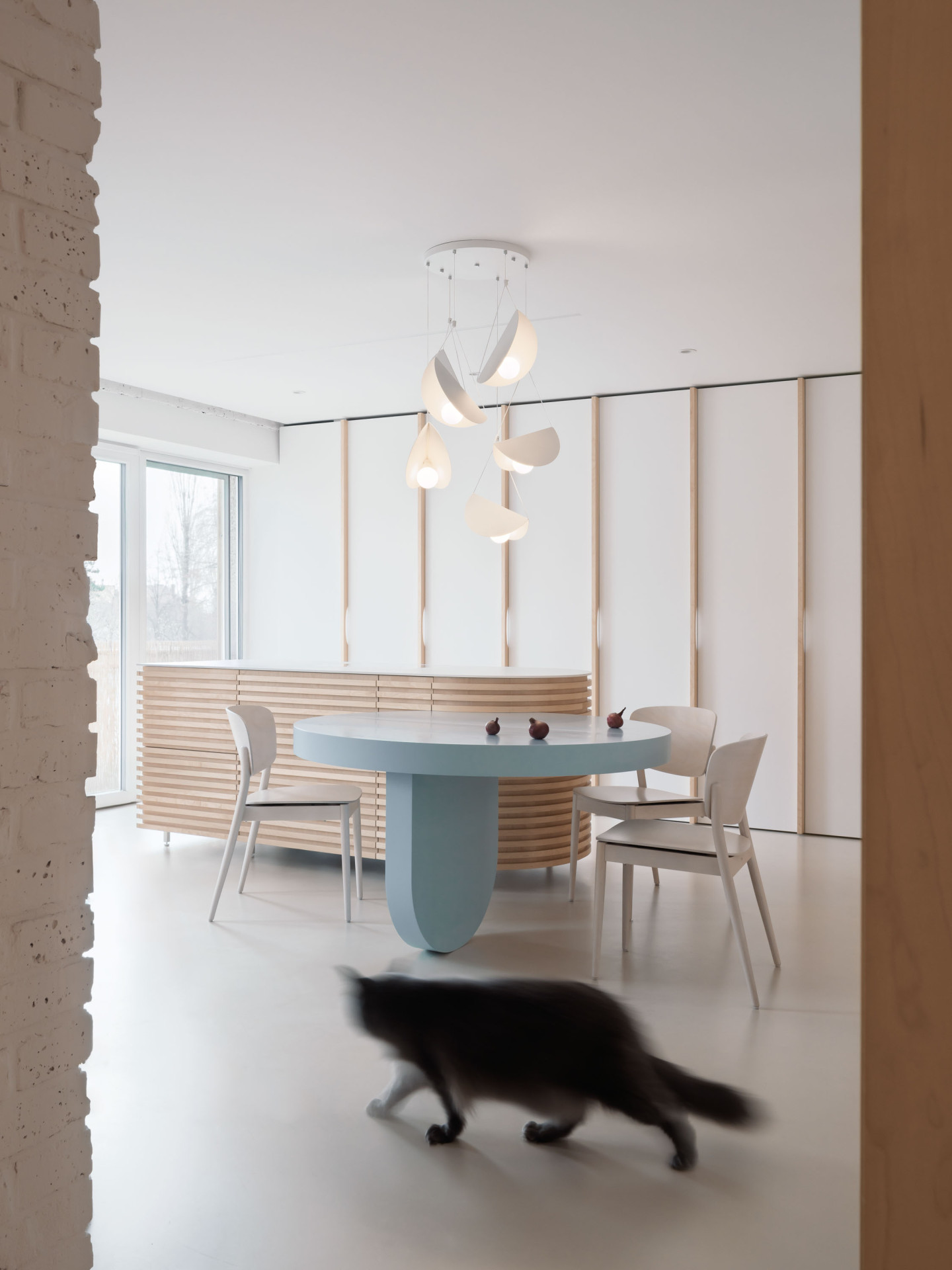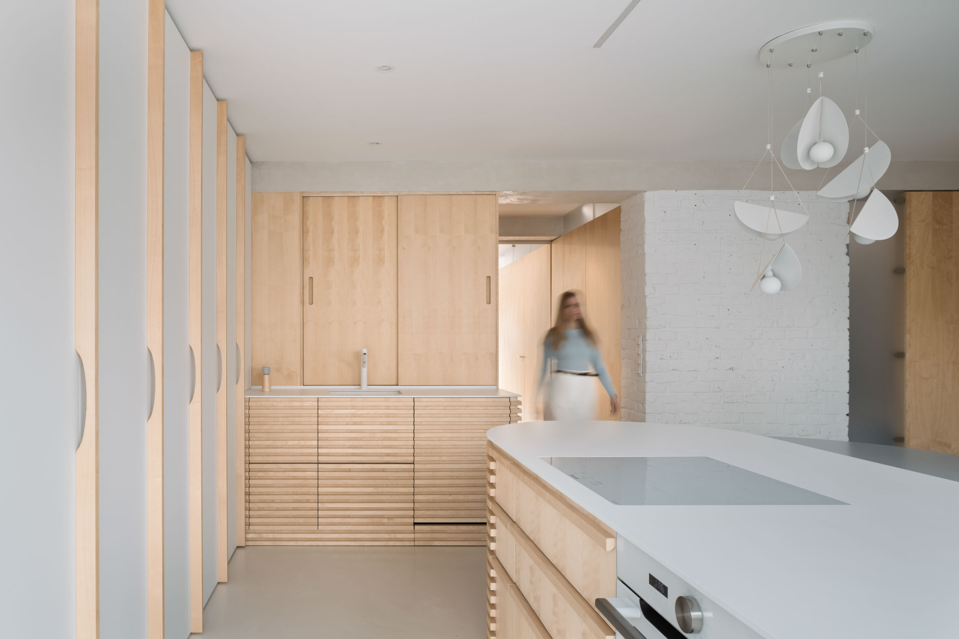 Výsledkem rekonstrukce je materiálově světlý a dispozičně flexibilní byt, ve kterém zbylo místo také na nápadité detaily. Vnášejí je například křivky, patrné jak na velkých kusech nábytku, tak v detailech – třeba v úchytkách vyřezaných do lamel v kuchyni nebo ve dvířkách, nimiž se mezi místnostmi mohou pohybovat také dvě kočky, které rodina opatruje.