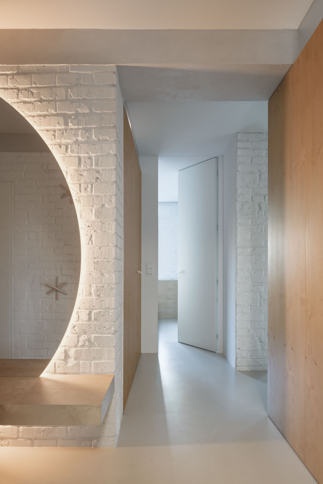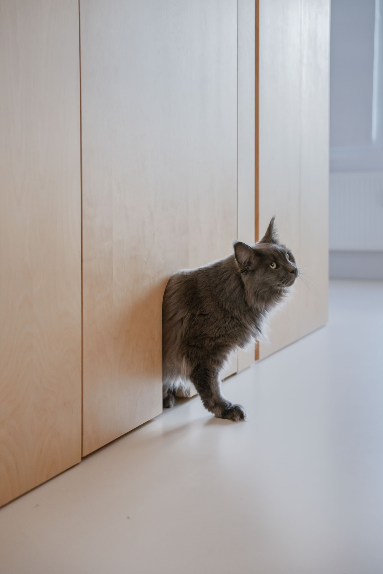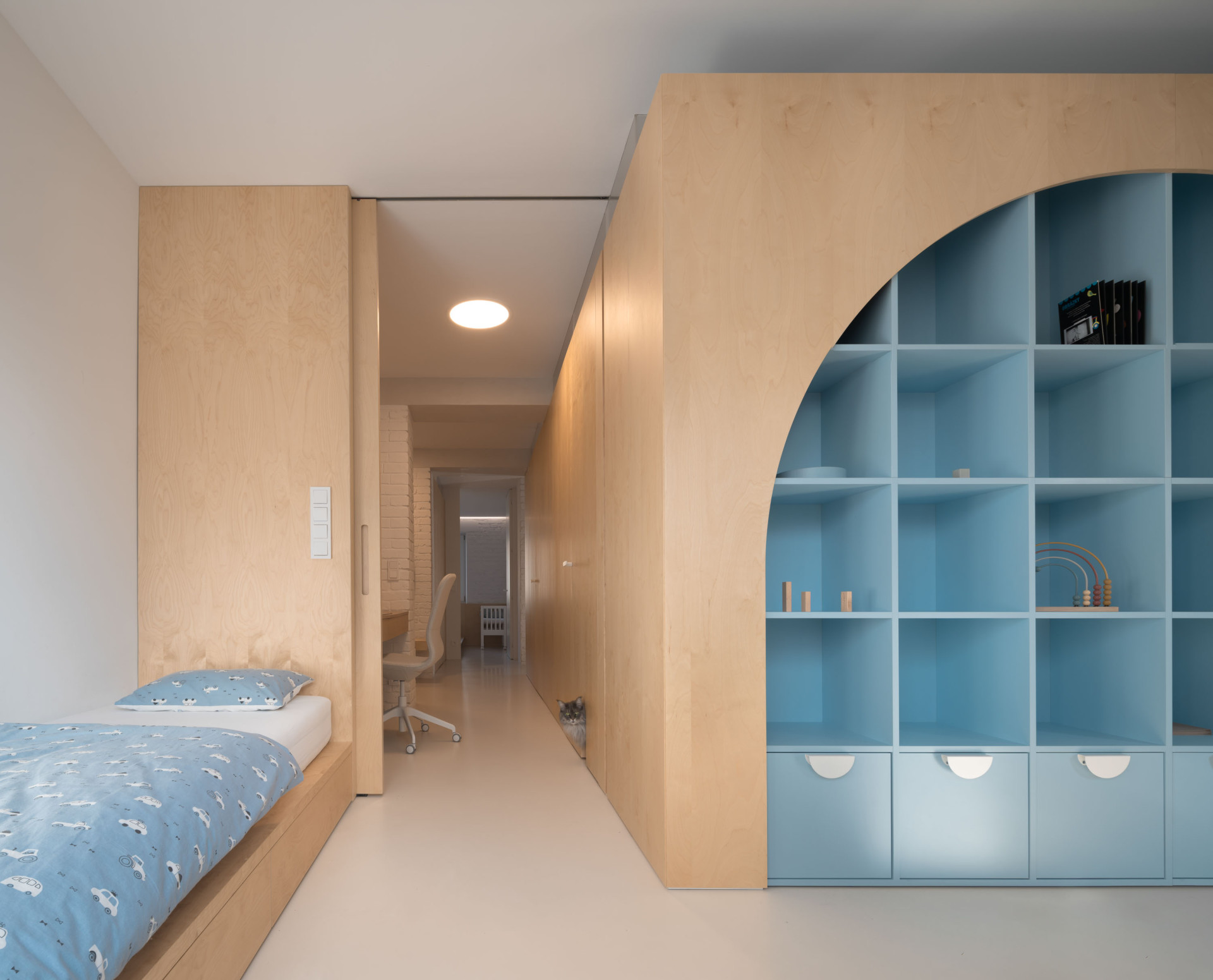 Výsledkem rekonstrukce je materiálově světlý a dispozičně flexibilní byt, ve kterém zbylo místo také na nápadité detaily. Vnášejí je například křivky, patrné jak na velkých kusech nábytku, tak v detailech – třeba v úchytkách vyřezaných do lamel v kuchyni nebo ve dvířkách, nimiž se mezi místnostmi mohou pohybovat také dvě kočky, které rodina opatruje.