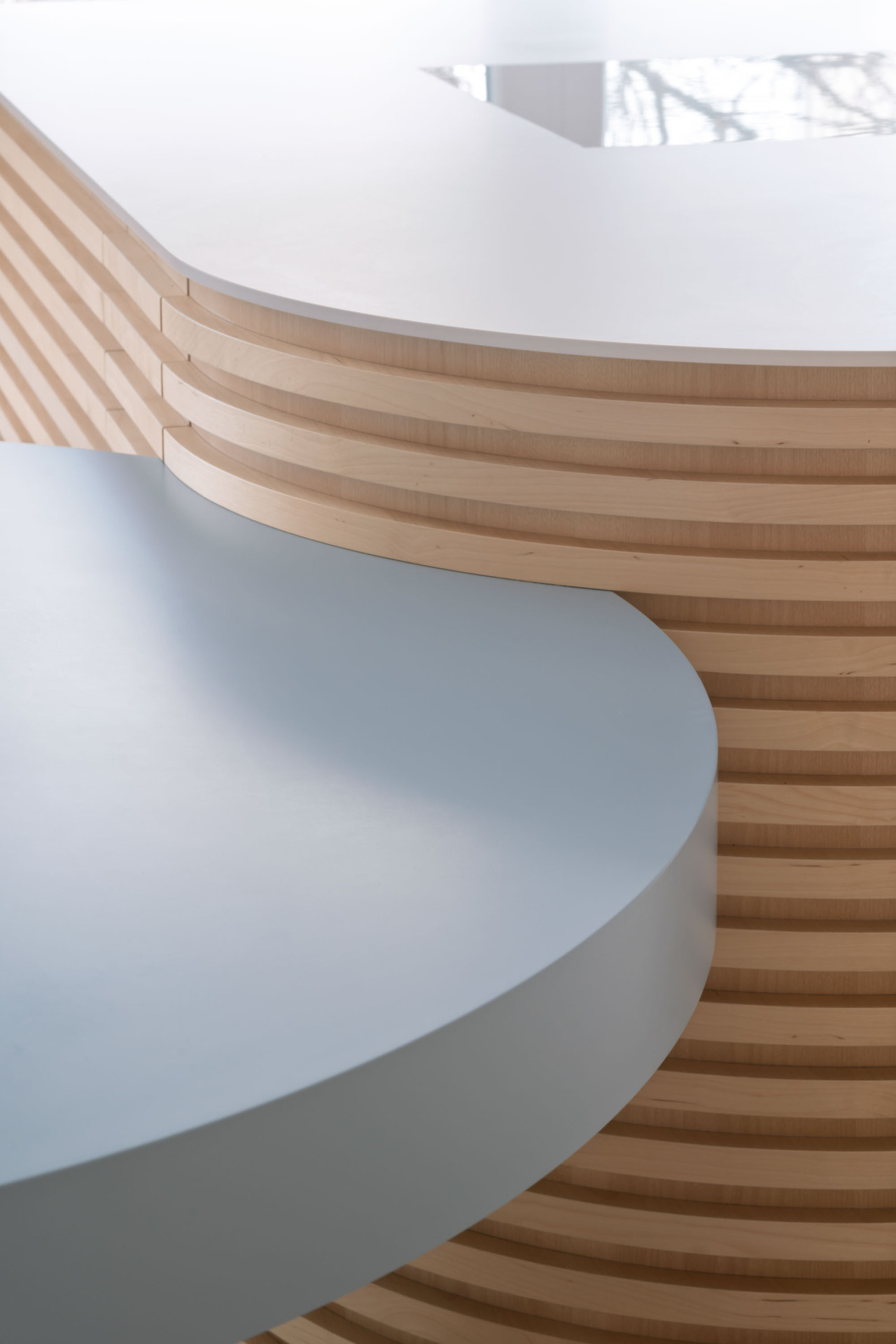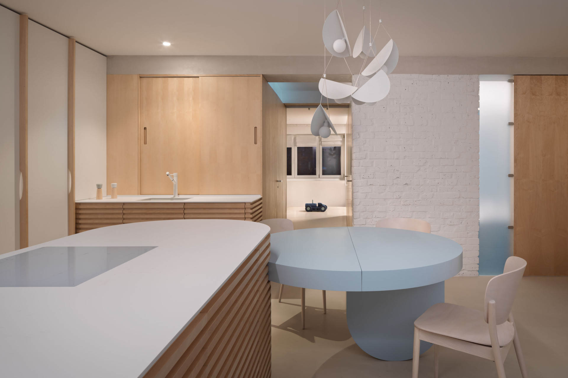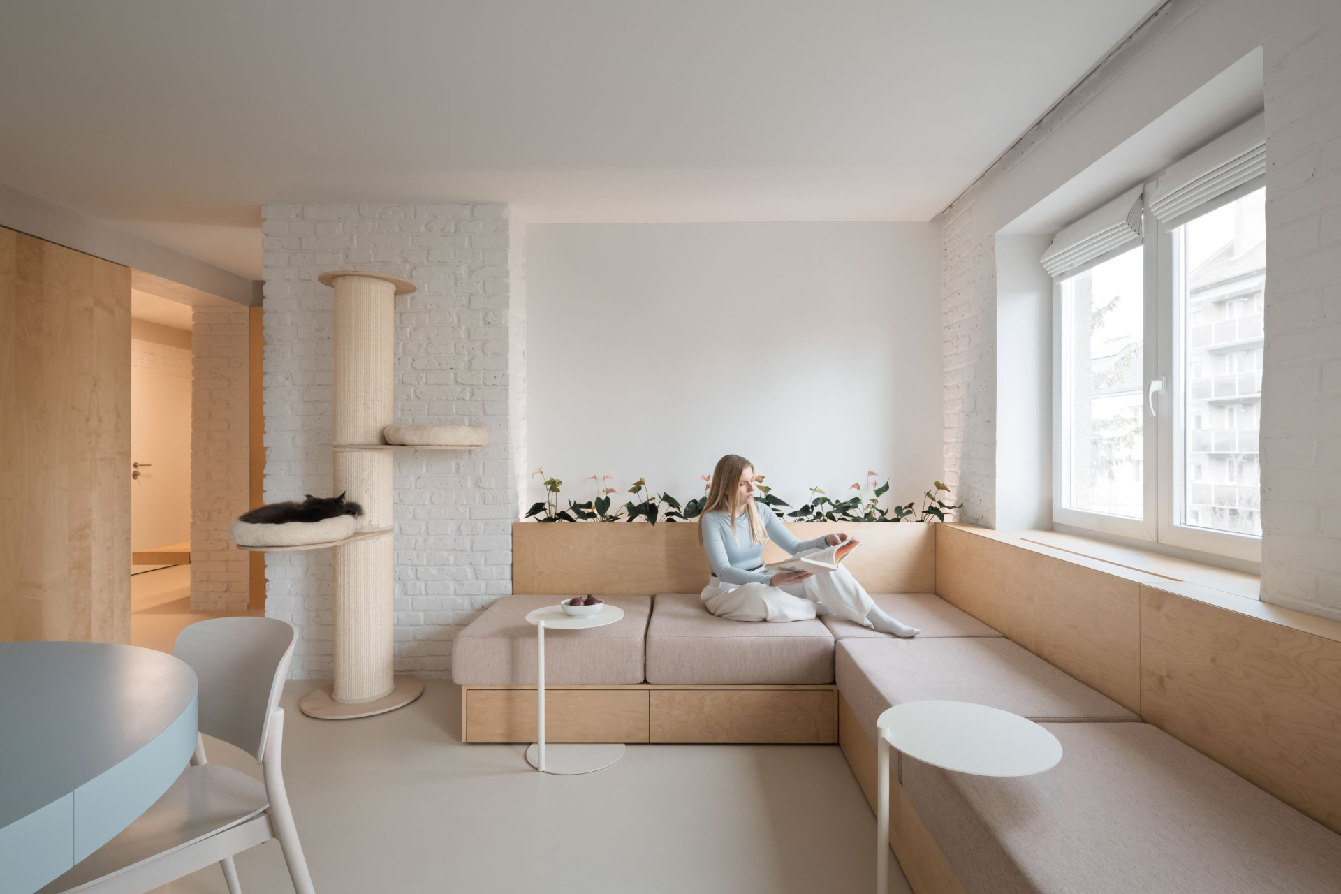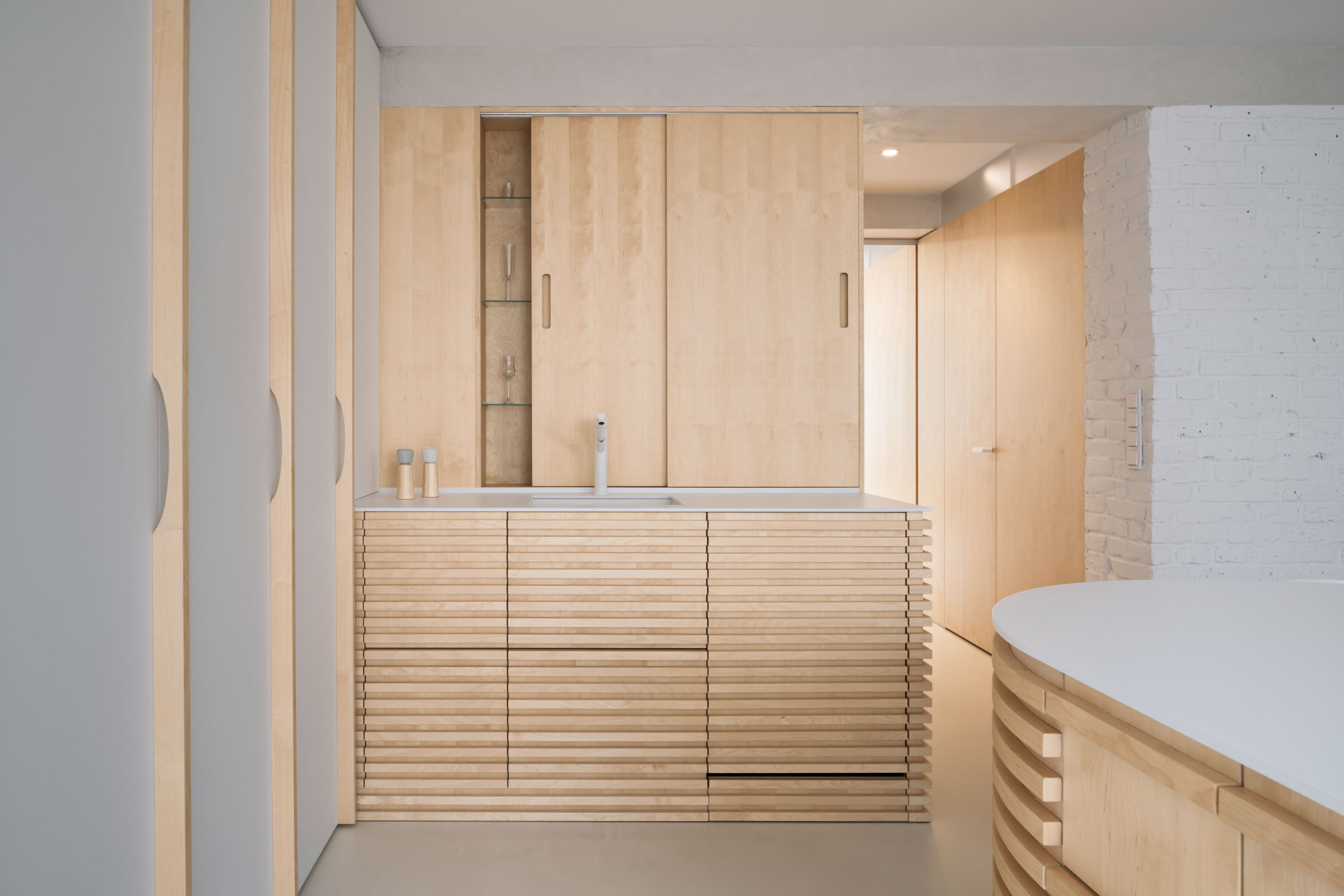 Výsledkem rekonstrukce je materiálově světlý a dispozičně flexibilní byt, ve kterém zbylo místo také na nápadité detaily. Vnášejí je například křivky, patrné jak na velkých kusech nábytku, tak v detailech – třeba v úchytkách vyřezaných do lamel v kuchyni nebo ve dvířkách, nimiž se mezi místnostmi mohou pohybovat také dvě kočky, které rodina opatruje.