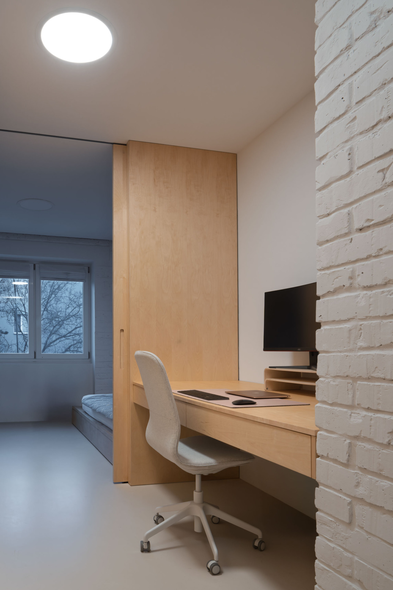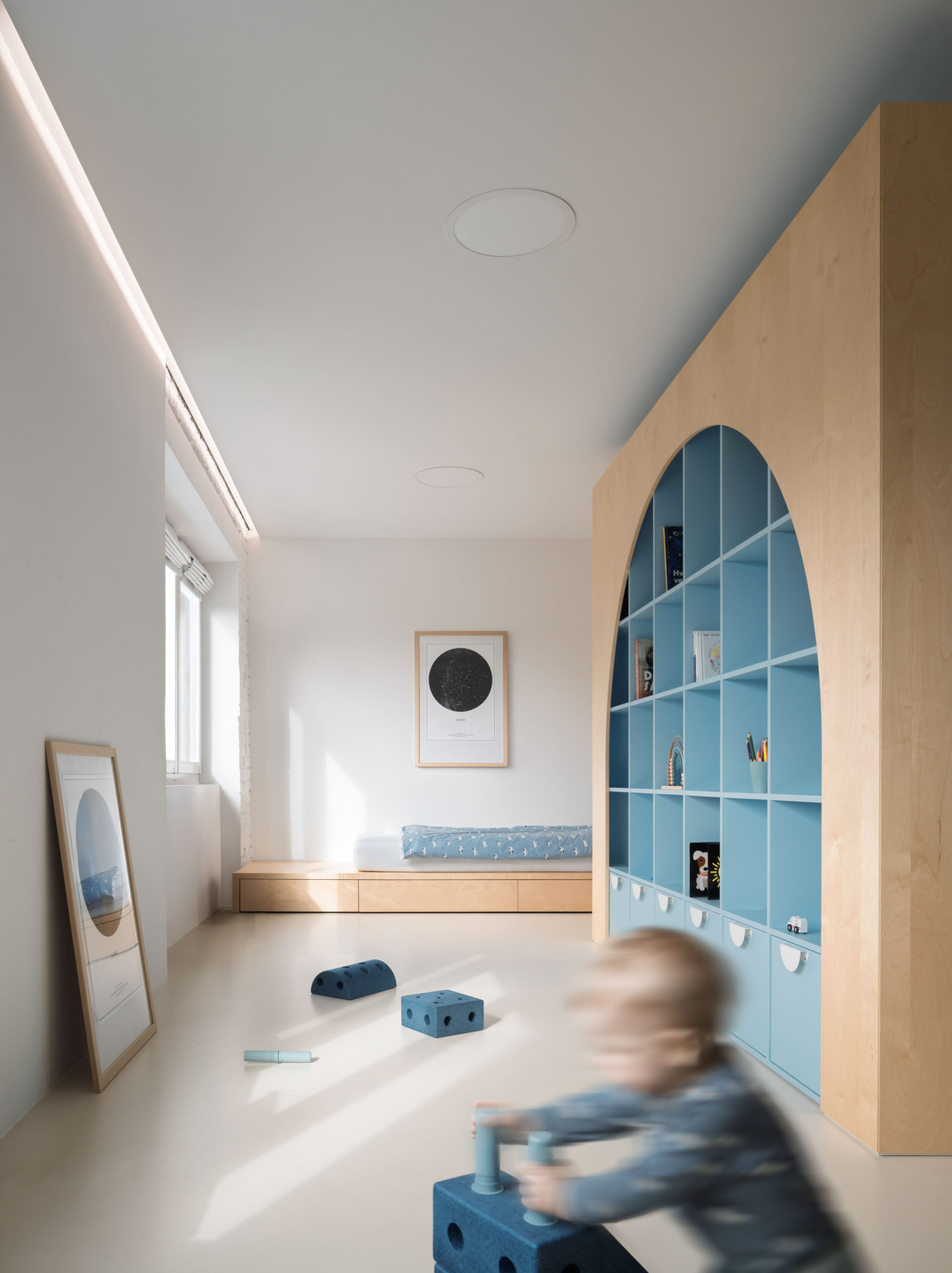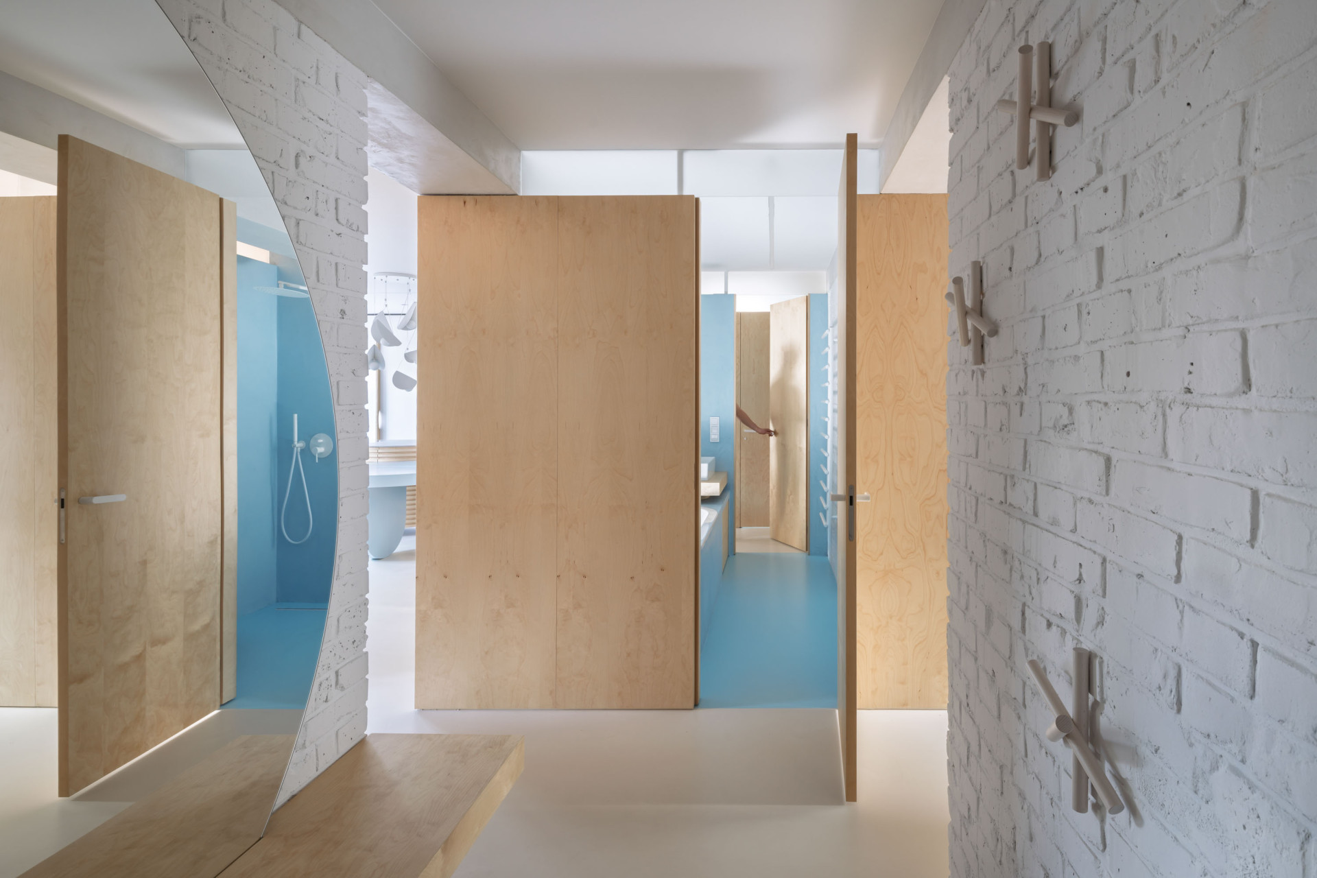 V kontaktu s okolními místnostmi zůstává i dětská šatna a koupelna uprostřed bytu. Pod stropem do nich světlo přivádějí světlíky, koupelnu navíc od kuchyně odděluje otvíratelné okno. Architektka ho sem navrhla kvůli přirozenému větrání.