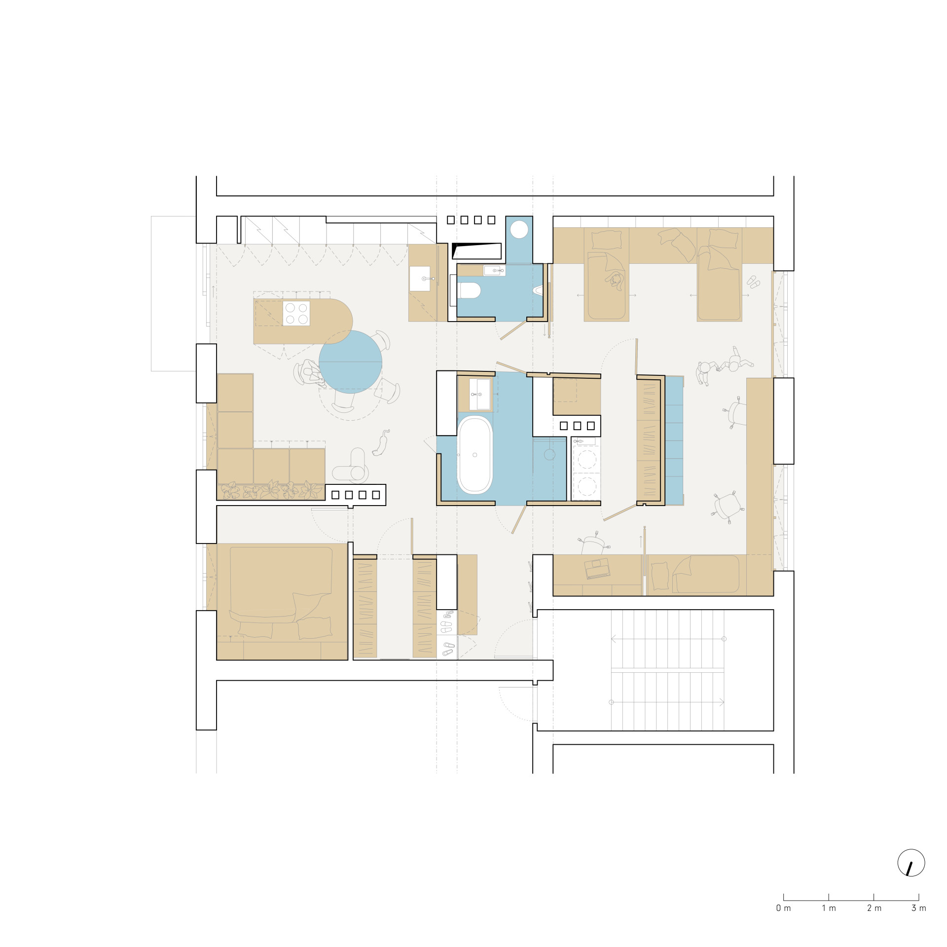 Kateřina Horych o bytě říká, že je to takový „open space“. Téměř všechny místnosti se dají vzájemně propojit a vytvoří tak jeden otevřený prostor společný všem. Zároveň je ale možné ho zónovat podle aktuální potřeby. „Prostor je možné podle nálady oddělovat posuvnými dveřmi do jednotlivých menších místností. Byt se tak může proměňovat v čase a přizpůsobovat se potřebám rodiny,“ vysvětluje architektka.