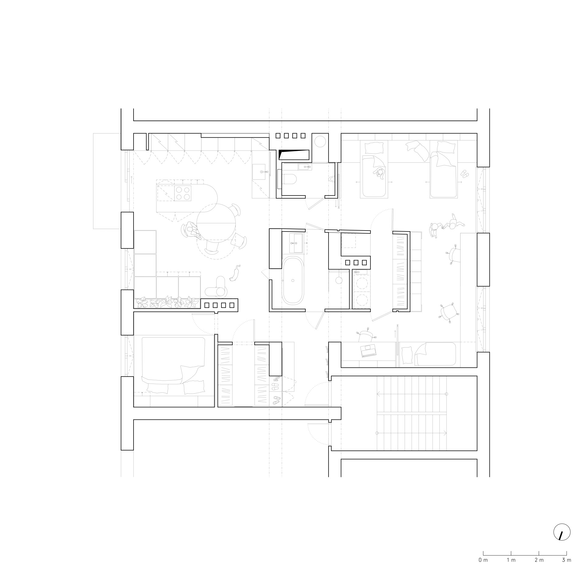 „Téměř všechny původní příčky jsme zbourali,“ říká architektka z Atel!er a vysvětluje, že místo centrální, tmavé chodby teď jádro bytu tvoří koupelna a dětská šatna. Denní místnosti – kuchyň, obývací pokoj, dětské pokoje a pracovna – se organizují okolo nich.