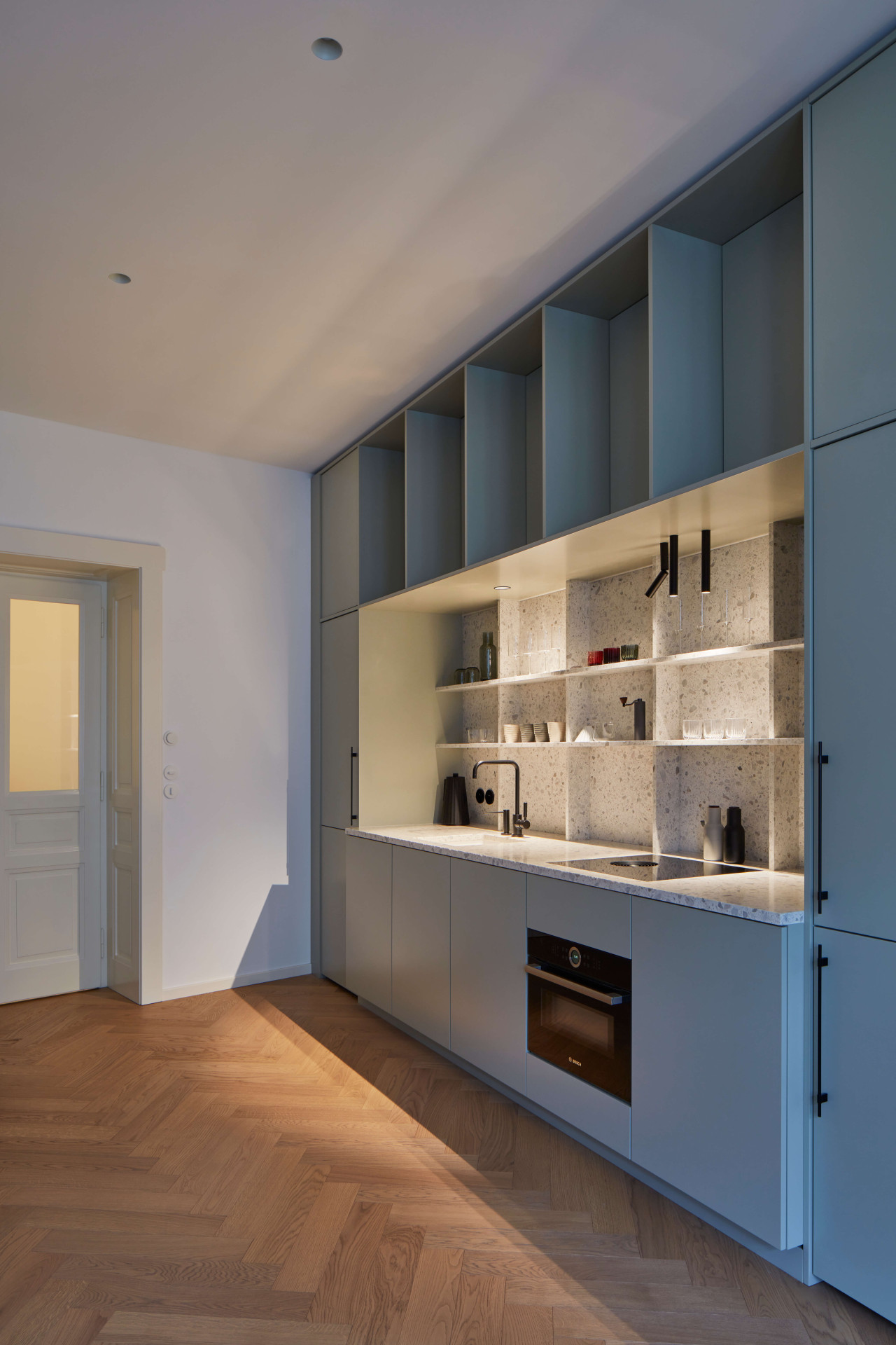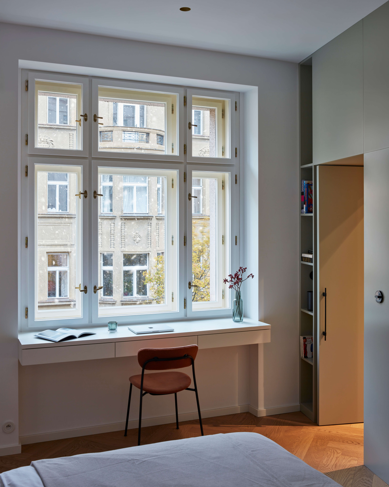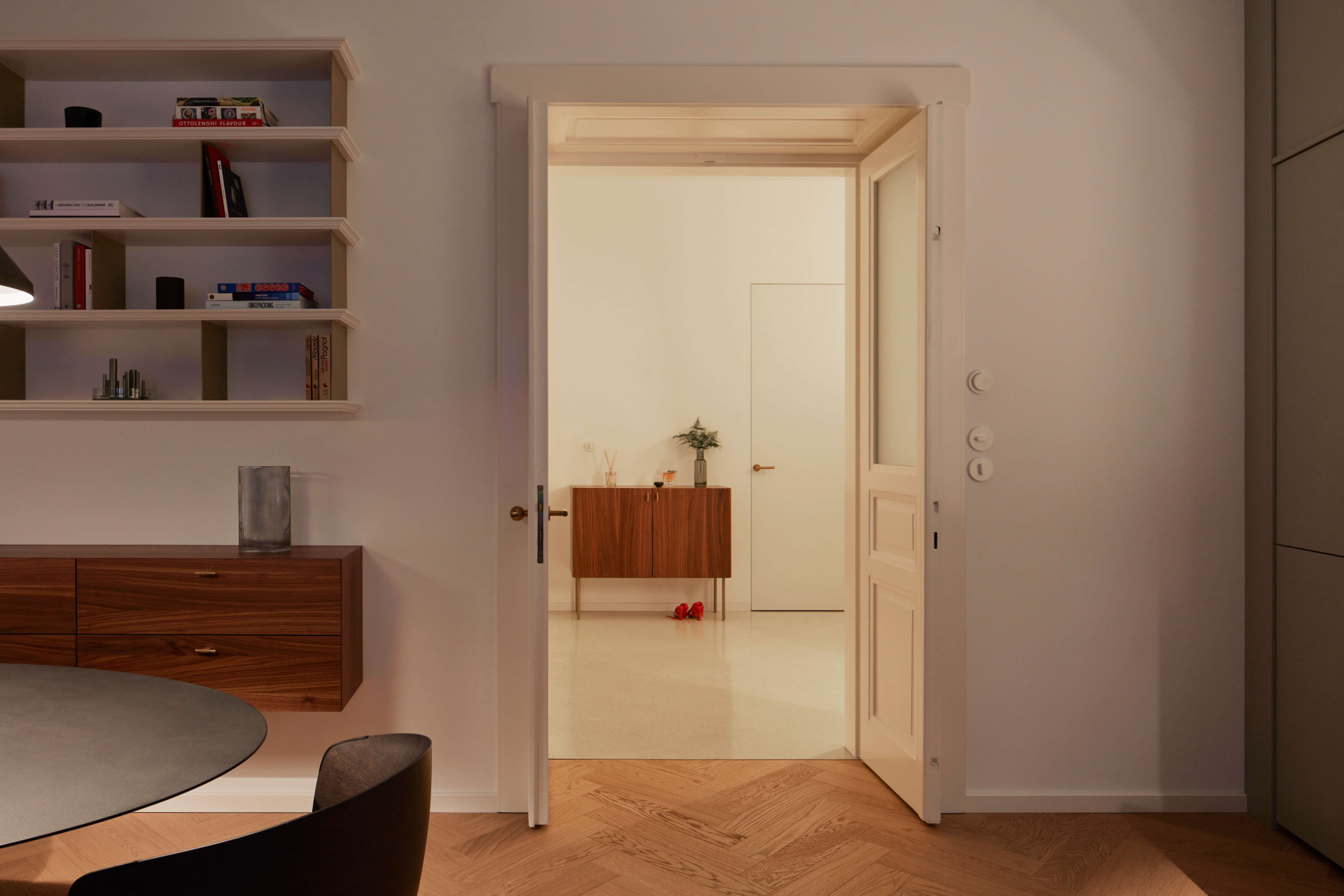 Když poprvé vstoupíte do bytu, dýchá v něm prostorová velkorysost i důmyslně navržené sestavy vestavných nábytků. Vést dialog mezi původními zachovalými prvky a nově vnesenými principy bylo od samého počátku rekonstrukce hlavním sdělovací atributem. „Veškeré zásahy byly dlouho promýšlené. Záměrem bylo vytvořit minimalistické bydlení, které bude respektovat odkaz minulosti, ale i požadavky na současný životní styl,“ upřesňuje architektka Stambolijská.