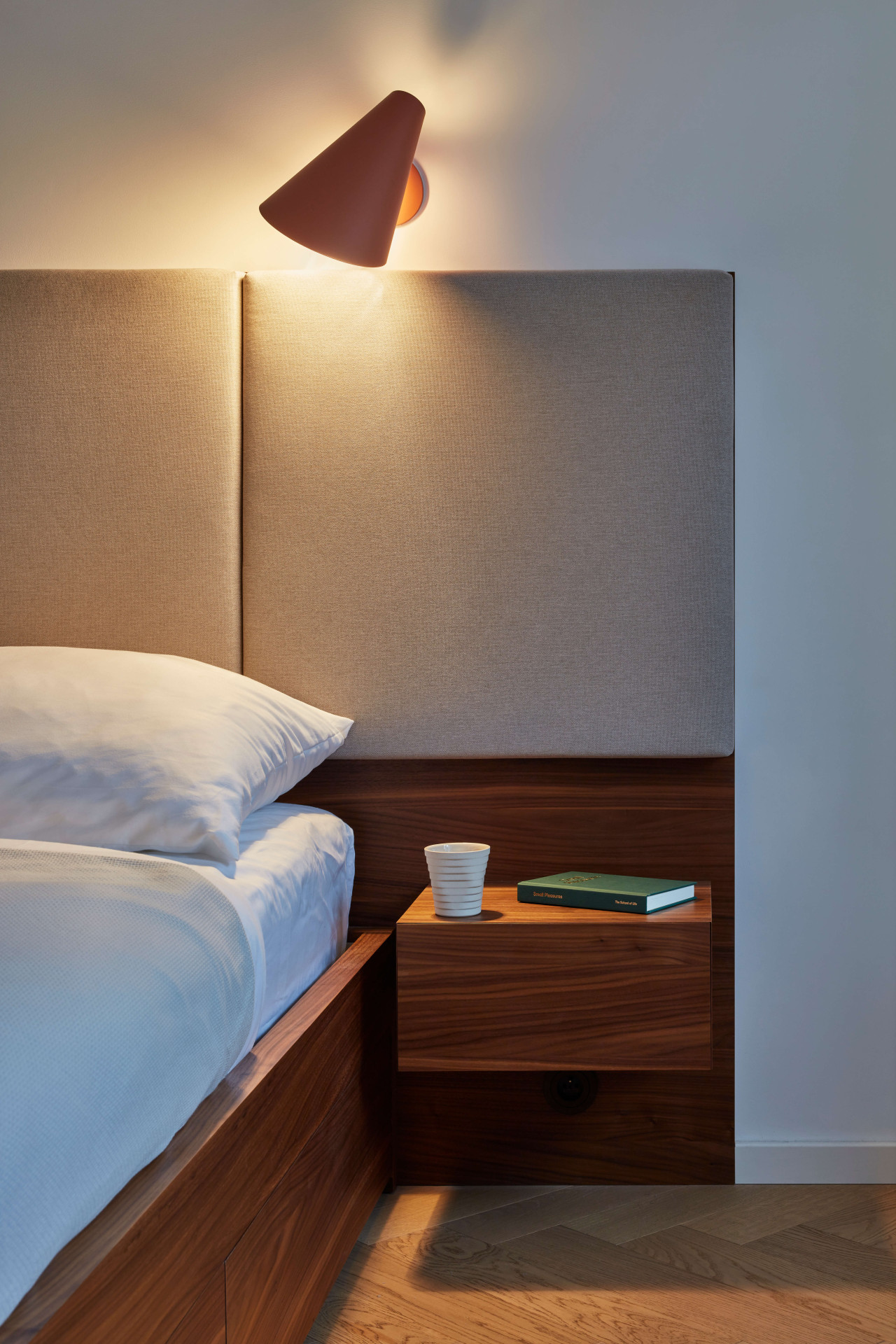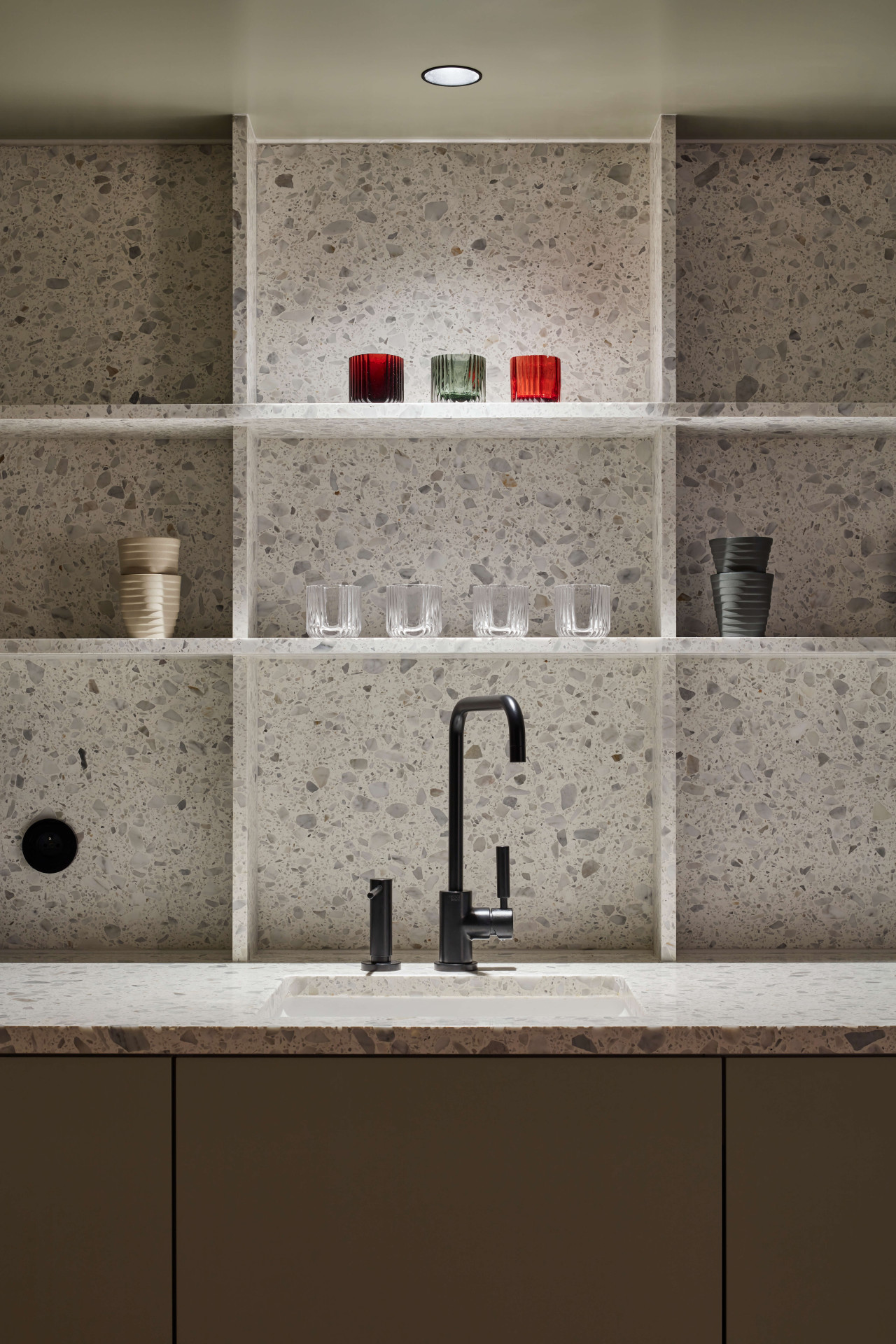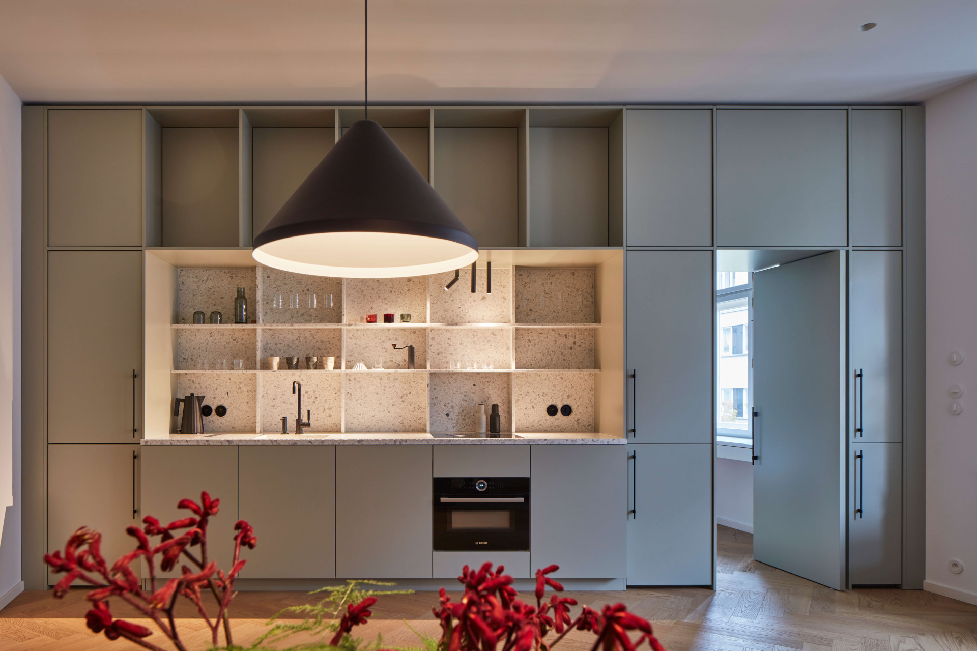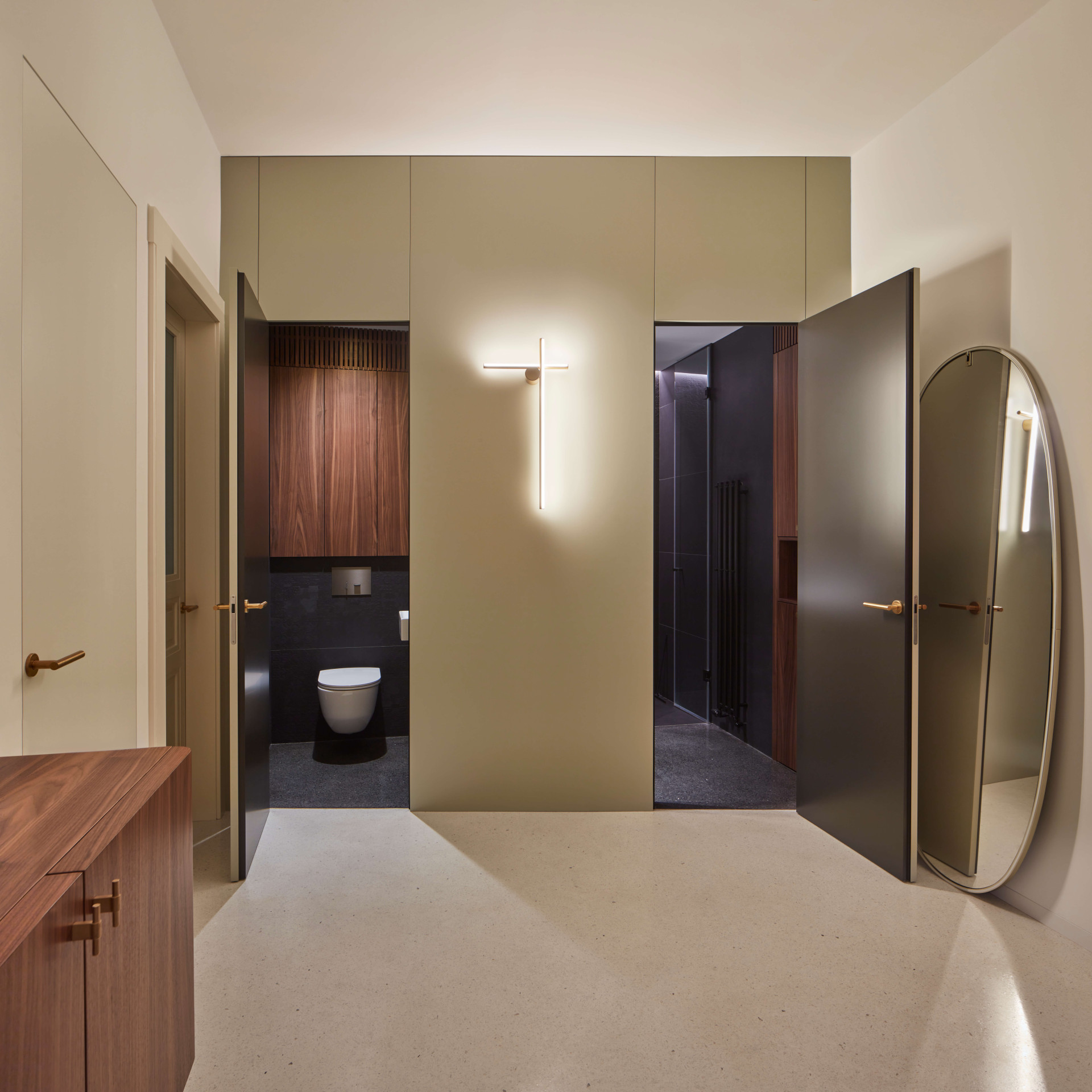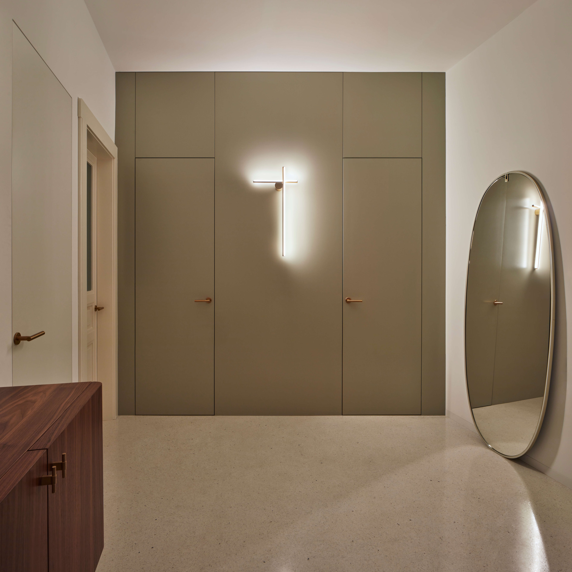 Neméně důležitou kapitolou celého procesu bylo najít vhodné materiály. „Při výběru jsem dbala na to, aby vybrané hmoty nesly historickou hodnotu a zároveň byly použity atypicky a fungovaly v jisté synergii napříč celým prostorem,“ vysvětluje Stambolijská. V bytě tak například najdeme prvky světlého terazza, lakovaného MDF či ořechového dřeva.