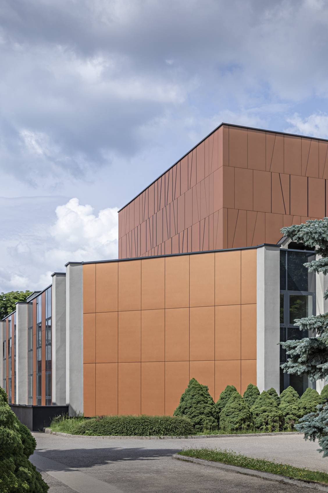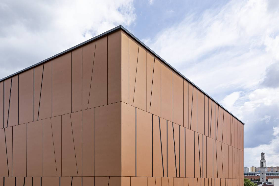 „Obnova pláště budovy je navržena kombinací kontaktního zateplovacího systému ETICS a provětrávaného fasádního systému s obkladem z cementokompozitních desek Swisspearl Reflex v barevném odstínu Autumn Leaves 9270,“ říkají k současnému fasádnímu řešení autoři návrhu. Na místě původních boletických panelů je fasáda komponovaná vertikálně. Na hmotu vysílacího sálu jsou desky kladeny nepravidelně, některé byly seříznuty šikmo a na fasádě tak formují netradiční geometrický vzor.
