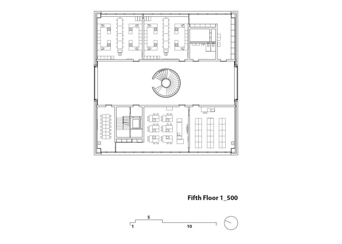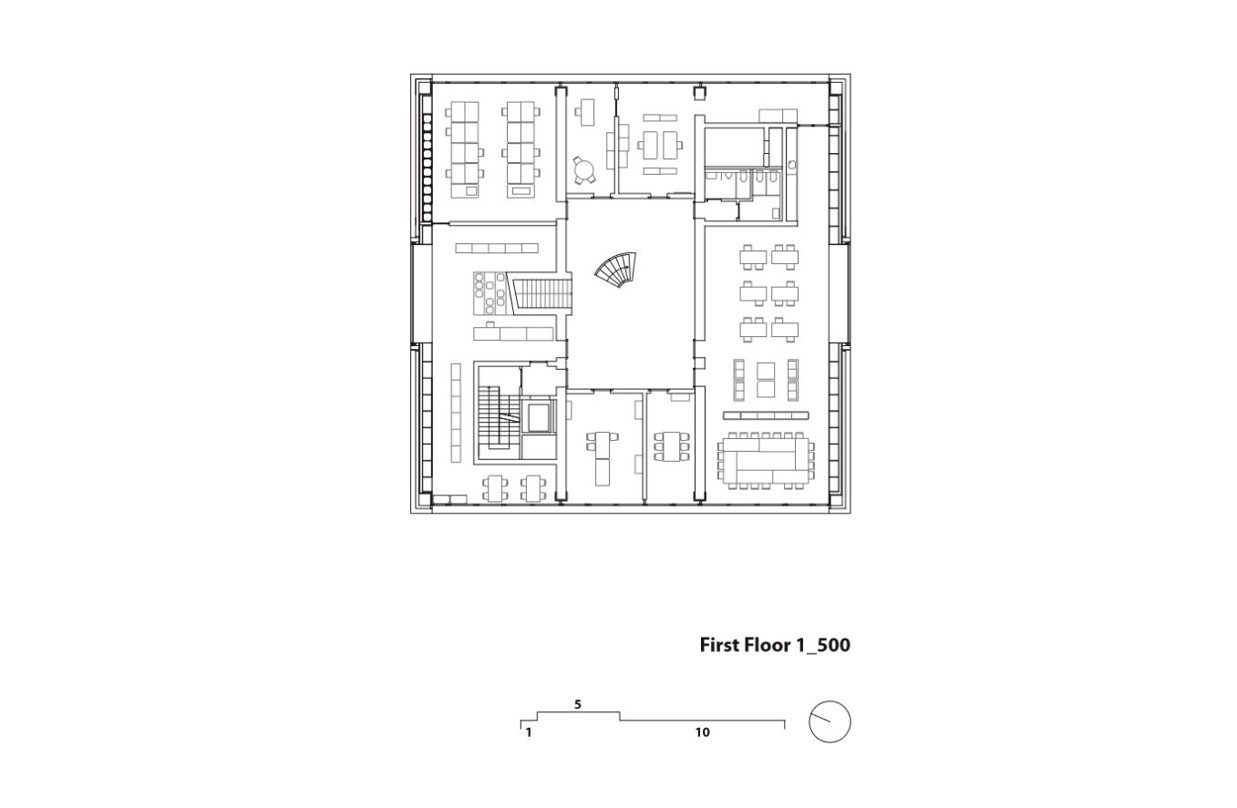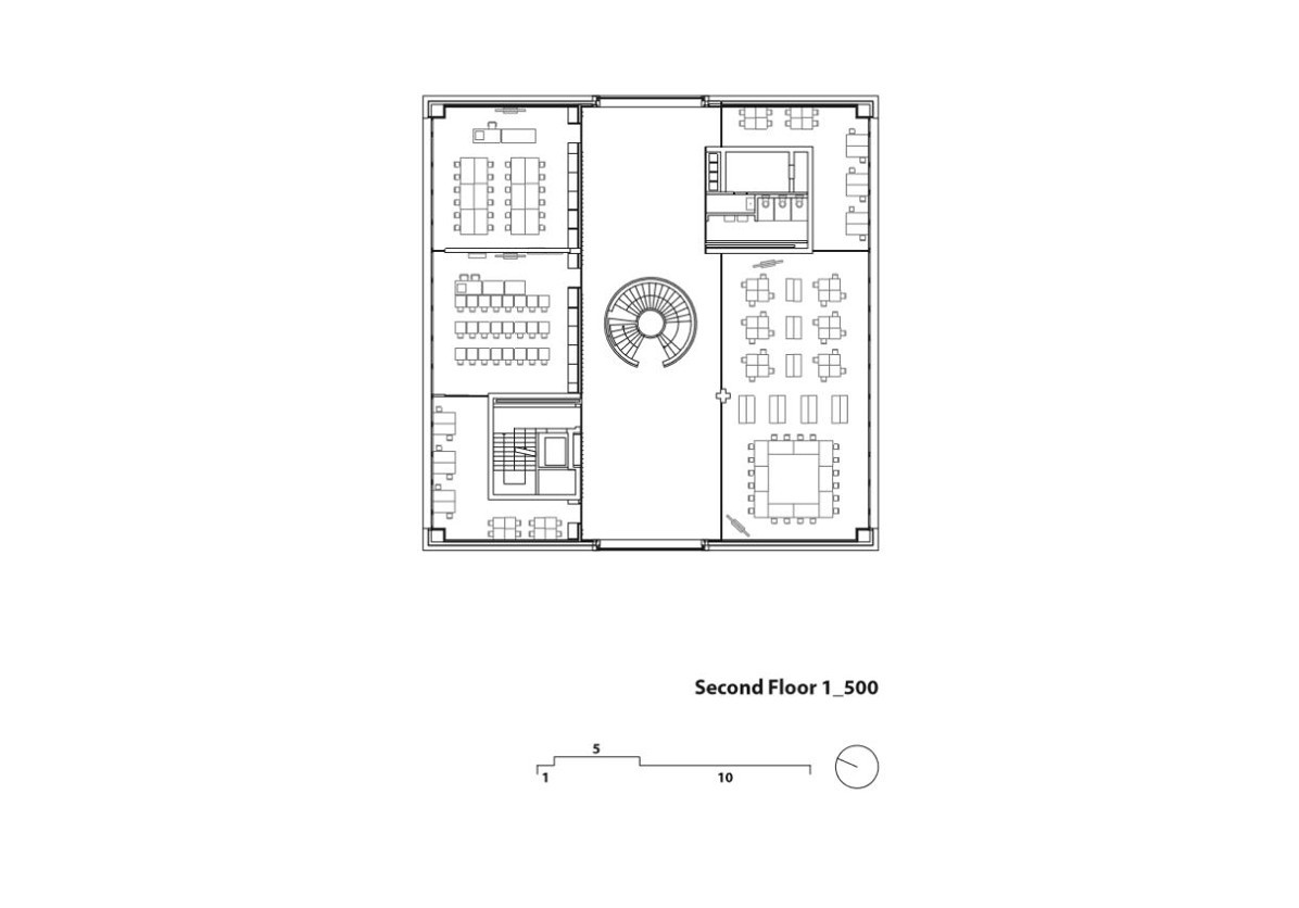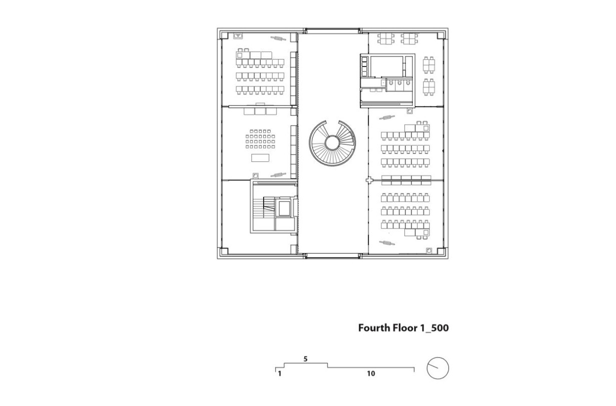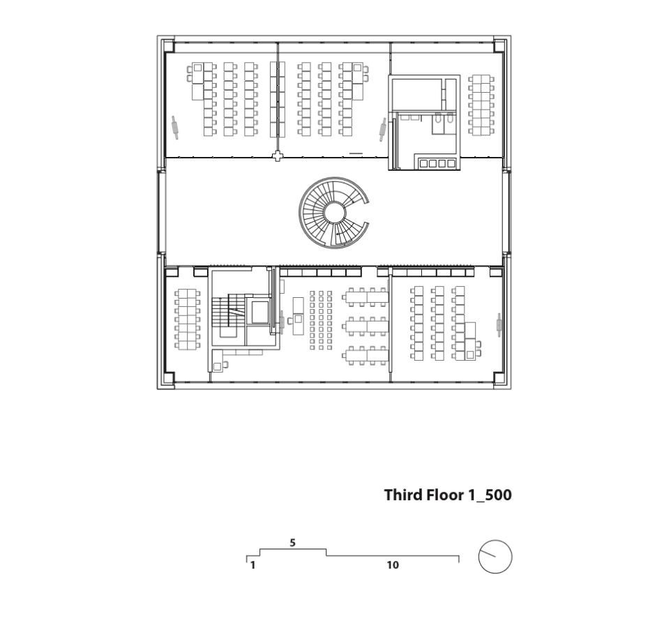 Architekti proto pracovali převážně s otevřenými prostory, které si uživatelé následně upraví sami přímo na míru svým momentálním potřebám. Do otevřeného půdorysu přízemí je umístěna jídelna plynule navazující na velkorysý společenský prostor, který umožňuje pořádání školních a společenských akcí různého charakteru. Další nadzemní podlaží variabilně interpretují jednoduchý třítraktový model. Širokou středovou chodbu s centrálně umístěným točitým schodištěm obklopují z obou stran učebny o základní ploše cca 72 metrů čtverečních, které se však mohou vzájemně propojovat a otevírat a vytvářet tak prostorné učební místnosti. Středová zóna chodby funguje mimo jiné také jako odpočinkový sektor či místo pro individuální výuku.