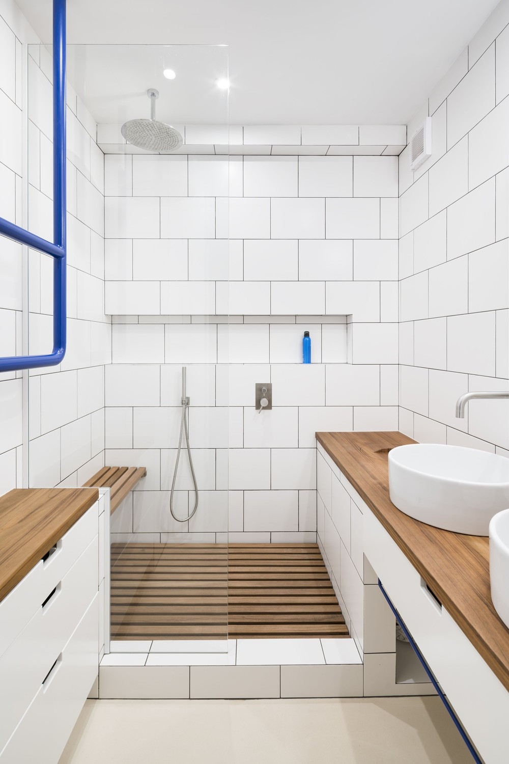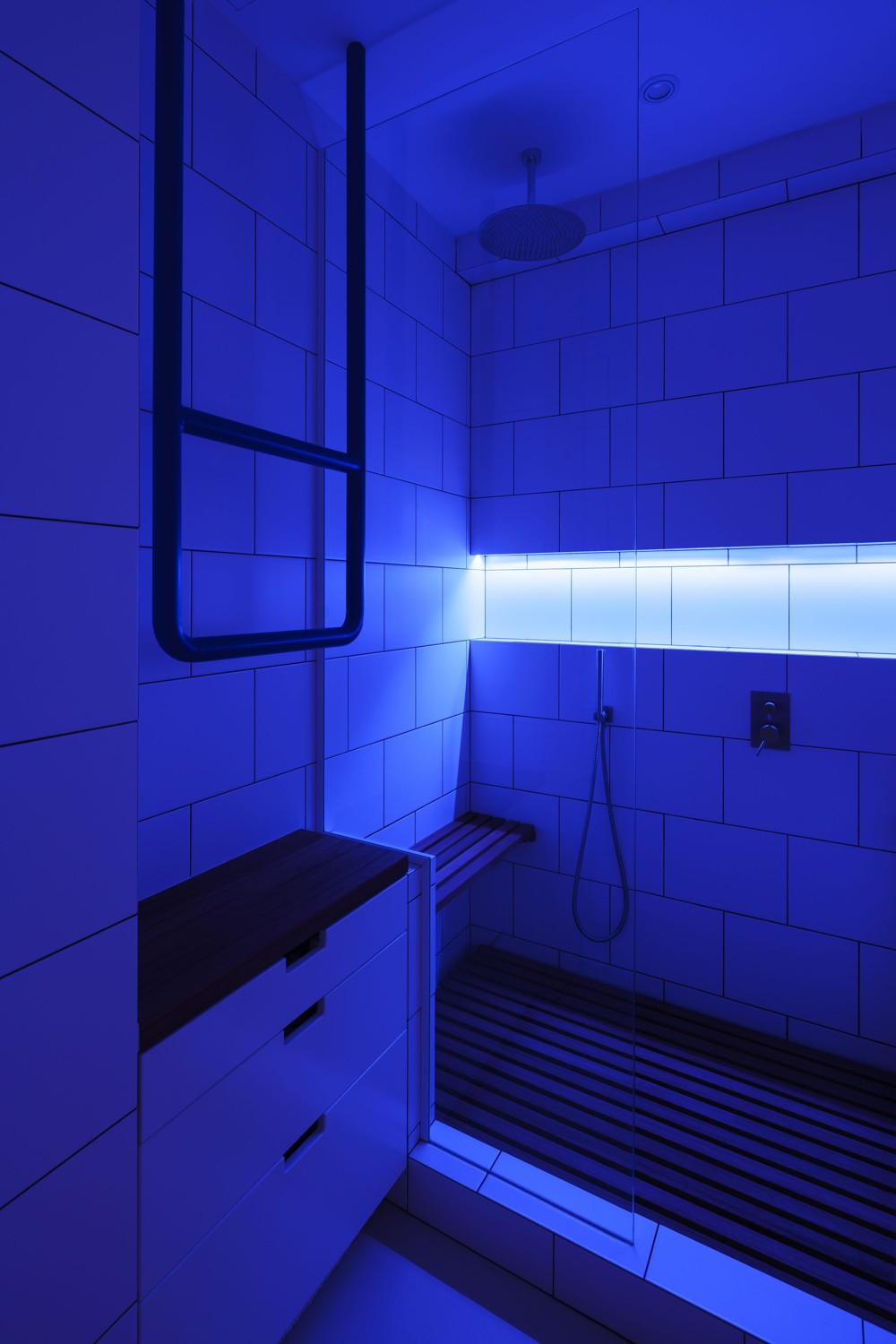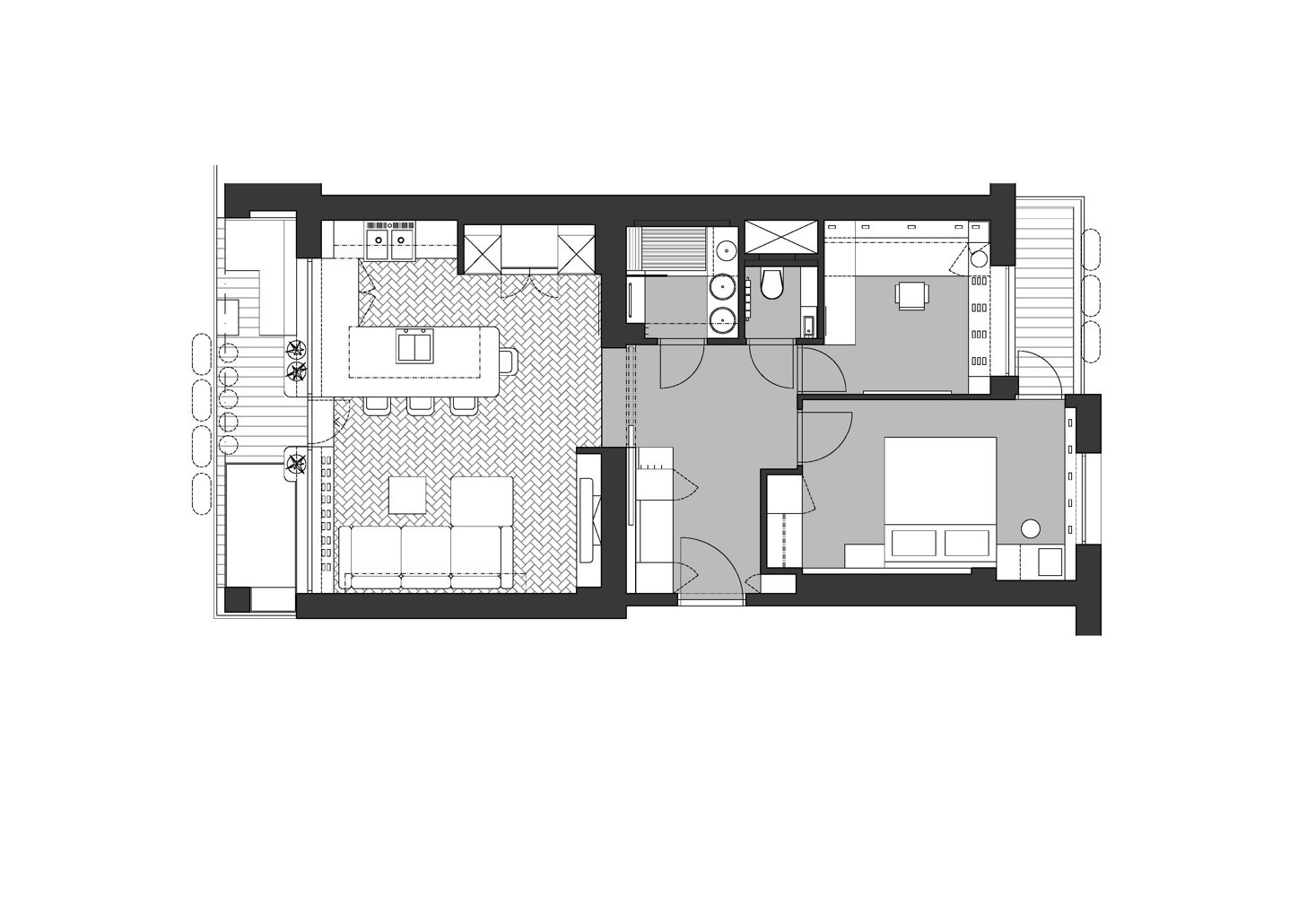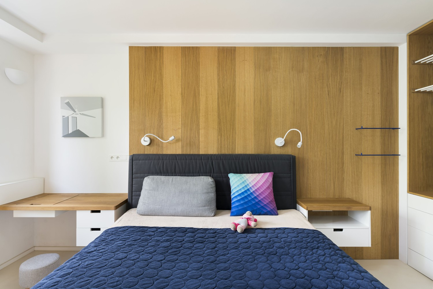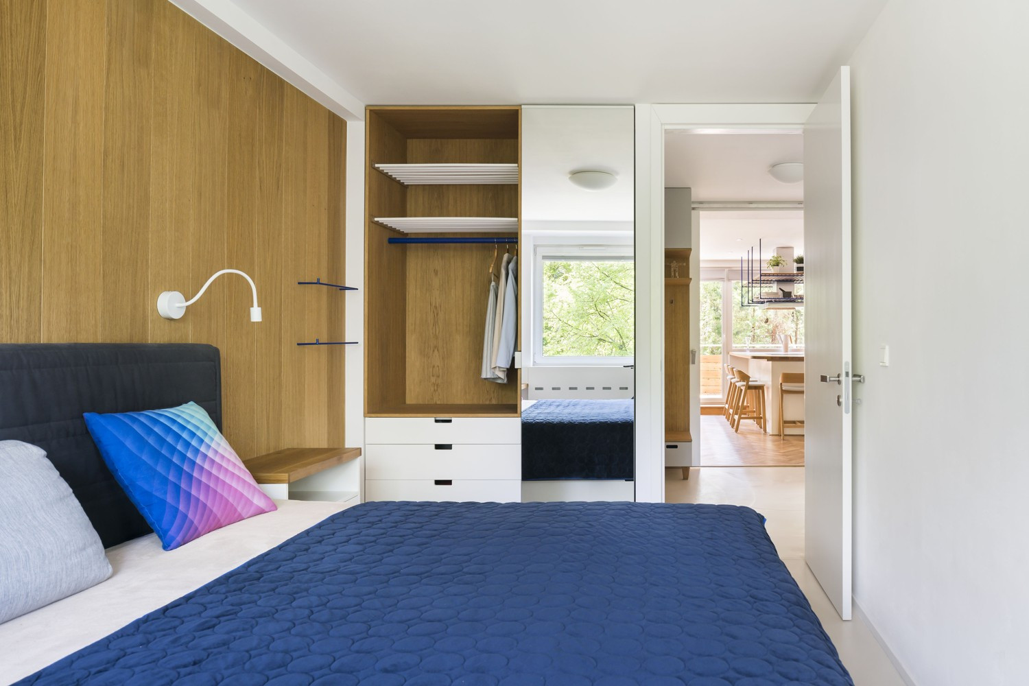 Architekti Jakub Filip Novák a Daniela Baráčková z pražského ateliéru No Architects proměnili typickou dispozici 3+kk ve svěží, vzdušné a elegantní bydlení, promyšlené do nejmenších detailů. Majitelé požadovali prostor ideální pro práci z domova, proto se dispozice bytu jemně otevřela. K pracovní rutině odkazují ocelové detaily v průmyslové modři, které ironicky poukazují na „stroje na bydlení“ skryté za dobovou typizovanou stavební produkcí. Doplněním o plnohodnotné užívání dvou lodžií navíc architekti vzkřísili původní myšlenku „bydlení v zeleni“.