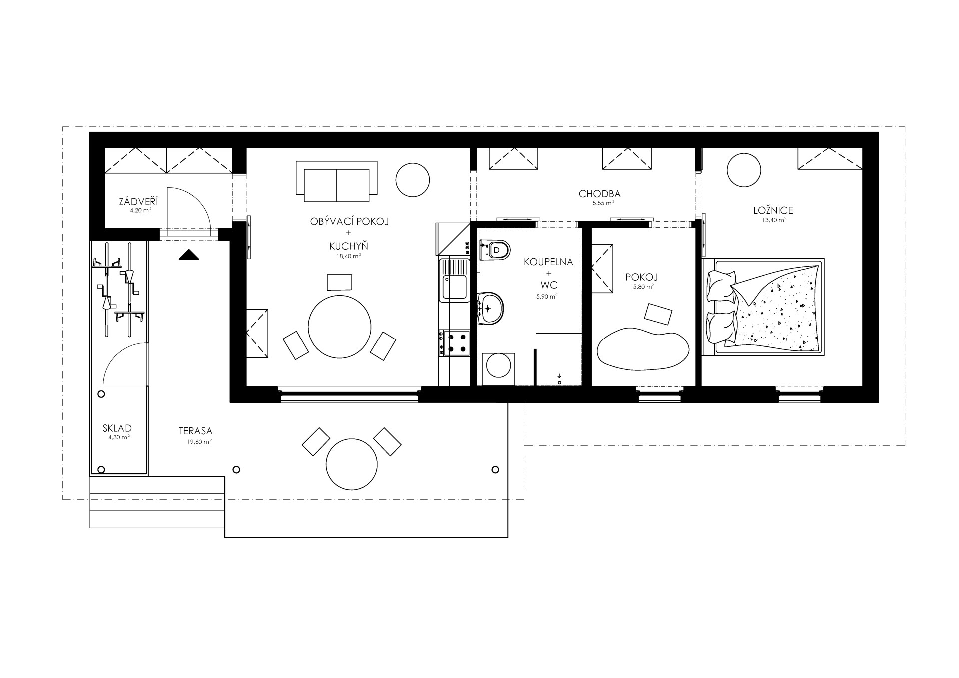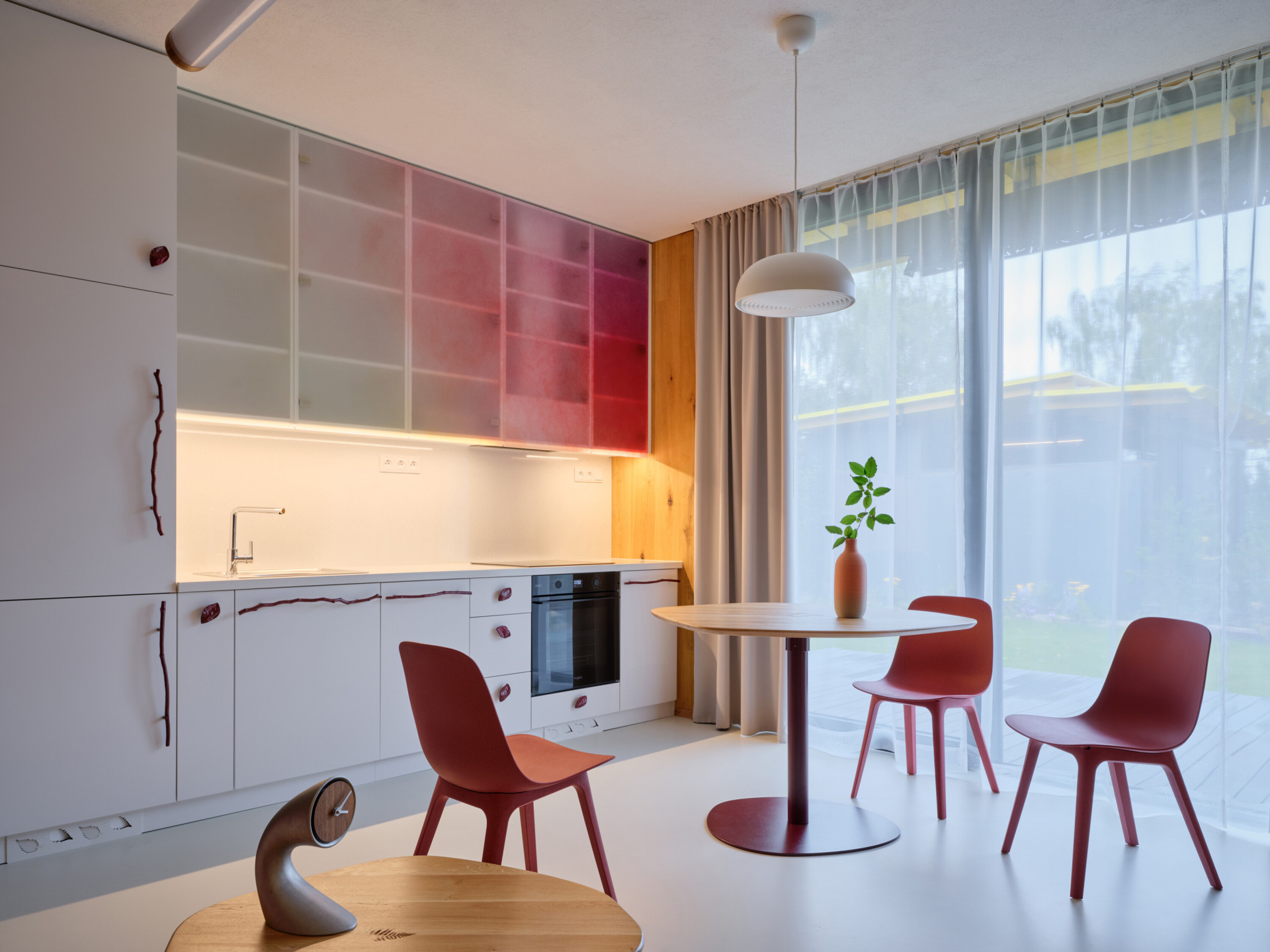 Každý z ateliérů má přibližně 58 metrů čtverečních a otevřenou dispozici. Hlavní obytný prostor doplňuje velké okno, které zároveň funguje jako vstup do zahrady a navazuje na něj terasa. Dále se dovnitř vešla ložnice, menší pokoj, koupelna i zádveří a malý sklad – třeba na kola. V malých domcích je tedy vše, co je běžně k životu potřeba.