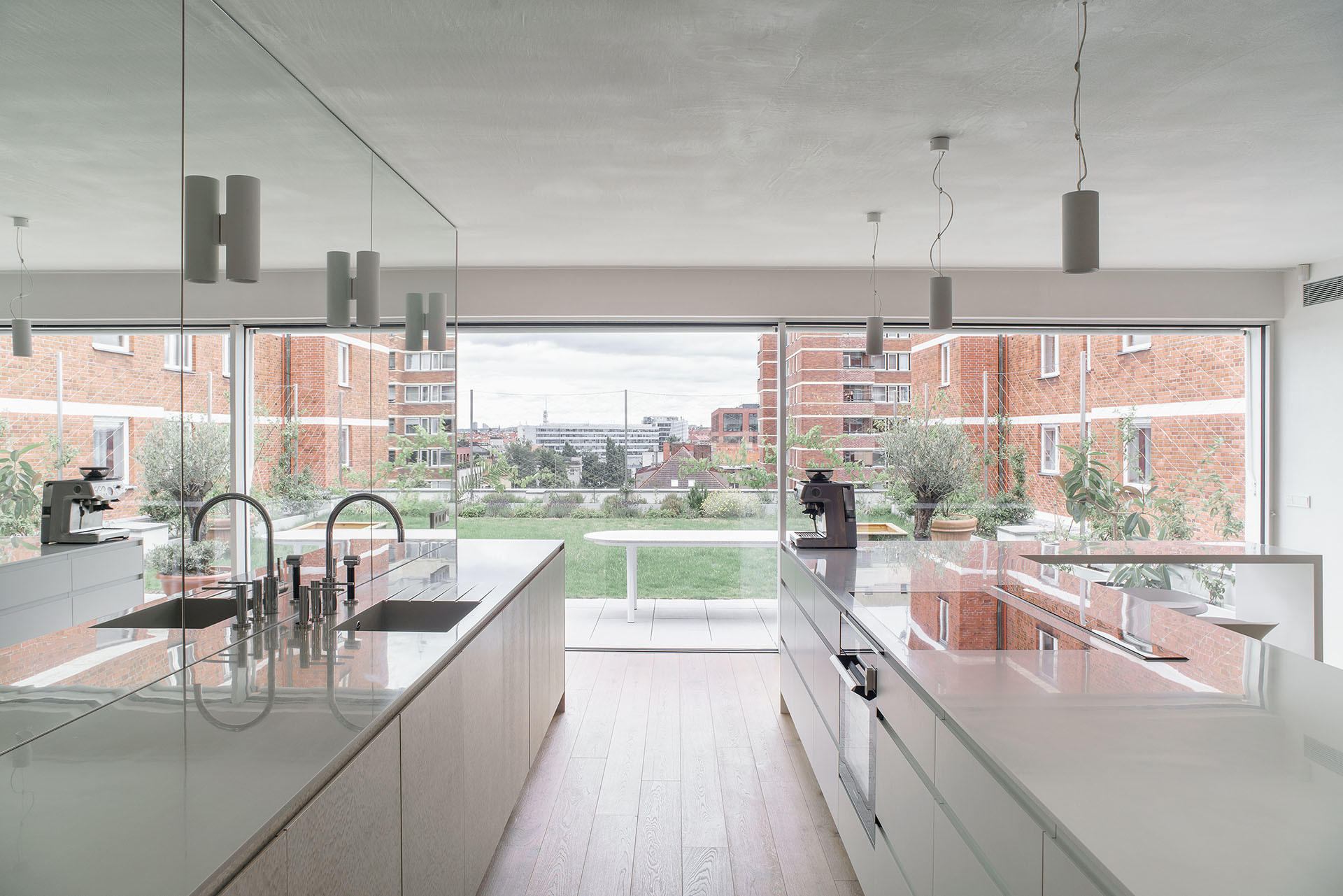 Nízkou kubickou nástavbu s bílou fasádou navrhli Petr a Zuzana Nacházelovi. Jejich cílem bylo, aby se nový dům na střeše stal co nejméně nápadným. Když by na původní stavbu přišlo celé nové patro, sousedům v okolních bytových domů by to navíc ubralo na oslunění i soukromí. Uměřený objem velikosti rodinného domu proto funguje jako fér kompromis pro všechny strany a zároveň jako chytré architektonické gesto: individuální bydlení se vejde tam, kde by ho člověk nečekal, a dokonce i se zelení.