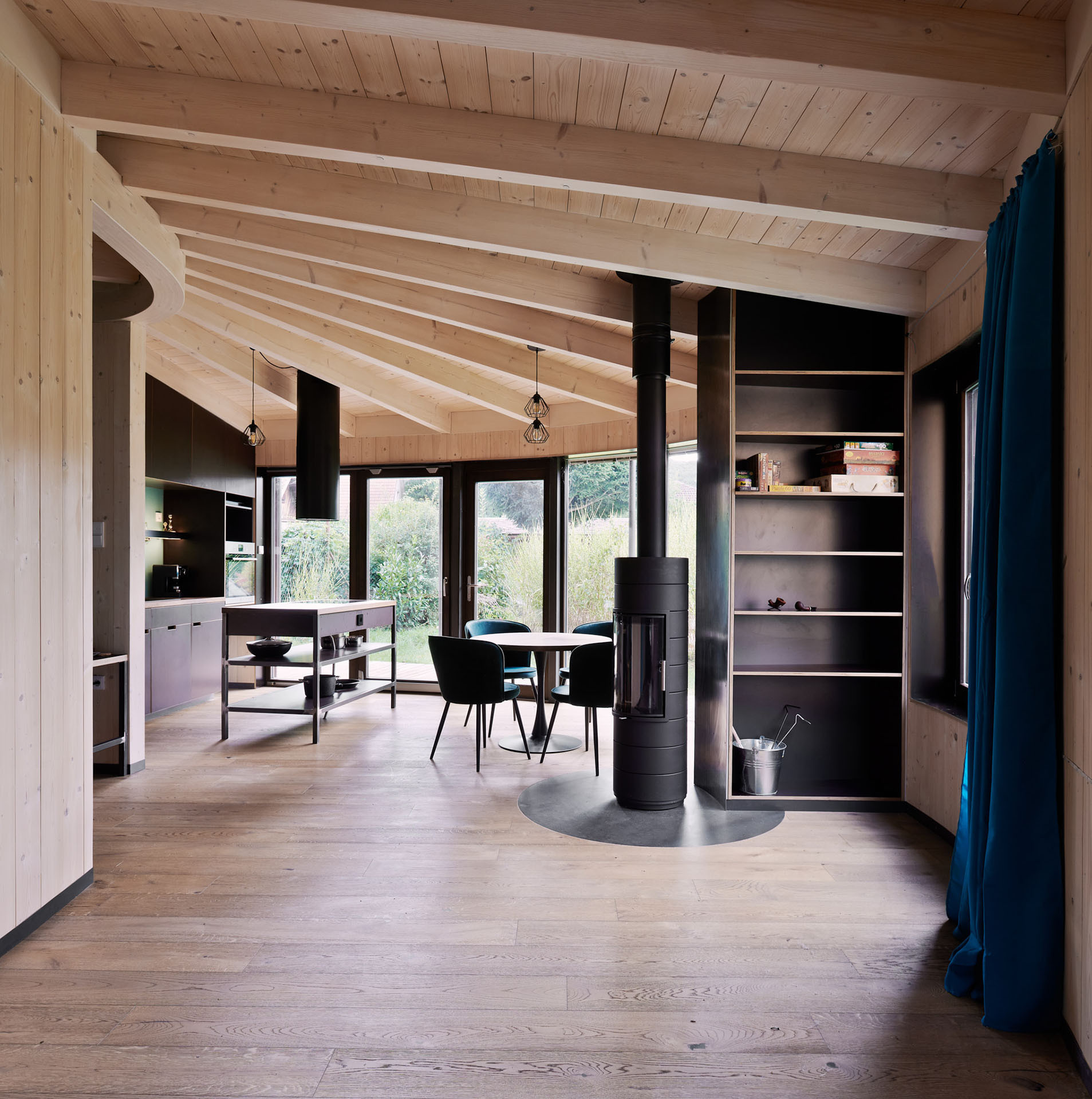 Dům v Chřibské z osmdesátých let zrekonstruovaný podle návrhu 0,5 Studio patří mezi ty přesvědčivé příklady. Zvenku ho nejvíc definují zelené okenice a rámy oken – jednoduchý zásah, který obyčejnému domu se sedlovou střechou dodal osobitost. A uvnitř? Tam stojí za pozornost převýšený obývací pokoj s cihlovým krbem a zelenou knihovnou, která vytváří efektní portál nad jídelním stolem.