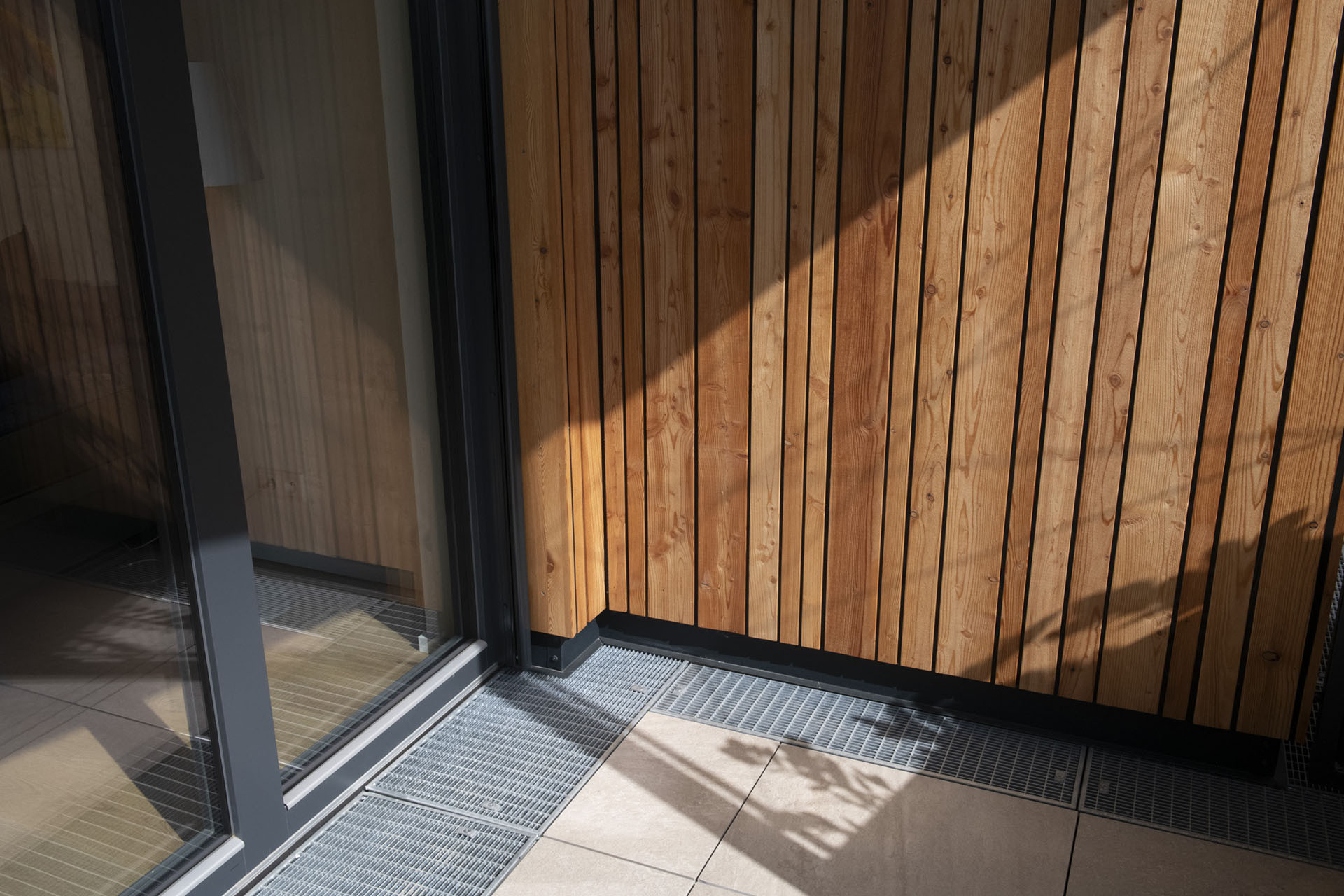 Dřevo je na fasádě (modřín), na stropech a části stěn (smrkové CLT panely). Působí to vlídně.