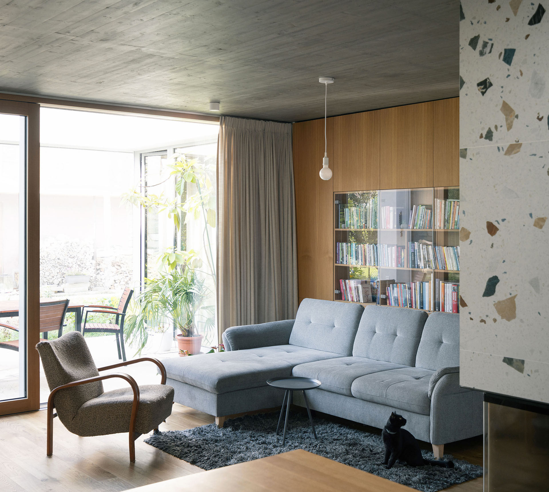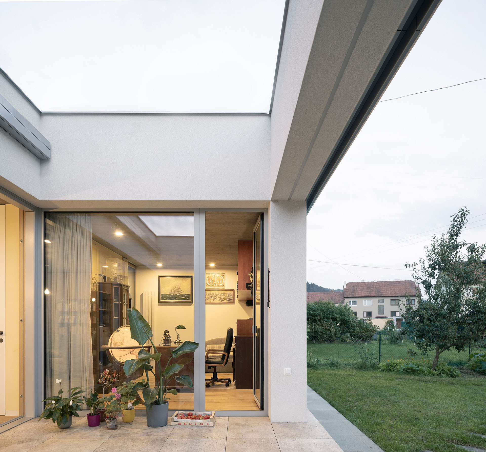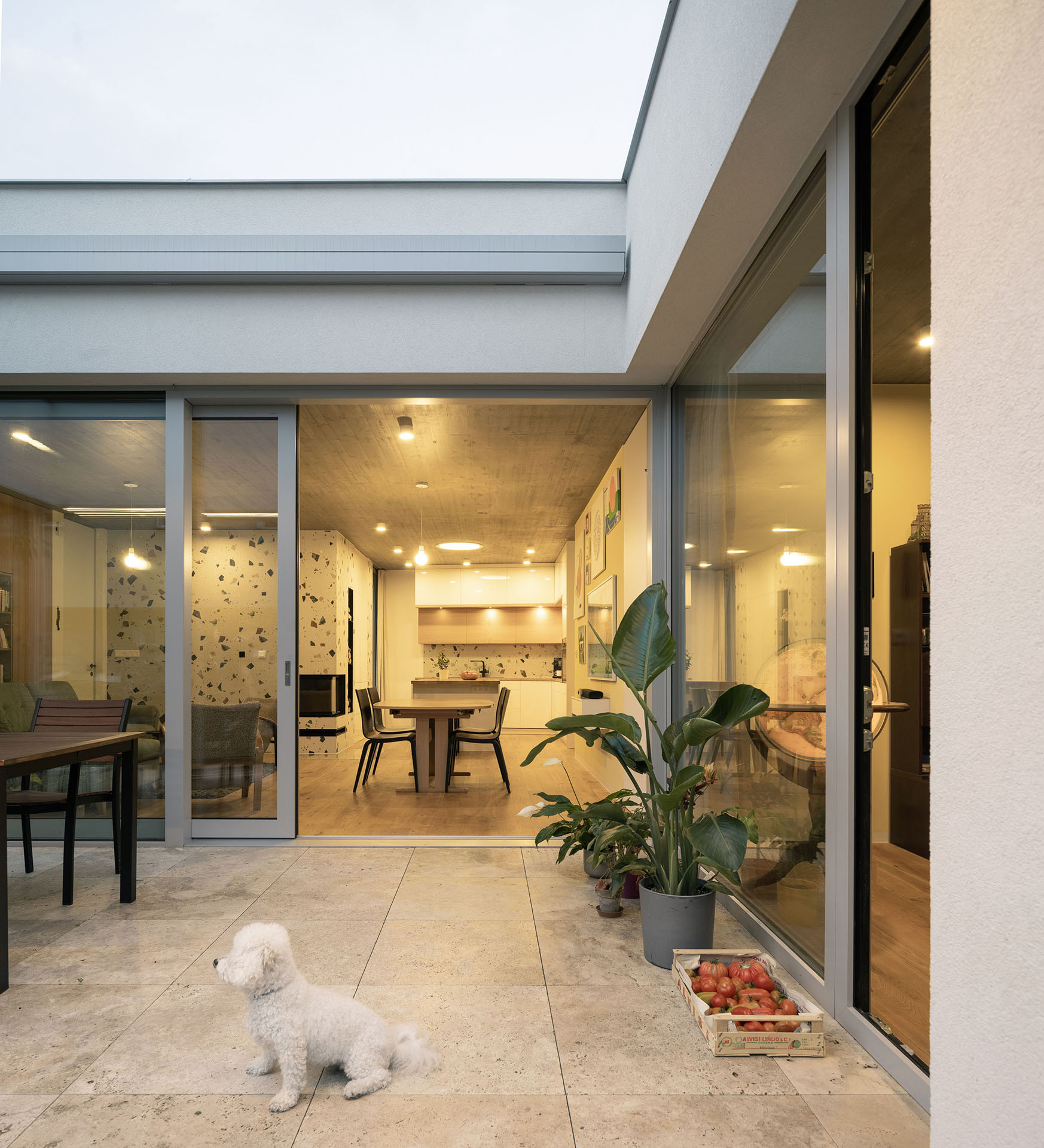 Atria z většiny nejsou určená k pobytu. V jednom, tom největším, je ale terasa, navazuje na velký obývací pokoj s kuchyní uvnitř domu. Dá se na ni vyjít taky z pracovny a ložnice, tedy všech hlavních místností jednopodlažního domu.