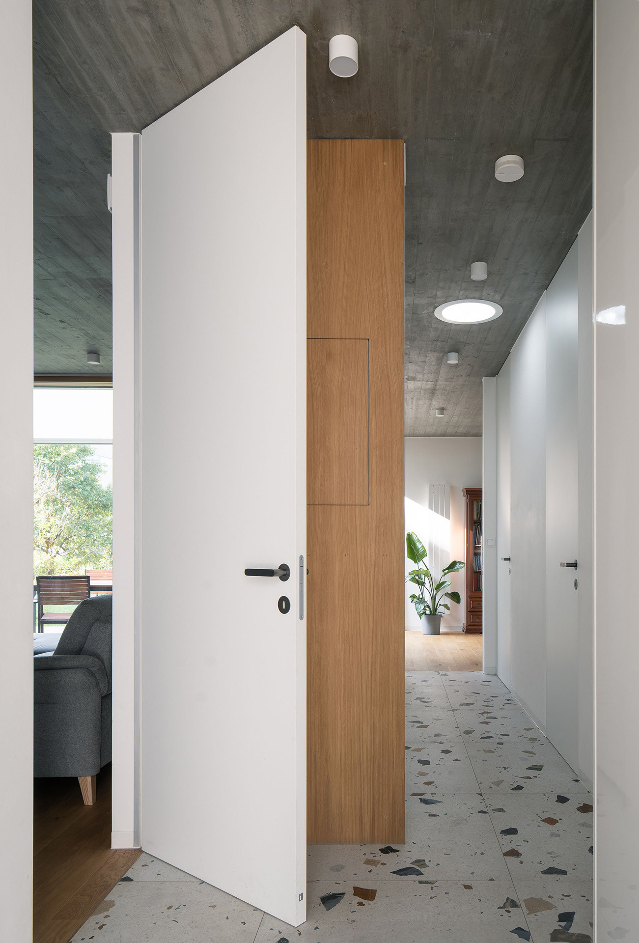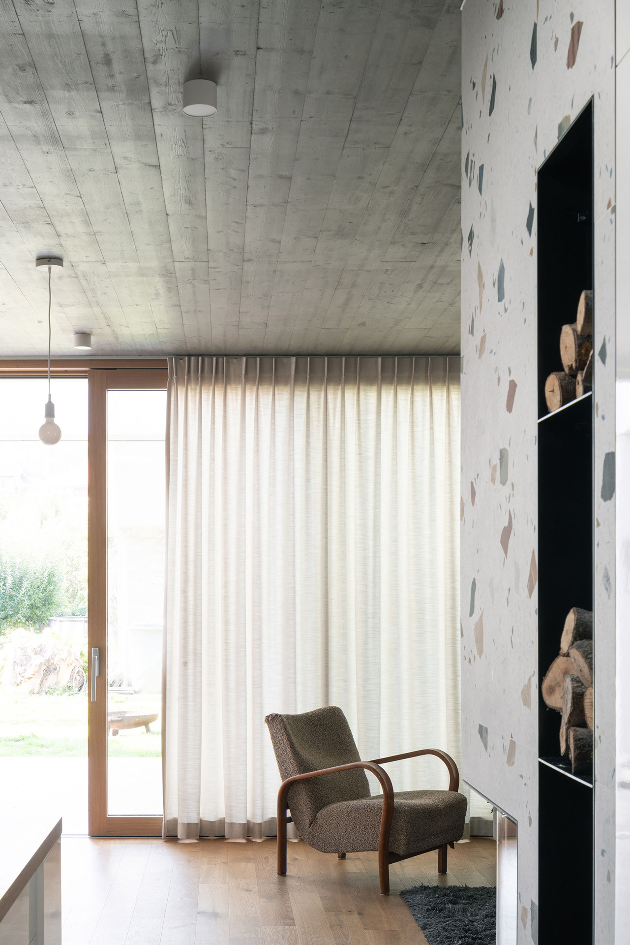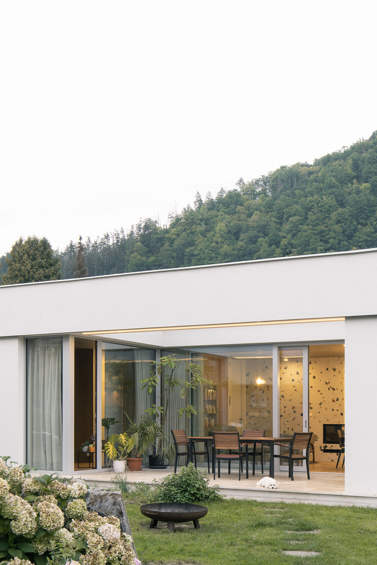 Atria z většiny nejsou určená k pobytu. V jednom, tom největším, je ale terasa, navazuje na velký obývací pokoj s kuchyní uvnitř domu. Dá se na ni vyjít taky z pracovny a ložnice, tedy všech hlavních místností jednopodlažního domu.