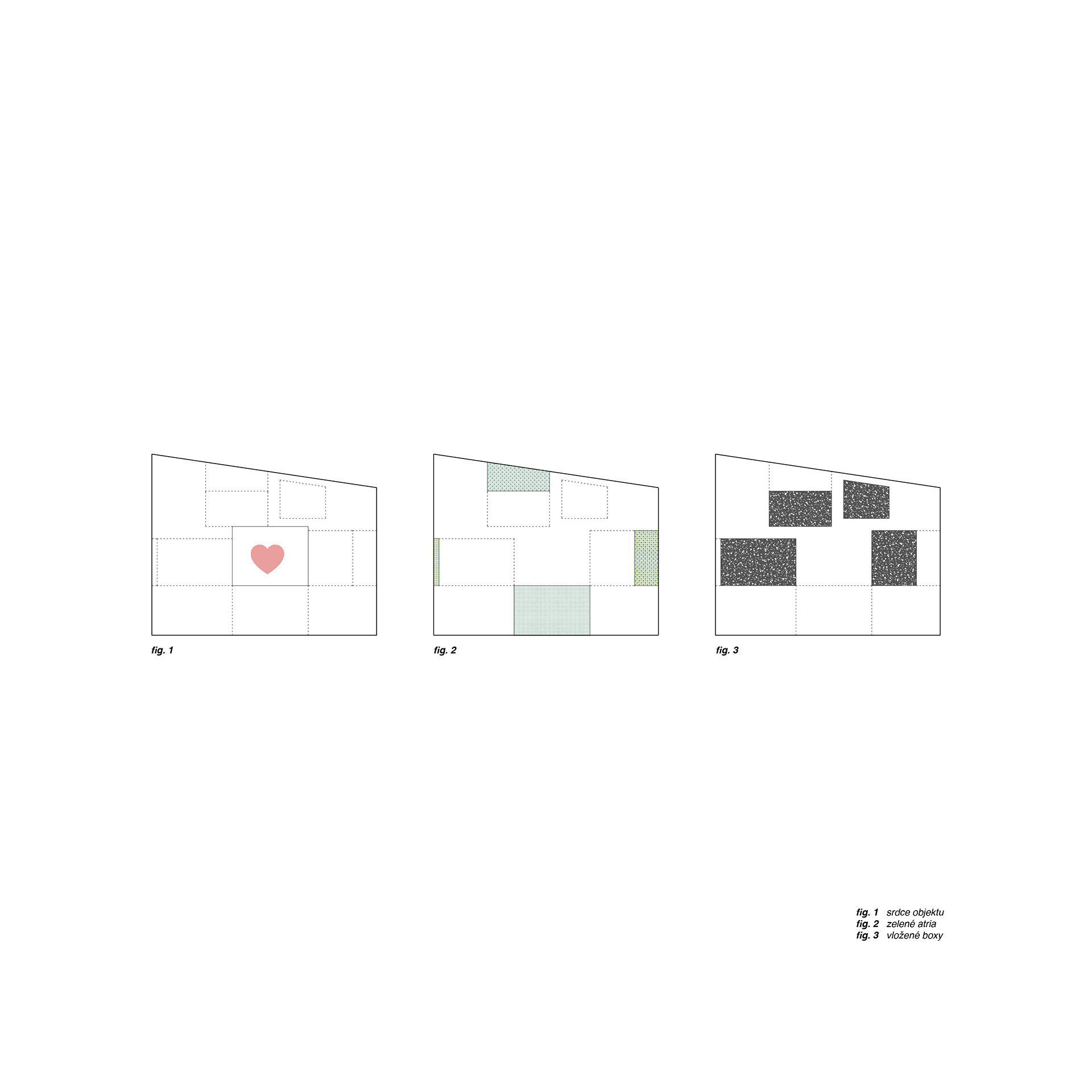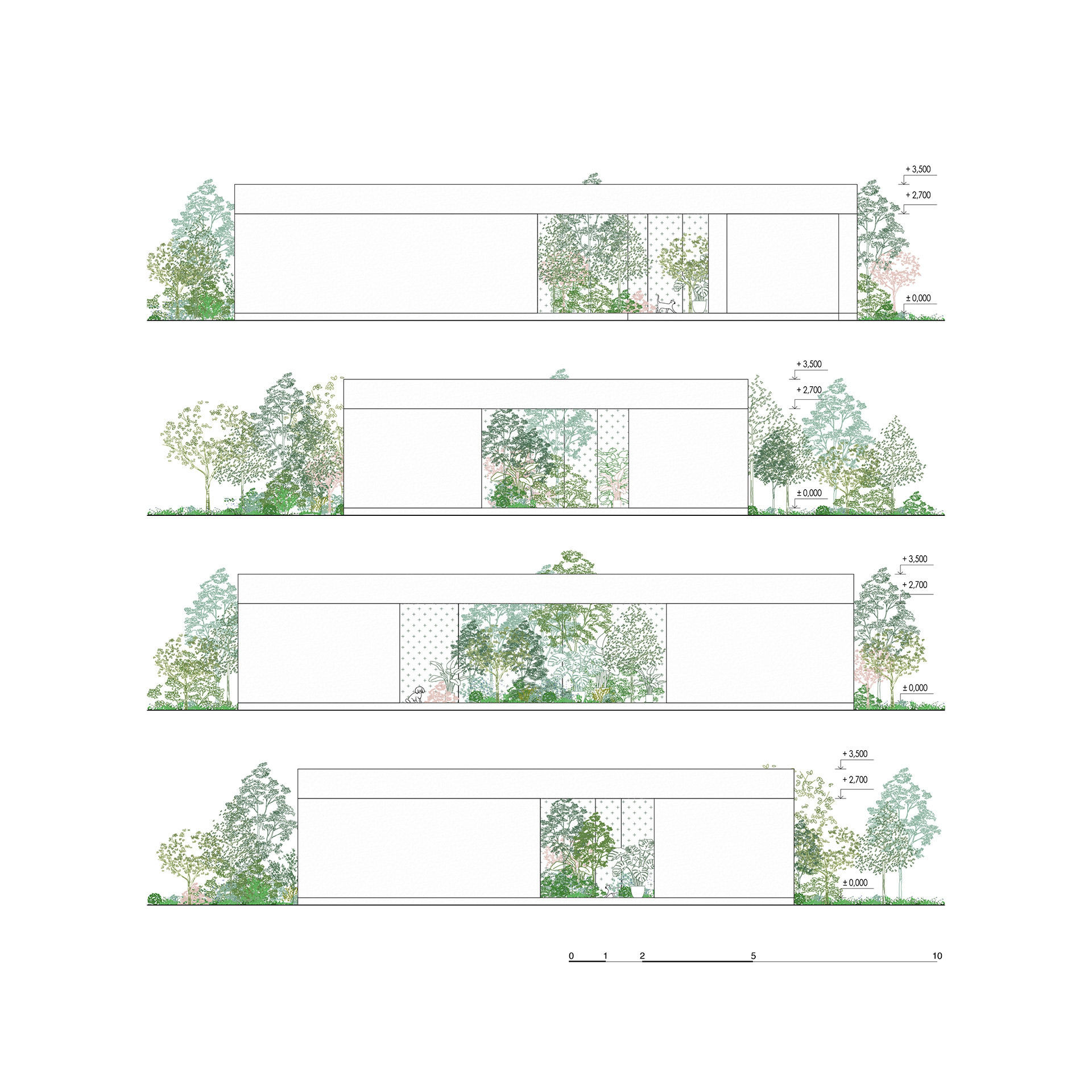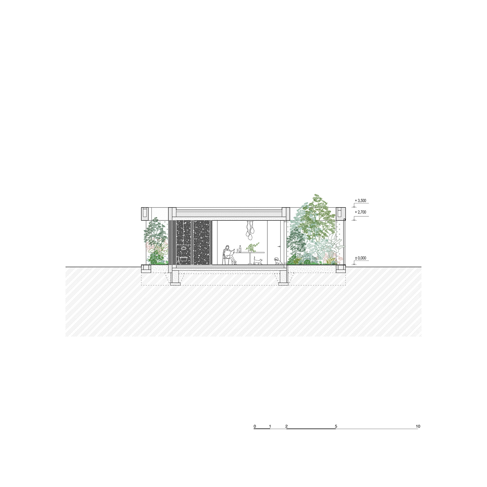 „Zelená atria na hraně domu vytvářejí plynulý přechod mezi exteriérem a interiérem, čímž propojují každodenní život s okolní zelení,“ píše k tomu Ivo Stejskal v autorské zprávě. Jedním z atrií se do domu rovněž vstupuje, orientované je k ulici.