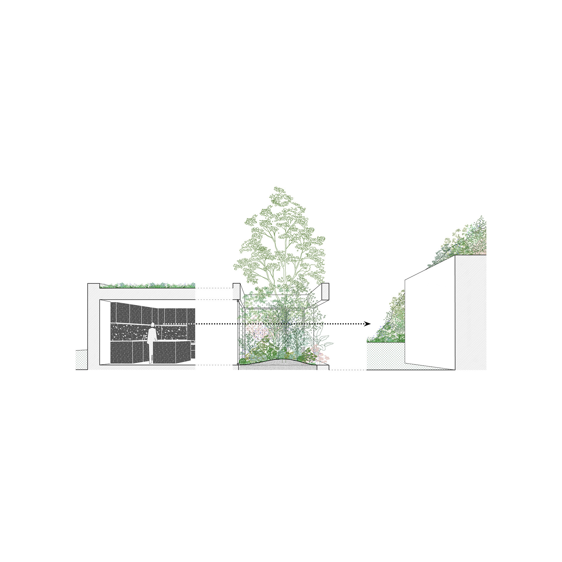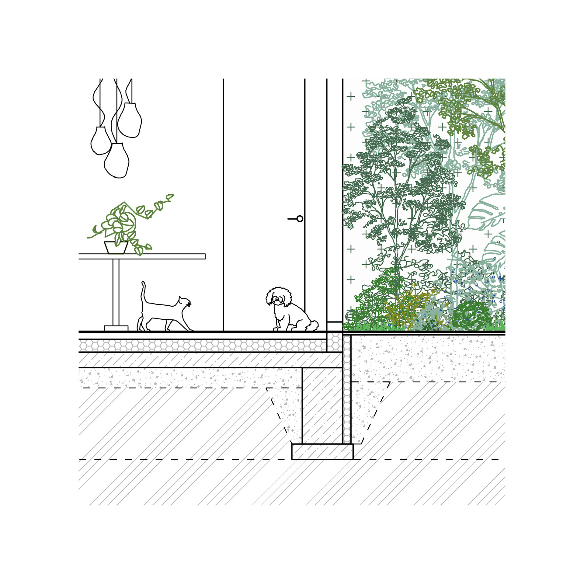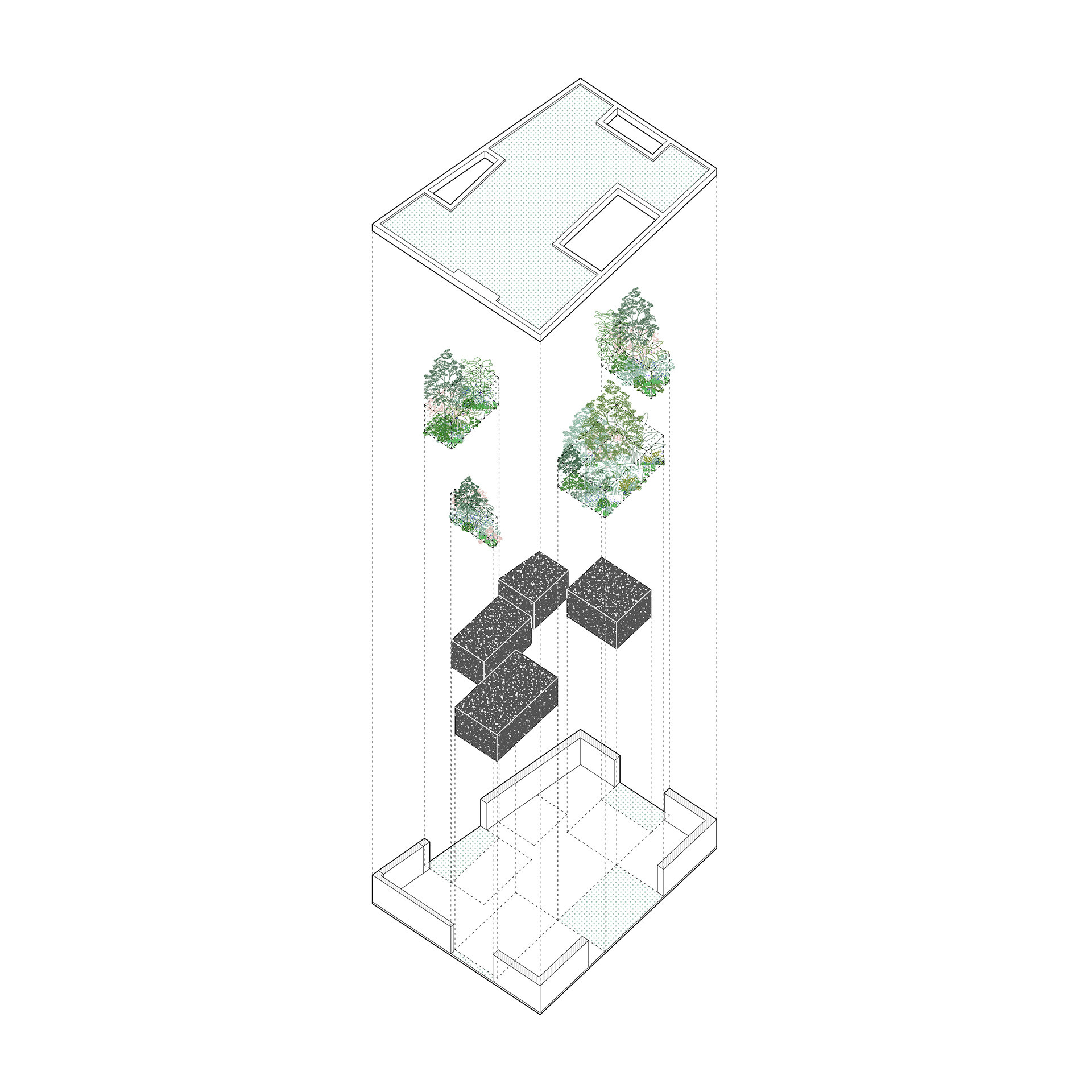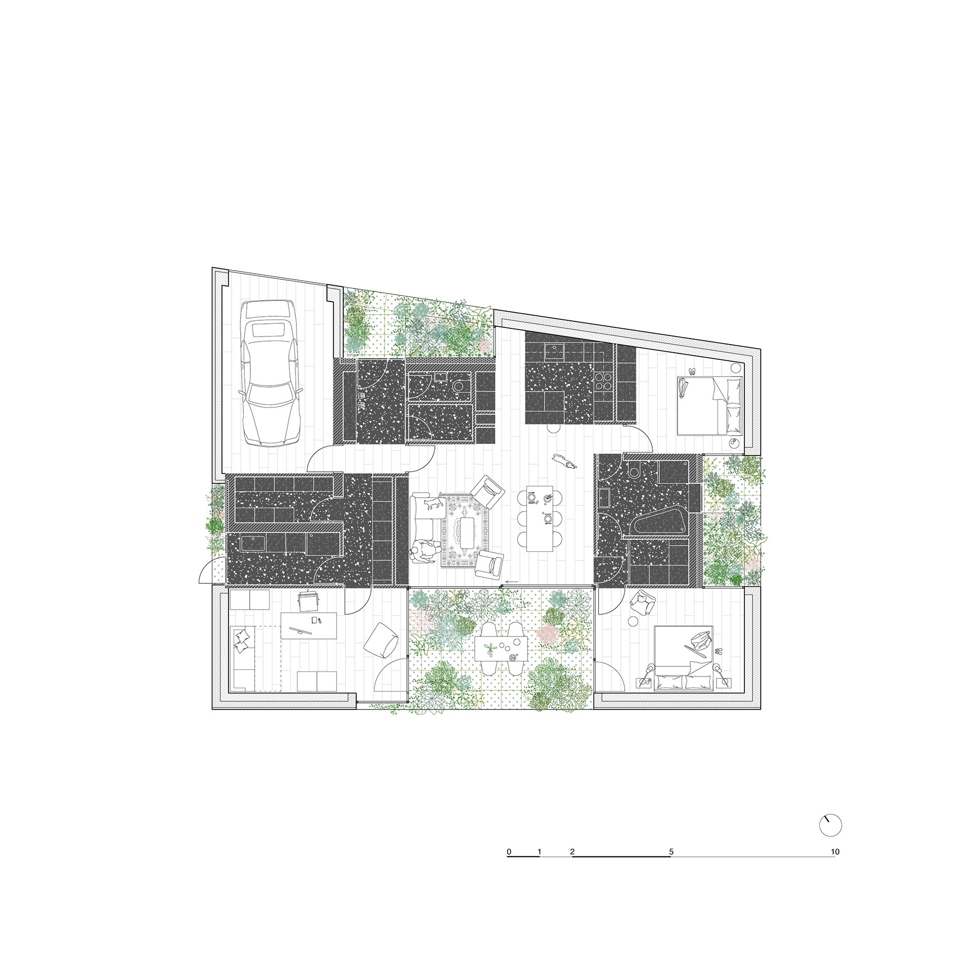 „Zelená atria na hraně domu vytvářejí plynulý přechod mezi exteriérem a interiérem, čímž propojují každodenní život s okolní zelení,“ píše k tomu Ivo Stejskal v autorské zprávě. Jedním z atrií se do domu rovněž vstupuje, orientované je k ulici.