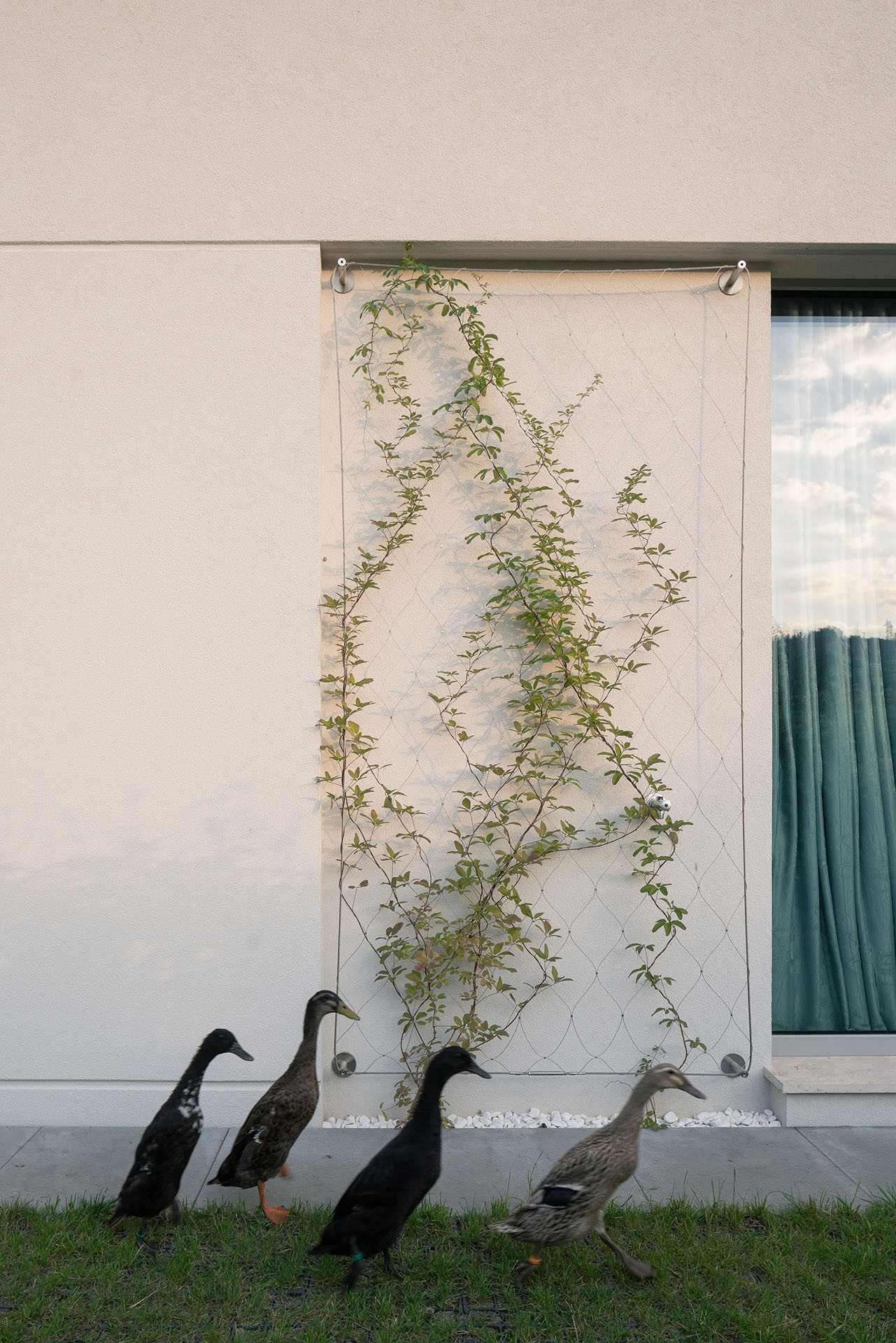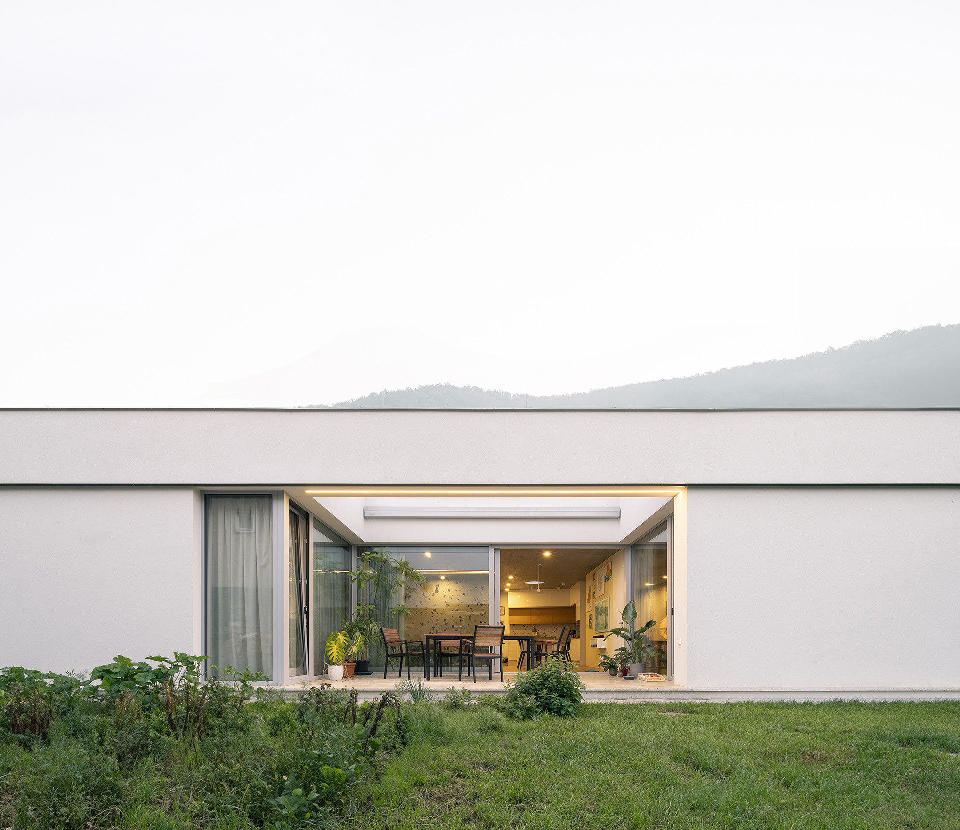 Klienti studia AOSI si přáli spojit moderní bydlení s klidem venkovského prostředí. Interiéry domu jsou proto vymyšleny a vybaveny dle současných představ. Místnosti jsou vzdušné s okny vysokými od dřevěných podlah až po betonové stropy. Laděné jsou do jemných, přírodních barev – hodí se tak k zeleni v atriích i okolní přírodě. Uvnitř a venku se přirozeně prolíná.