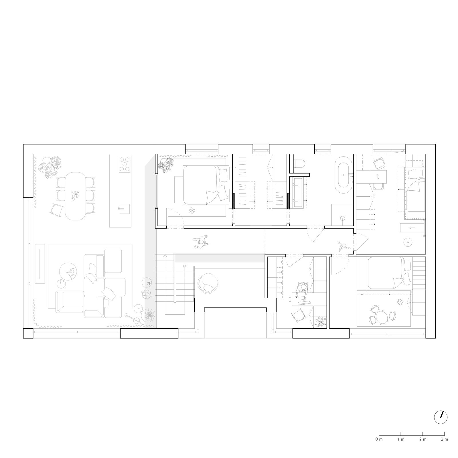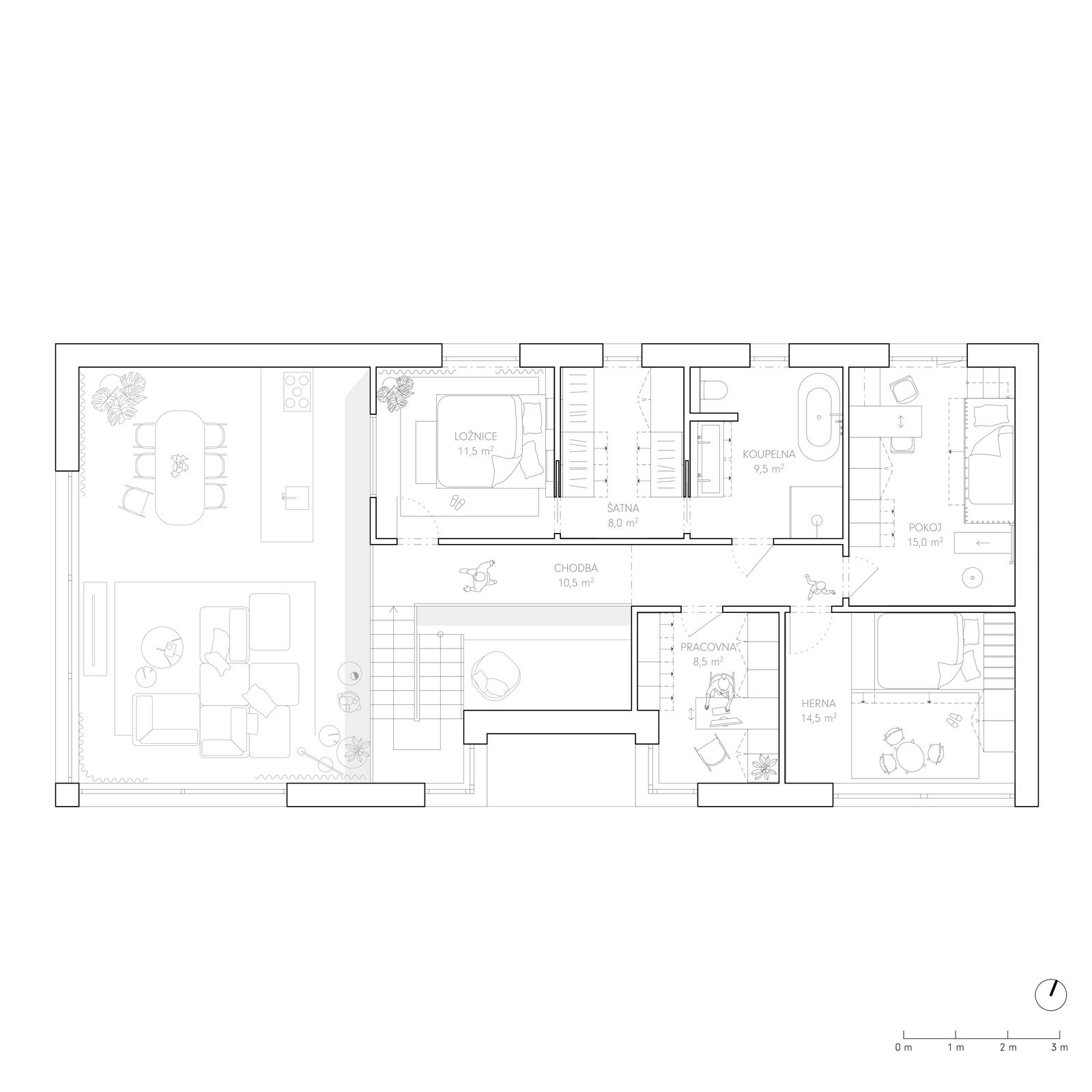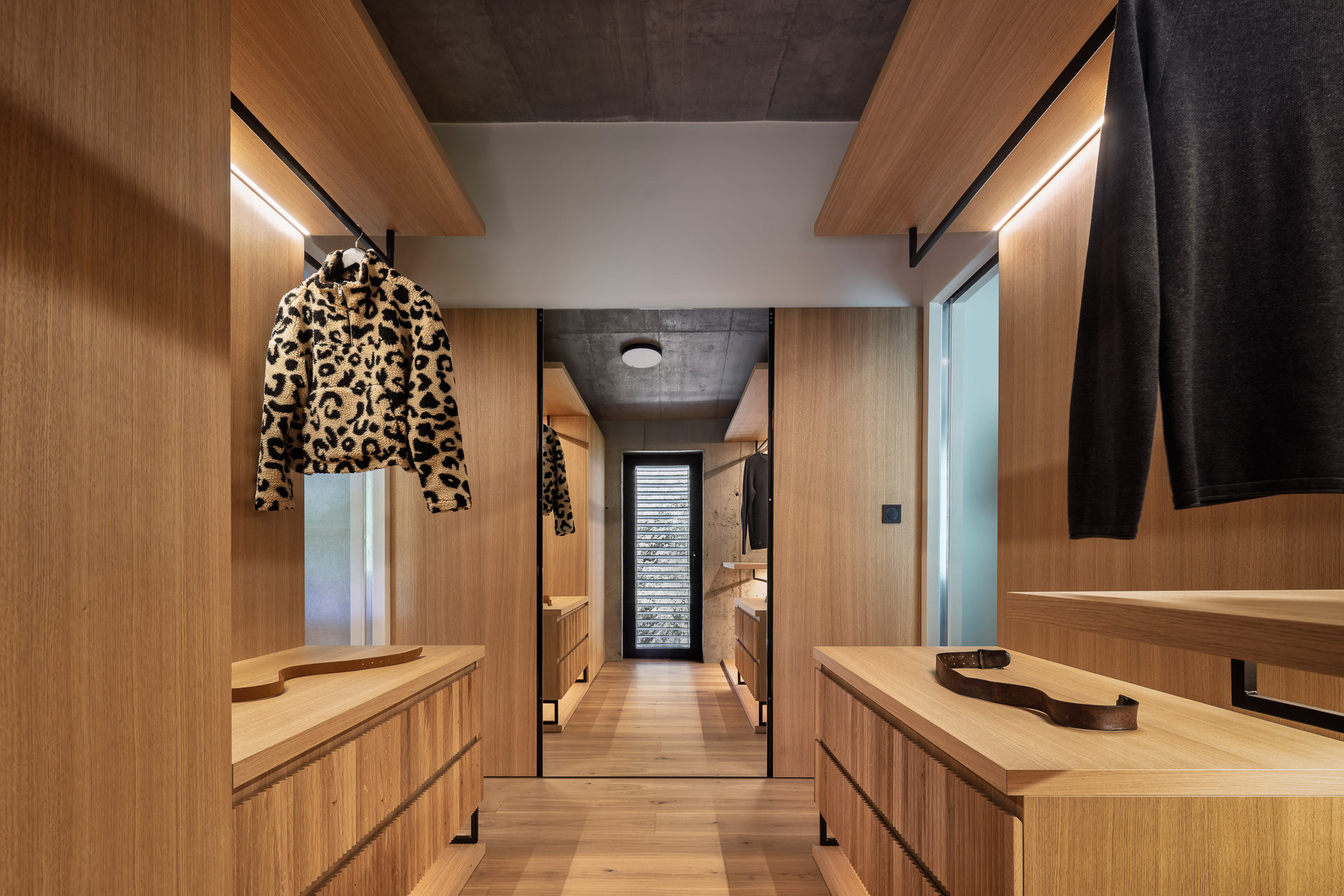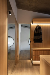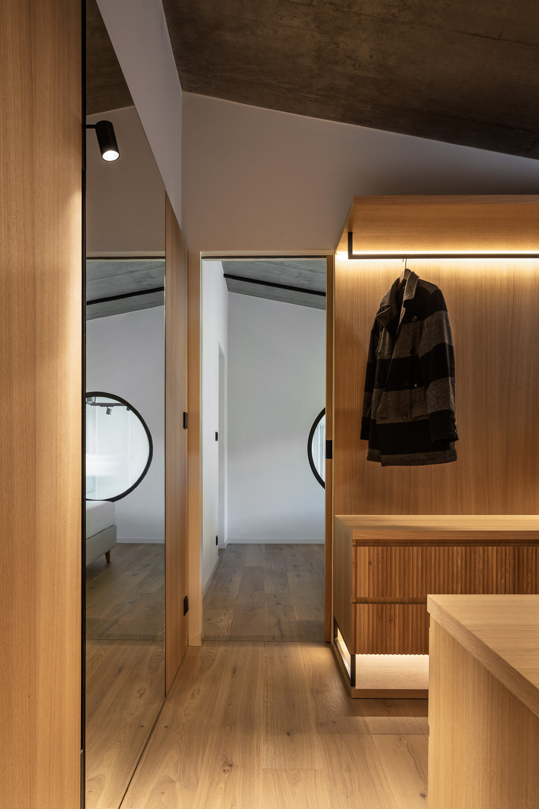 Patro je pak vyhrazené soukromým pokojům. Přímo nad kuchyní se nachází hlavní ložnice s kruhovým oknem, kterým je možné shlédnout dolů do obytného prostoru. „Celý rodičovský trakt je navíc propojen posuvnými dveřmi, díky nimž šatna navazující na koupelnu působí jako vestavěná skříň skrytá za obloženým čelem postele,“ popisují řešení prostoru architektky.