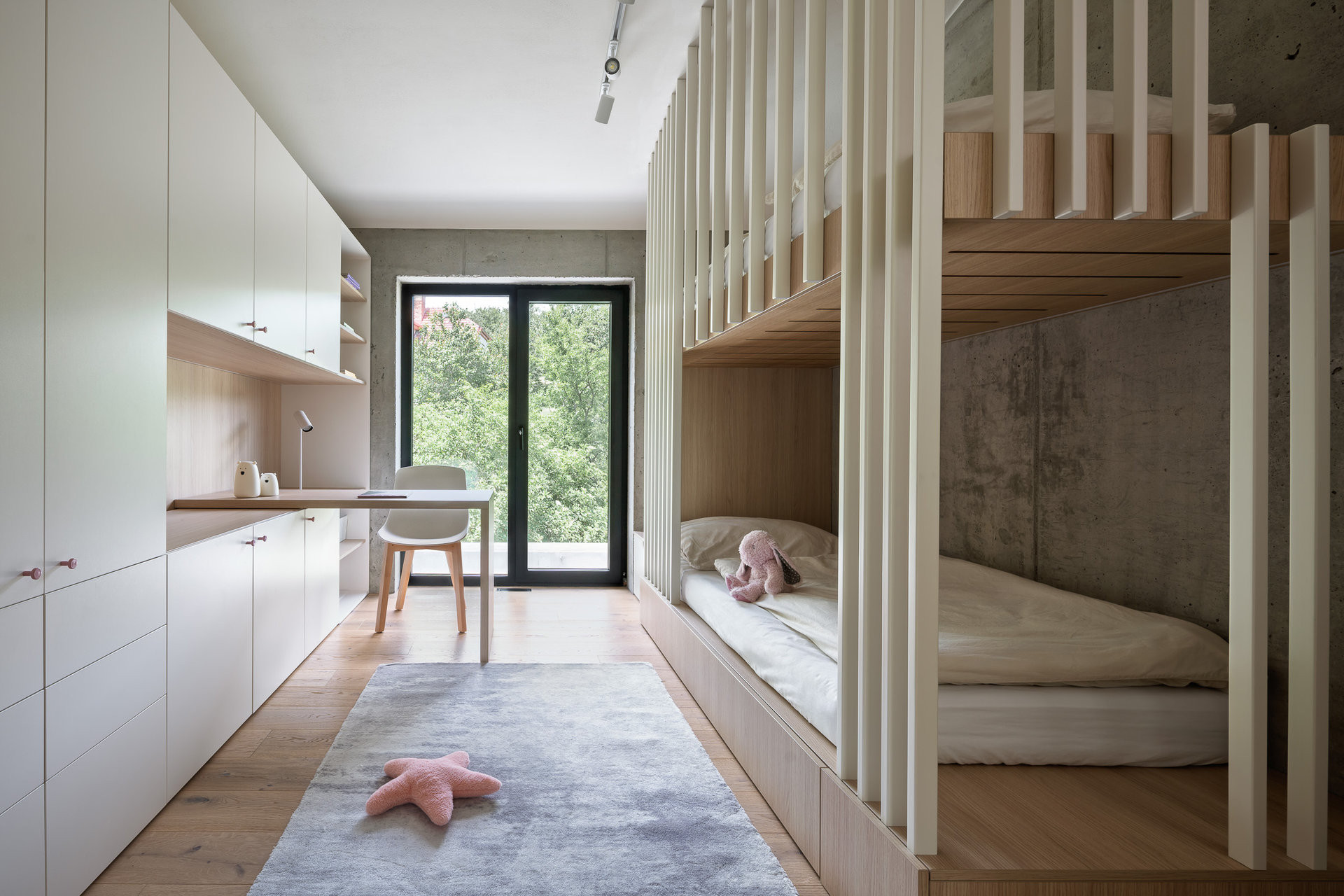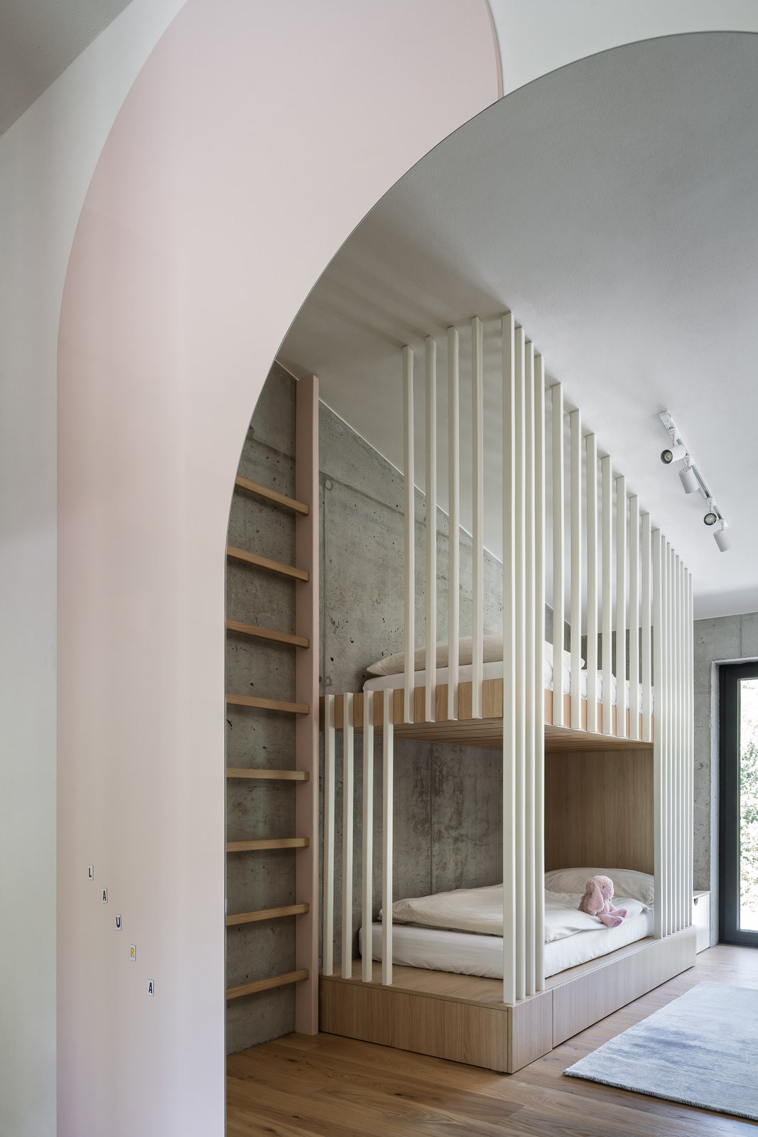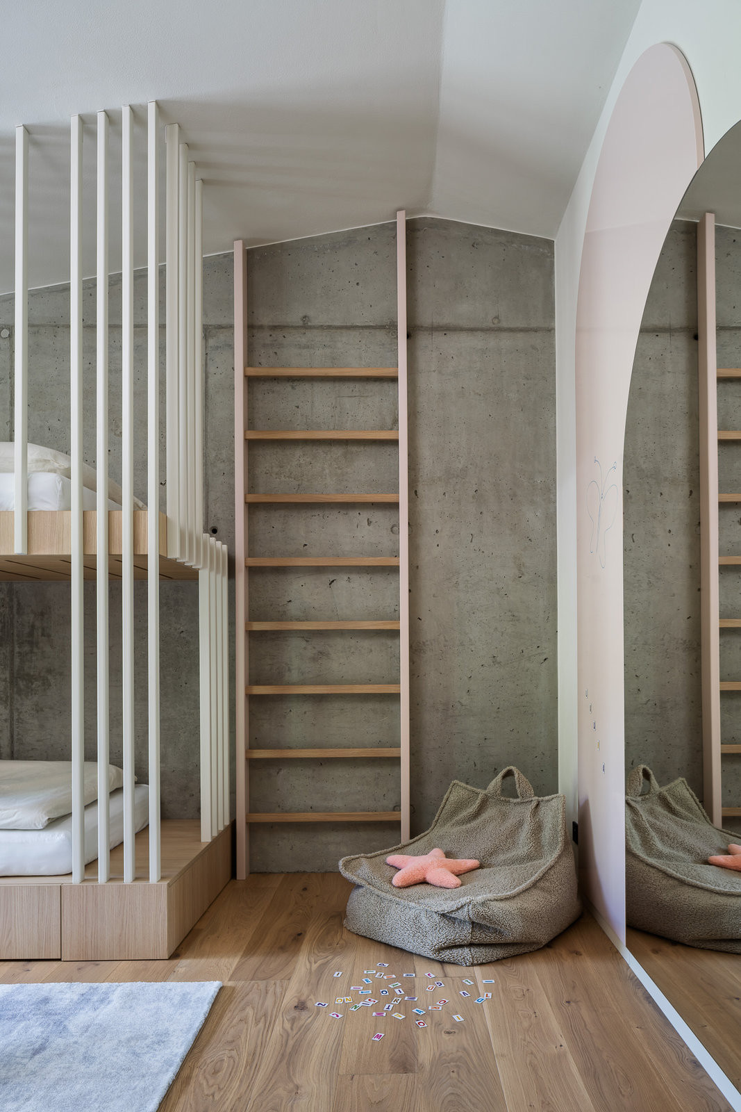 Další dva pokoje slouží dětem. V jednom se nyní spí, druhý funguje jako herna, do budoucna je ale možné je snadno proměnit na dva samostatné dětské pokoje. „Proto je návrh materiálově neutrální a ‚rostoucí‘ – snadno se přizpůsobí měnícím se potřebám,“ vysvětlují architektky. Vybavení působí nadčasově, zároveň ale obsahuje řadu herních prvků: žebřiny, nástěnky na kreslení fixami i magnety. Ty jsou tvarované do oblouku, stejně jako zrcadla, takže spolu vzájemně ladí.