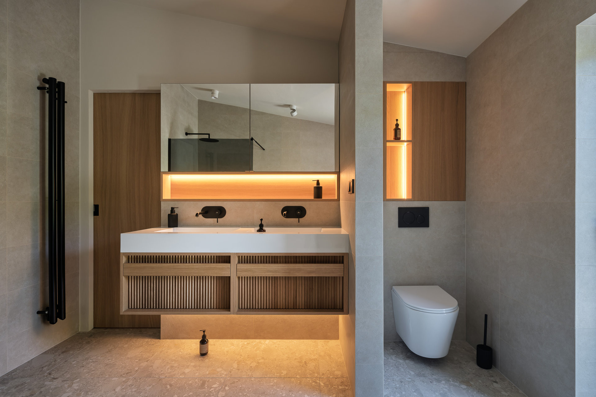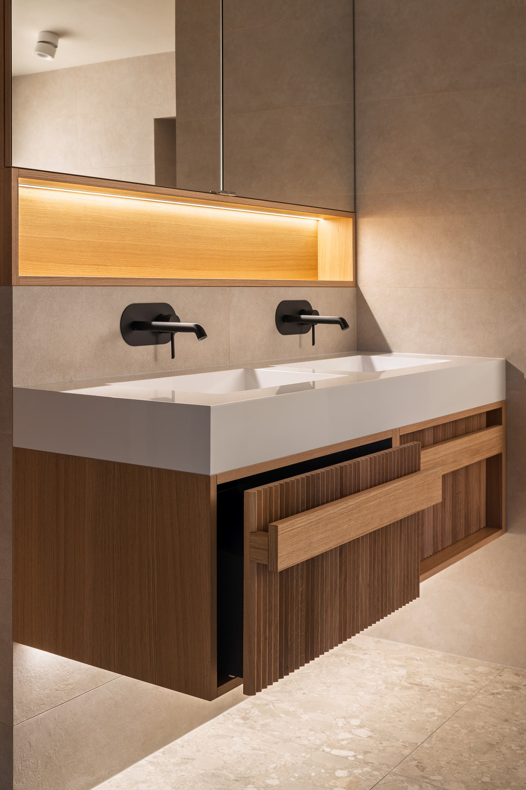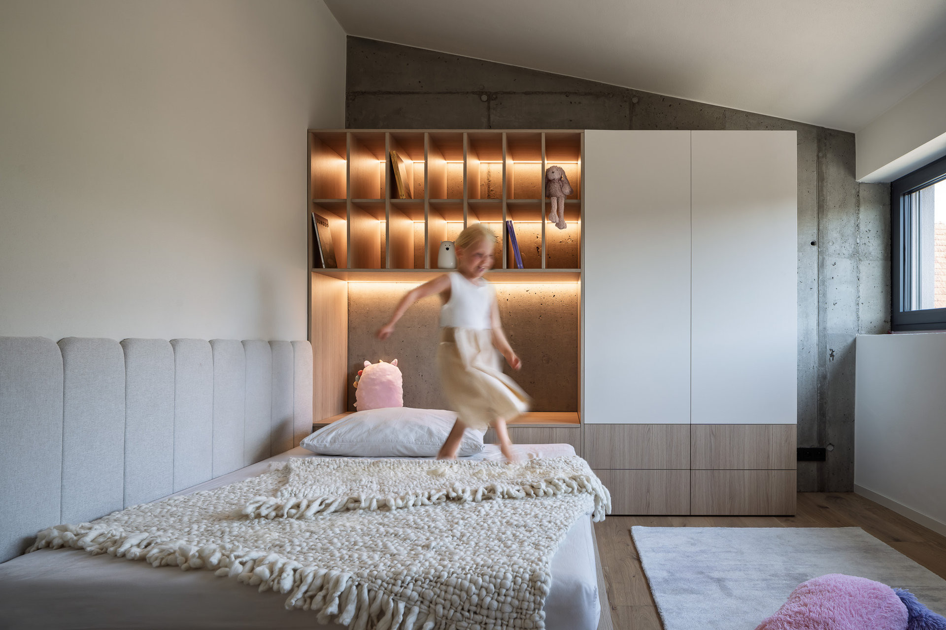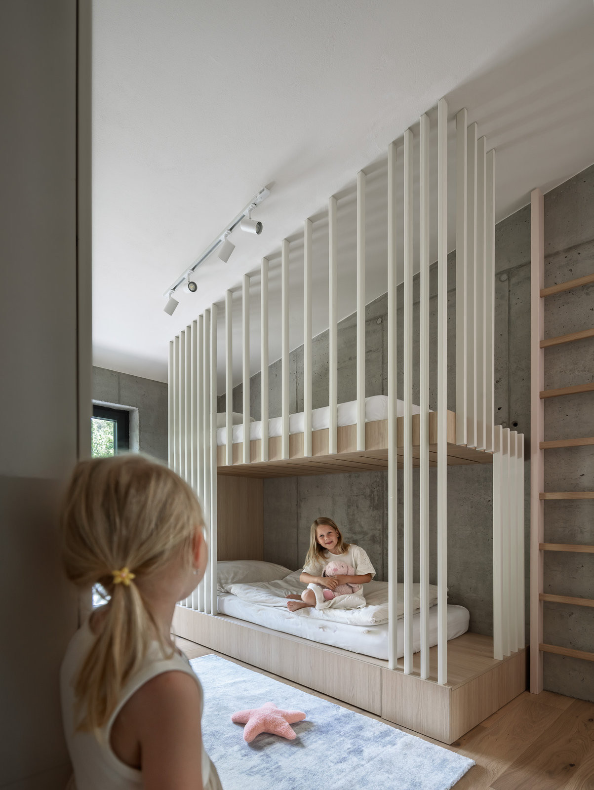 Další dva pokoje slouží dětem. V jednom se nyní spí, druhý funguje jako herna, do budoucna je ale možné je snadno proměnit na dva samostatné dětské pokoje. „Proto je návrh materiálově neutrální a ‚rostoucí‘ – snadno se přizpůsobí měnícím se potřebám,“ vysvětlují architektky. Vybavení působí nadčasově, zároveň ale obsahuje řadu herních prvků: žebřiny, nástěnky na kreslení fixami i magnety. Ty jsou tvarované do oblouku, stejně jako zrcadla, takže spolu vzájemně ladí.