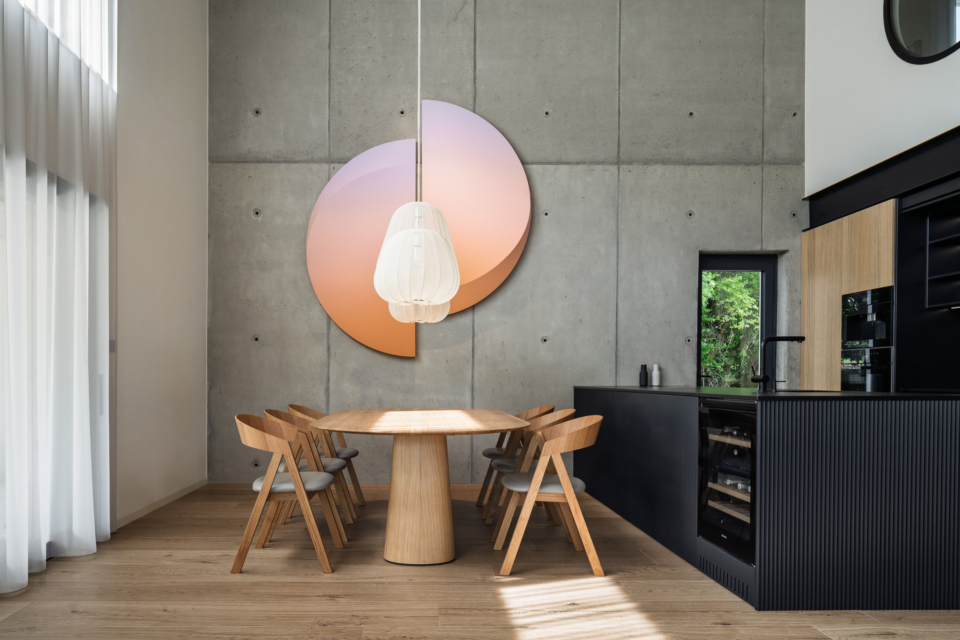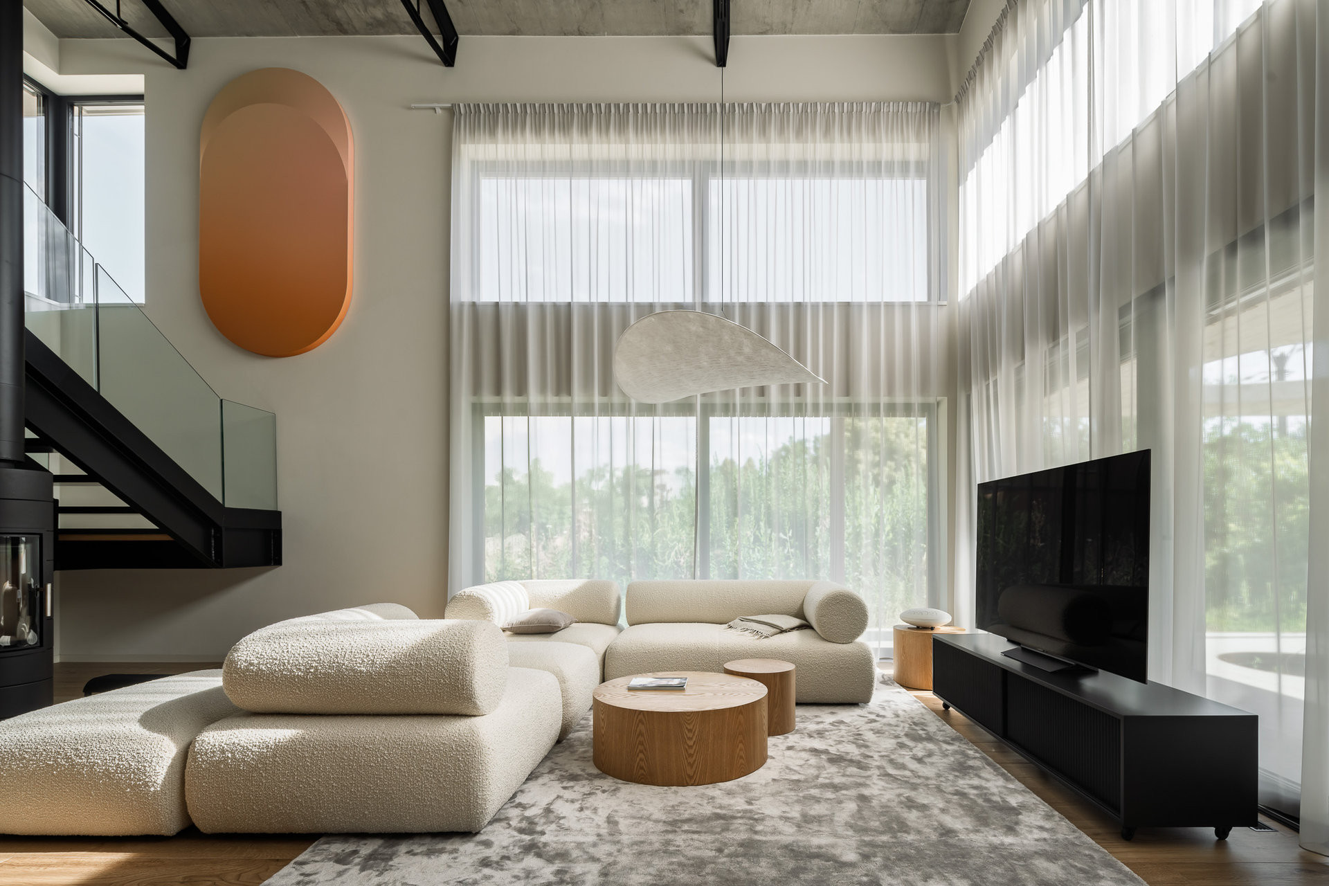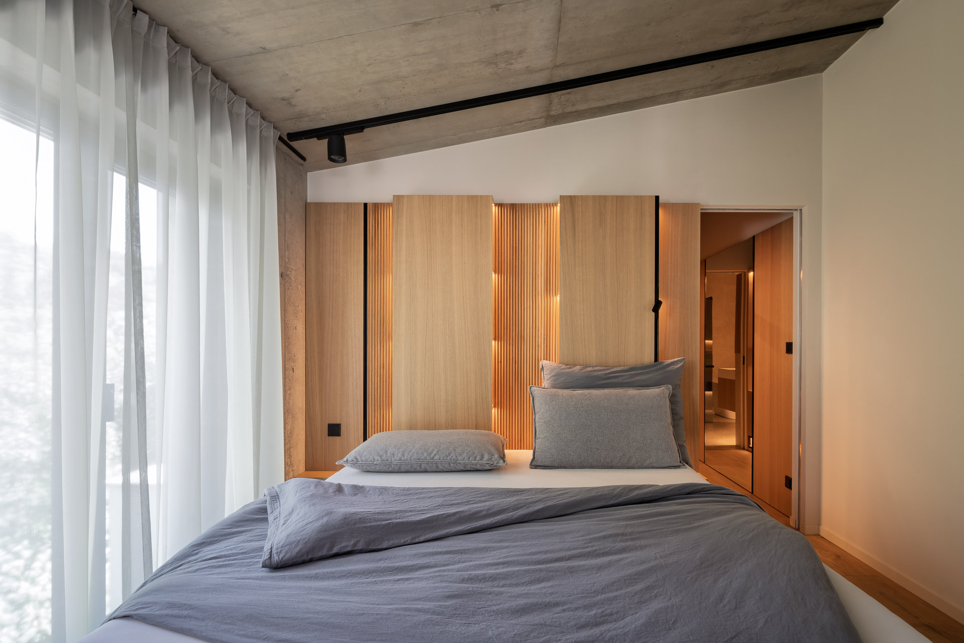 Co je pro všechny pokoje společné, je přítomnost pohledového betonu. Právě ten interiéru propůjčuje jeho syrovou atmosféru, pro architektky ale zároveň představoval výzvu – především z hlediska akustiky. Aby se zvuk, zejména v převýšeném obytném prostoru, tolik netříštil, pracovaly v návrhu s větším množstvím textilií. Od klasických závěsů a koberců až po méně obvyklá látková stínidla svítidel nebo akustické panely české značky Lappa, známé například z Designbloku. Tyto prvky industriálně pojatý interiér změkčují a navozují pocit domova.