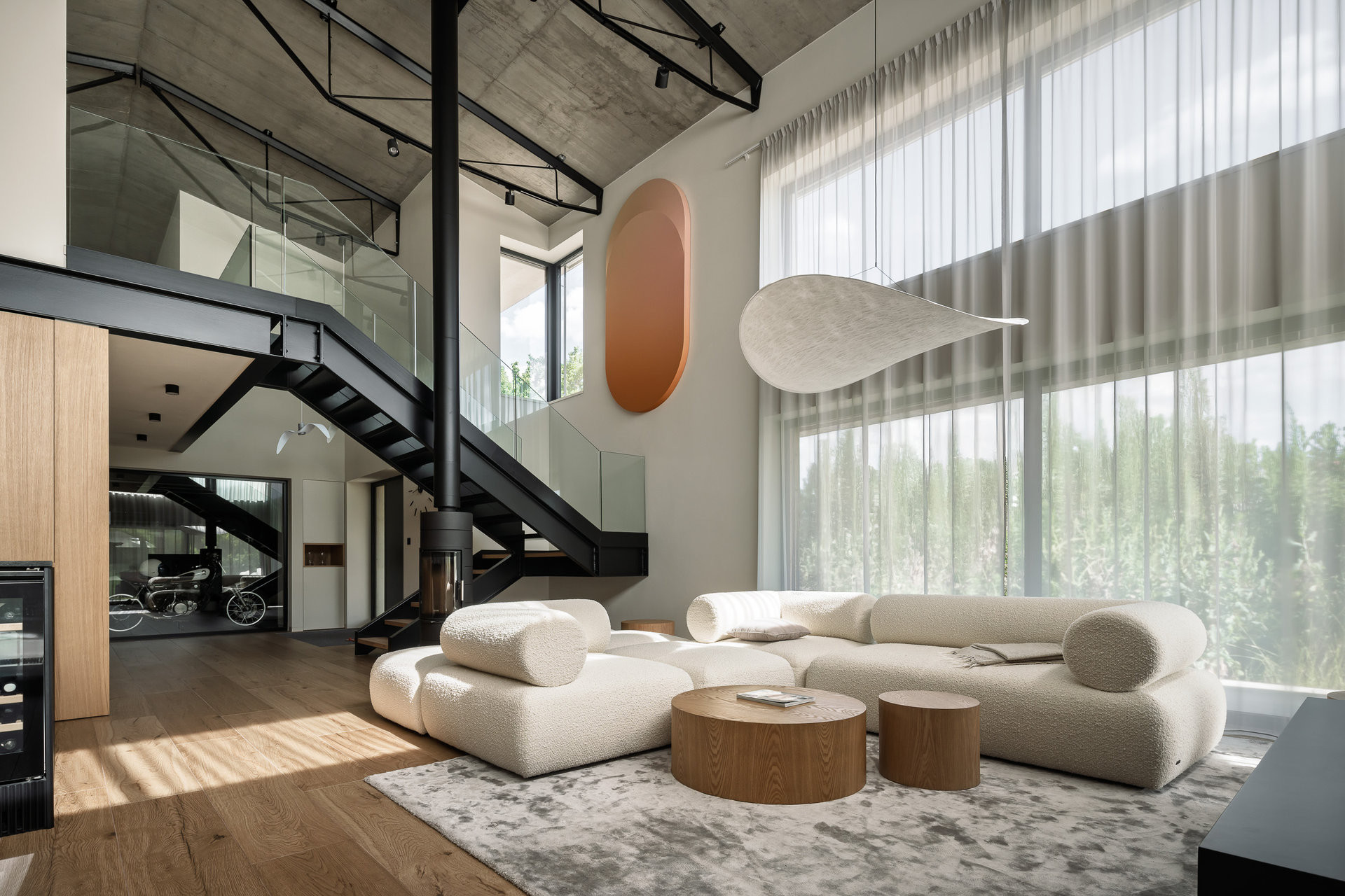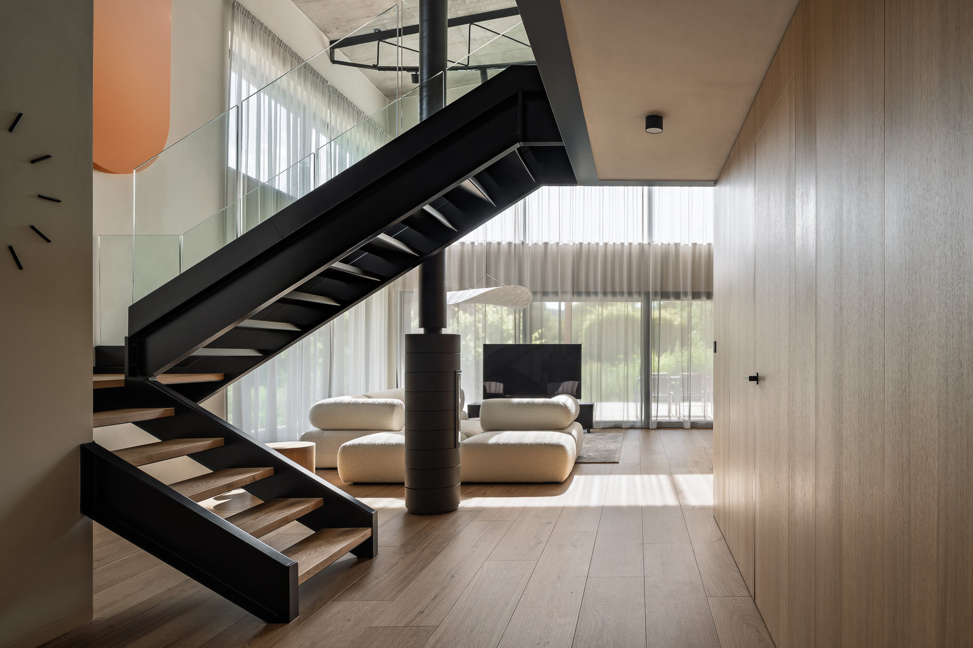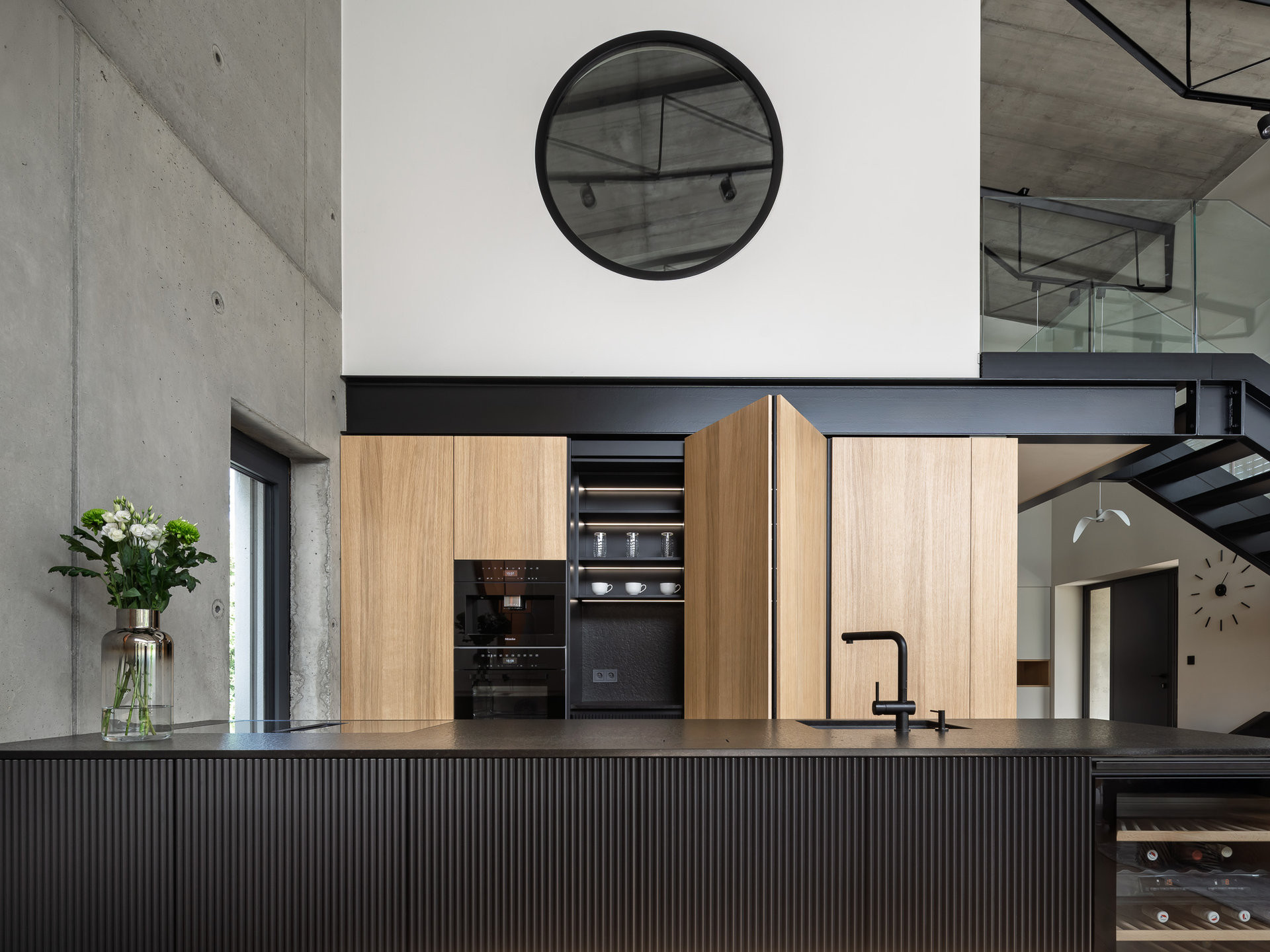 Býval zde sklad, dnes na jeho místě stojí rodinný dům. Industriální duch ale zůstal. Projevuje se v pohledových betonech i černých prvcích interiéru, zatímco textilie sem vnášejí pocit útulna.