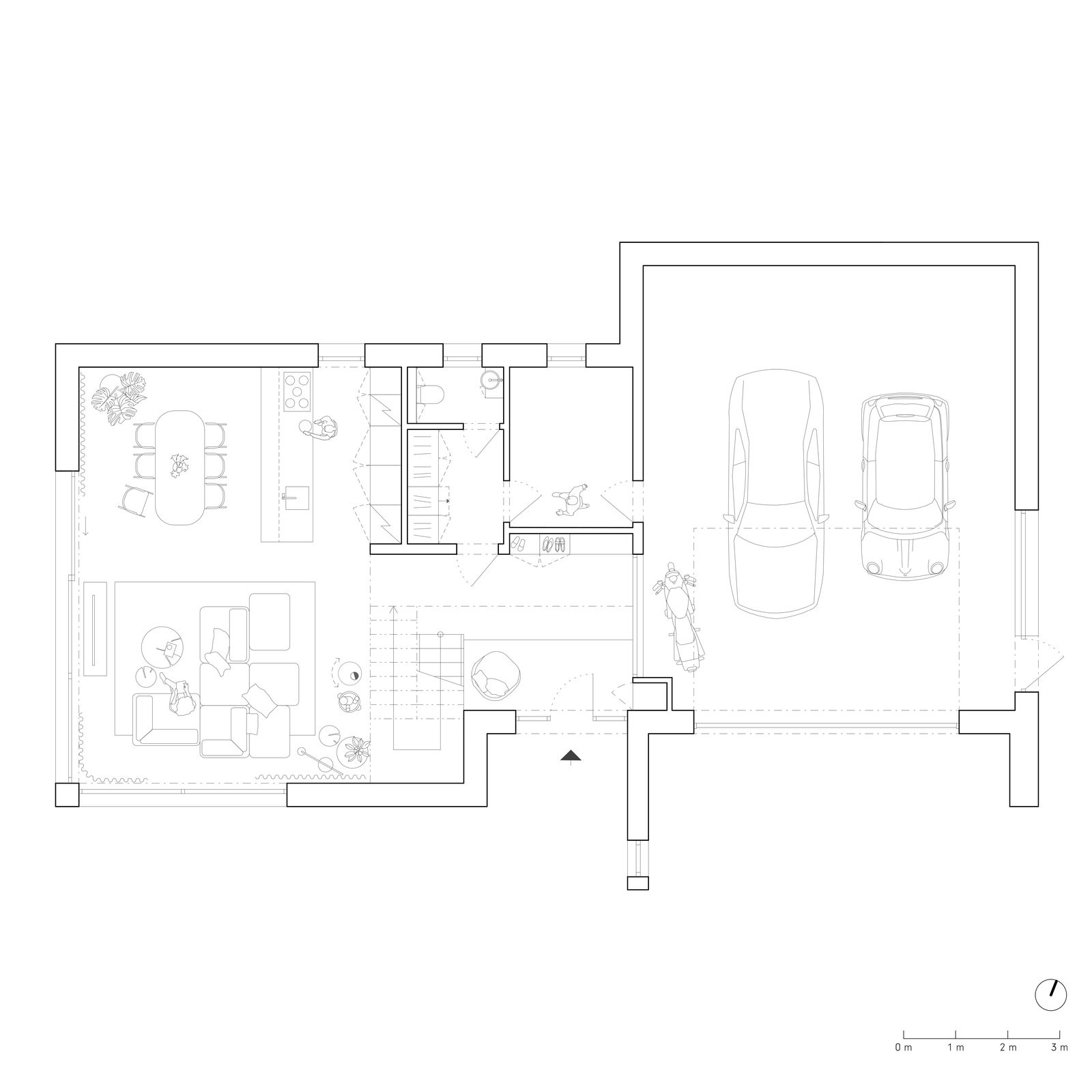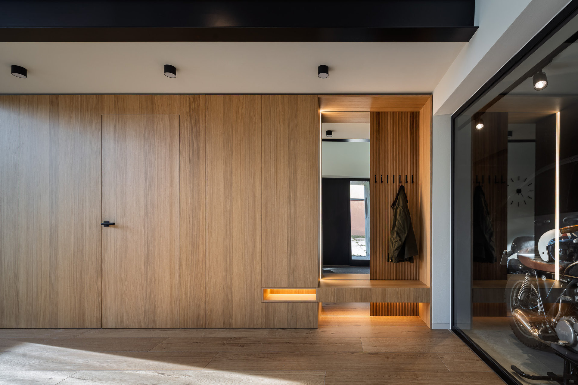 Nejde ovšem o garáž jako každou jinou – i její interiér je designérsky řešený a z předsíně je do něj vidět skrze velkoformátové prosklení. Pohled se sem otevírá dokonce i z gauče v obývacím pokoji.