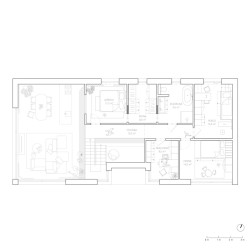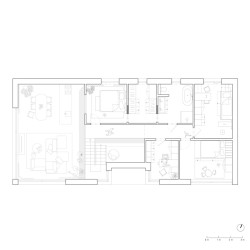 Bydlení má dvě podlaží. V přízemí se nachází hlavní obytný prostor s kuchyní, jehož výrazným specifikem je převýšení až pod střechu. Díky dvěma úrovním oken je prostor intenzivně zalitý přirozeným světlem. Barevné ladění interiéru je střídmé – černé prvky, jako jsou bočnice schodiště, krb, kuchyňský ostrůvek nebo kliky, souzní s industriální historií místa. Použité dekory dřeva naopak vnášejí do interiéru hřejivost.