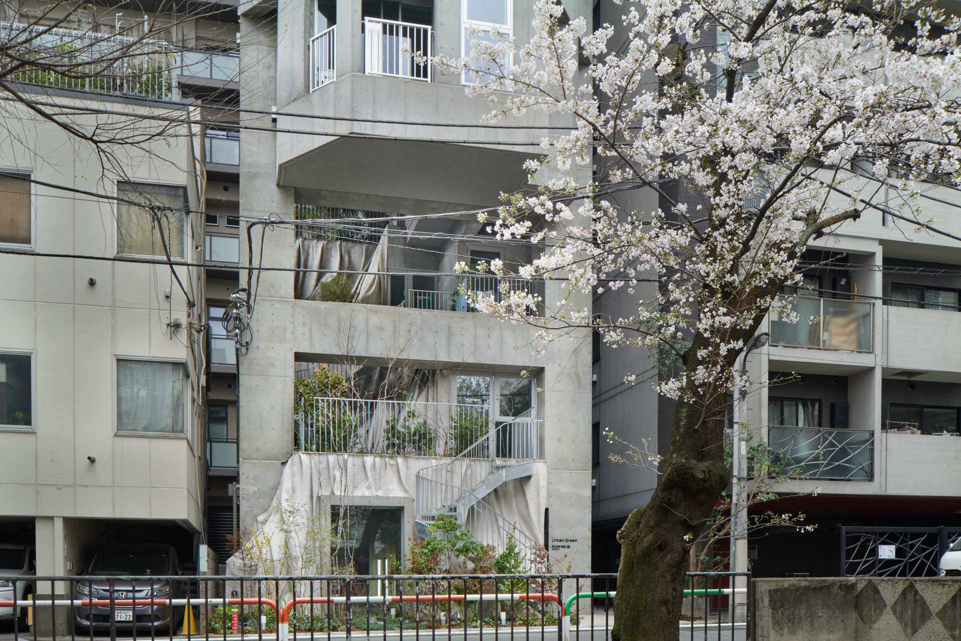 Elegantní železobetonový dům-hora má dva výrazné designové prvky. Jednak zvláštní velká na výšku orientovaná podlouhlá okna, která zajišťují dlouhý osvit v bytech. A především výraznou drapérii betonového vodopádu, který se valí z druhého patra otevřeným atriem domu až do přízemí, kde tvoří přední fasádu kolem vchodu do restaurace. Drapérie velmi hezky dotváří i interiér sdilených prostor v nižších poschodích. Hirata zde tento motiv a technologii použil vůbec poprvné.