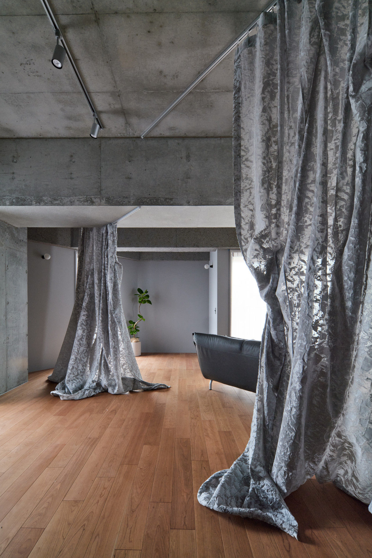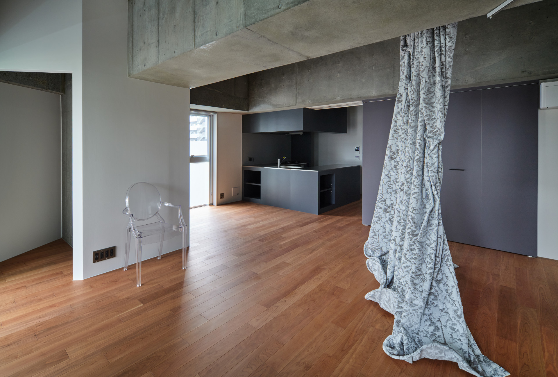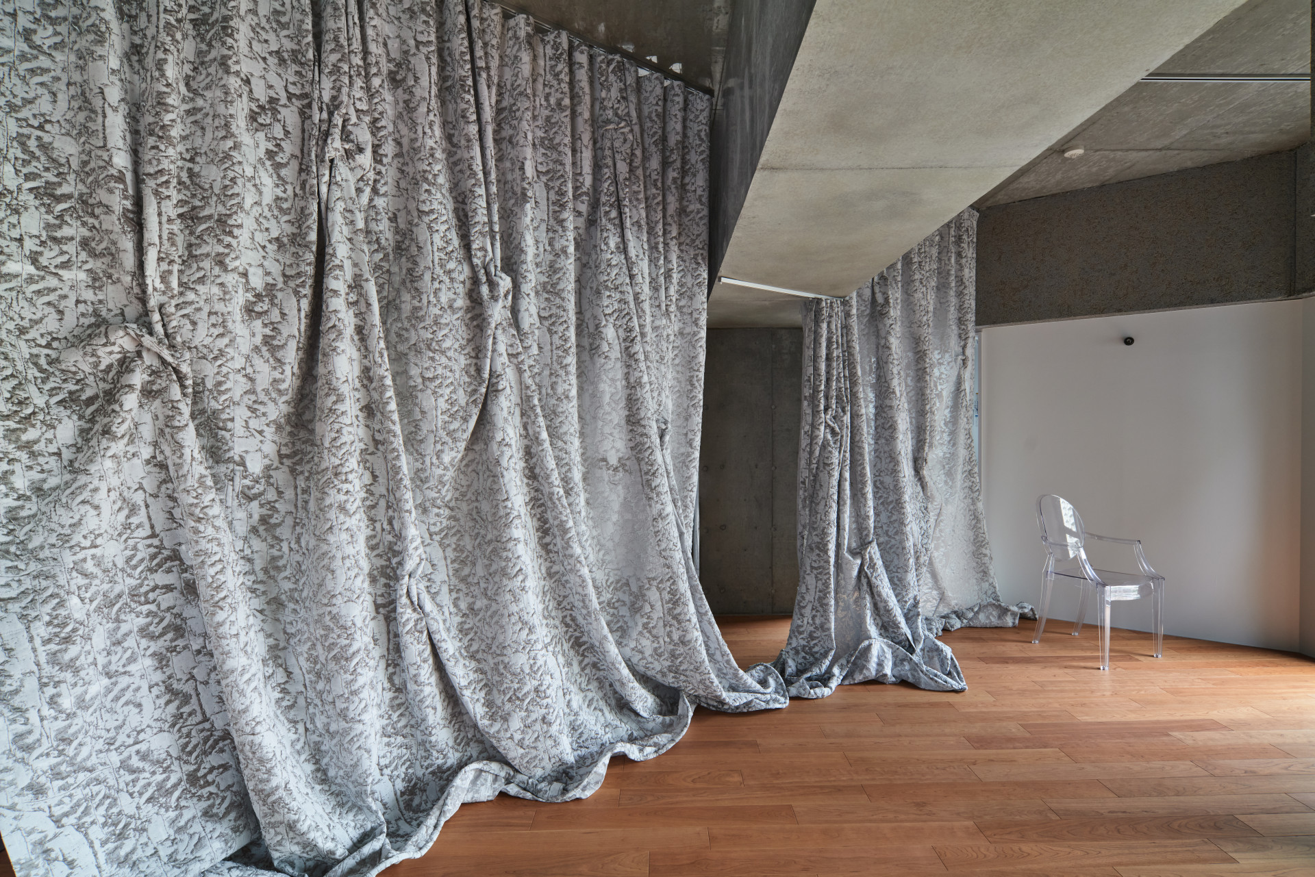 Kromě toho jsou tu byty různých velikostí – dům se totiž jako věž postupně sužuje. Mají otevřený půdorys a dají se libovolně přepažovat. Jak je možné s prostorem pracovat, to pan Takezawa demonstruje na vzorovém bytě - lze k tomu využít nábytek a také krásné originální závěsy od designérky Yóko Andóové.