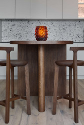 Kuchyně ve tvaru L je navržená s důrazem na logický provoz. Architekti si pohráli i s detaily každodennosti – například samostatným kávovým koutem s podsvícenými policemi, řešený jako příjemný rituální prvek pro uživatele bytu. Dominantou hlavní místnosti je masivní dubový ostrůvek s oblým zakončením a výraznou podnoží, který plní funkci pracovní plochy i jídelního stolu, u něhož se sedí na barovkách.