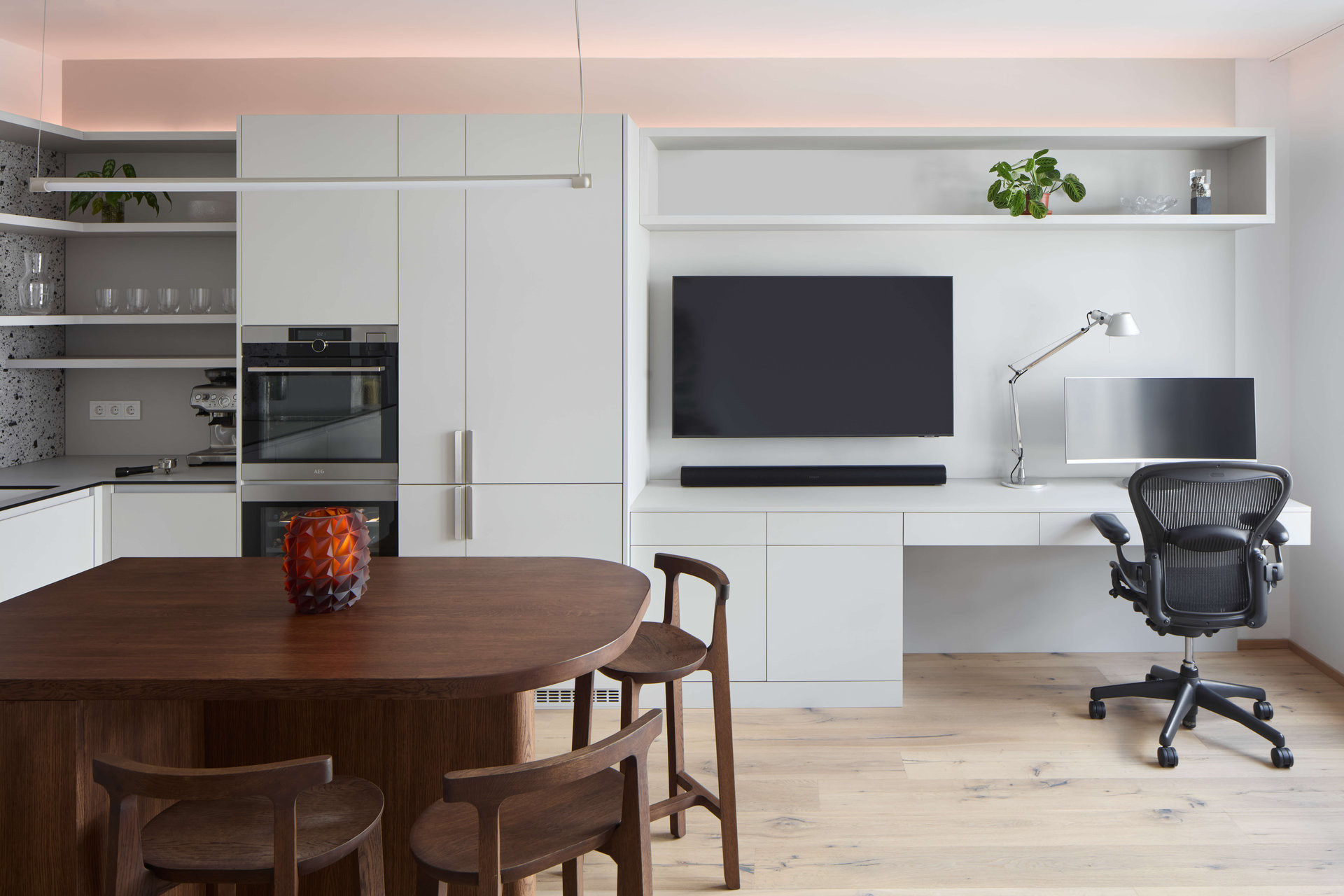 Architekti Adam Horn a Václav Páník z ateliéru PANIKHORN založili koncepci interiéru na jediné, pečlivě modelované nábytkové sestavě, která se vine bytem od předsíně až do hlavního obytného prostoru. Tato sestava neslouží pouze jako úložný systém, současně plní roli prostorové kostry, která strukturuje členění bytu, integruje kuchyň, obývací část i pracovní kout. Mezi horní hranou sestavy a stropem vzniká záměrně volný pruh, který opticky odlehčuje hmotu nábytku a zvyšuje vnímání výšky místnosti. Atmosféru dále podporuje ambientní osvětlení – jemně akcentuje celek a umožňuje měnit náladu prostoru během dne.